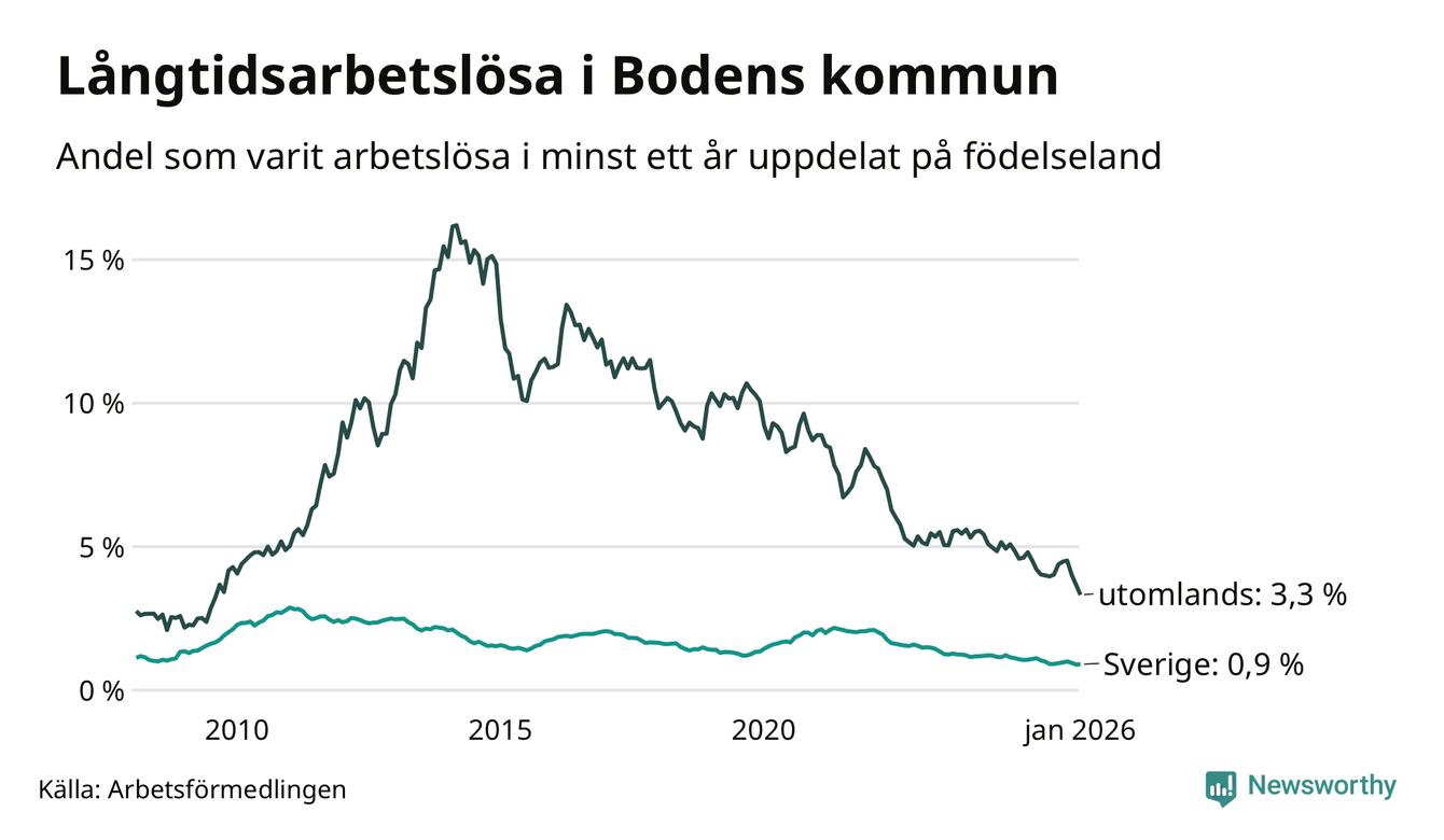 106 av de långtidsarbetslösa i Boden är födda i Sverige, medan 72 är födda utomlands. Det innebär att långtidsarbetslösheten bland Sverigefödda är 0,9 procent, medan den är fyra gånger så hög – 3,3 procent – bland födda utomlands. Även i riket som helhet är arbetslösheten högre bland utrikesfödda.