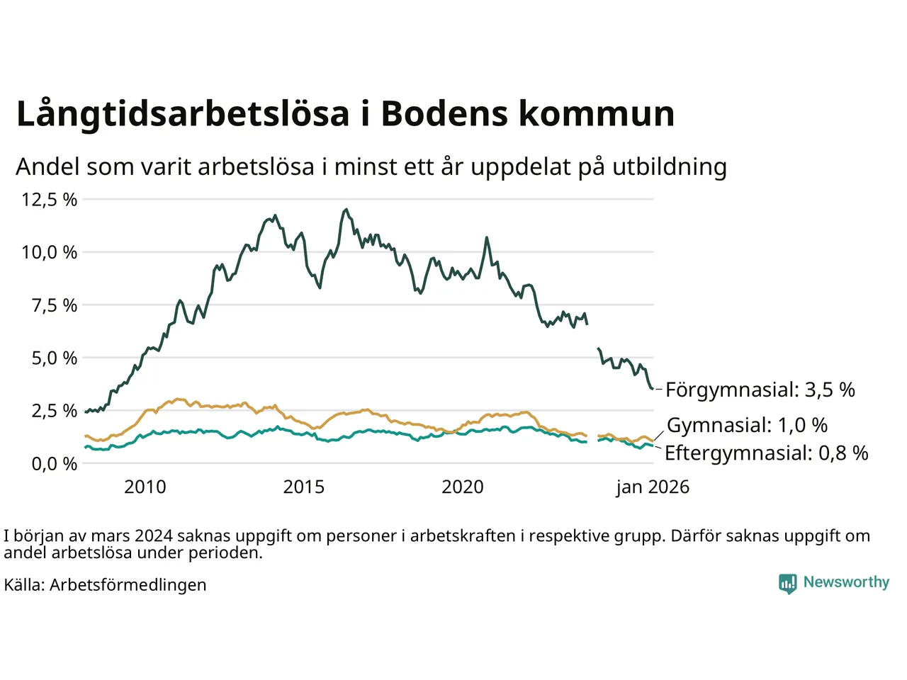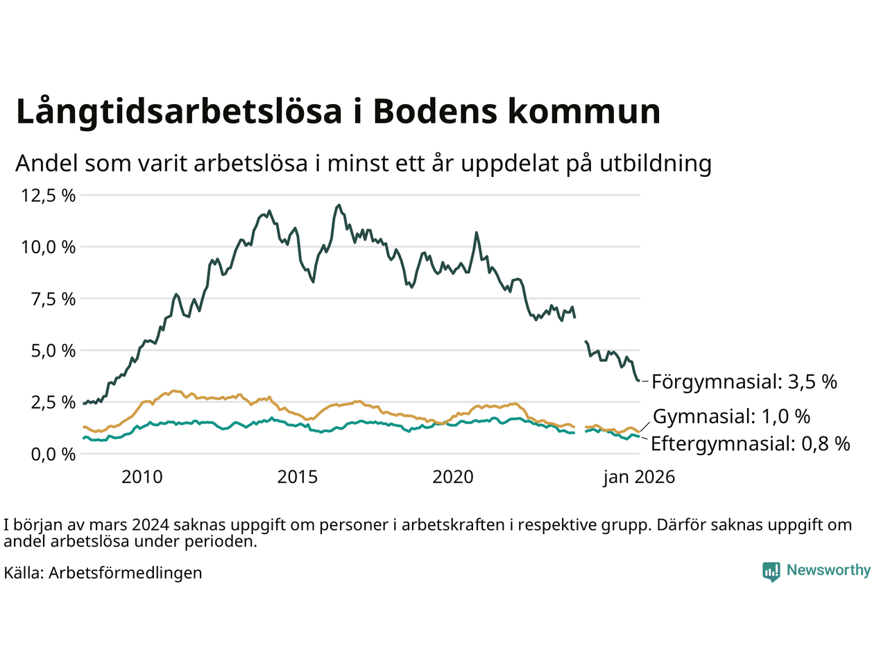 Graf: Andel arbetslösa i Boden som varit utan arbete i minst 12 månader