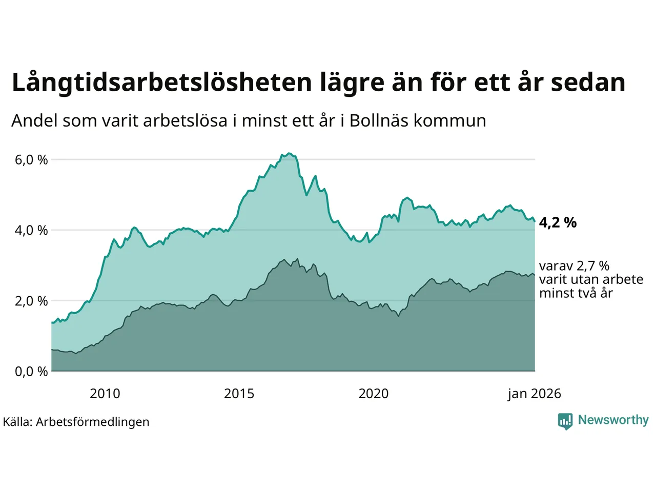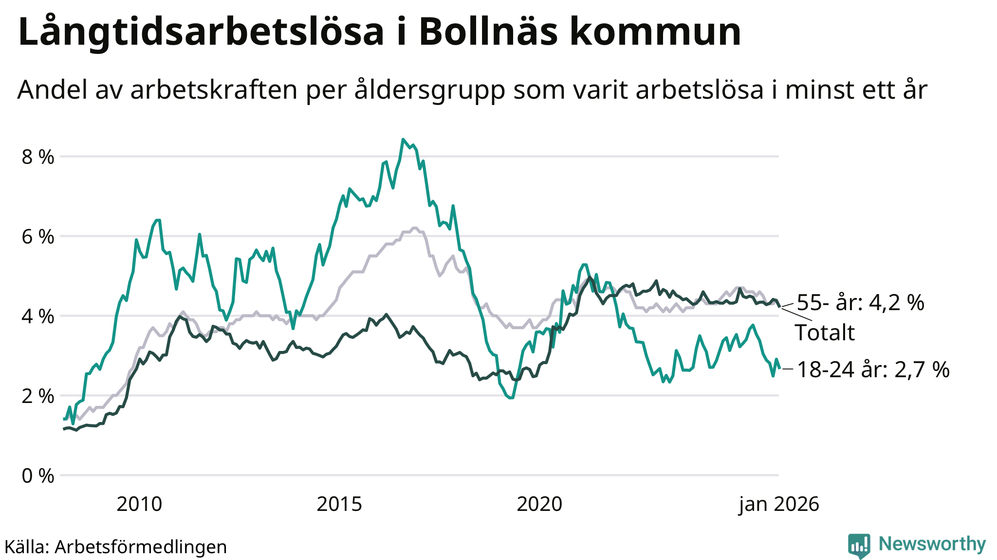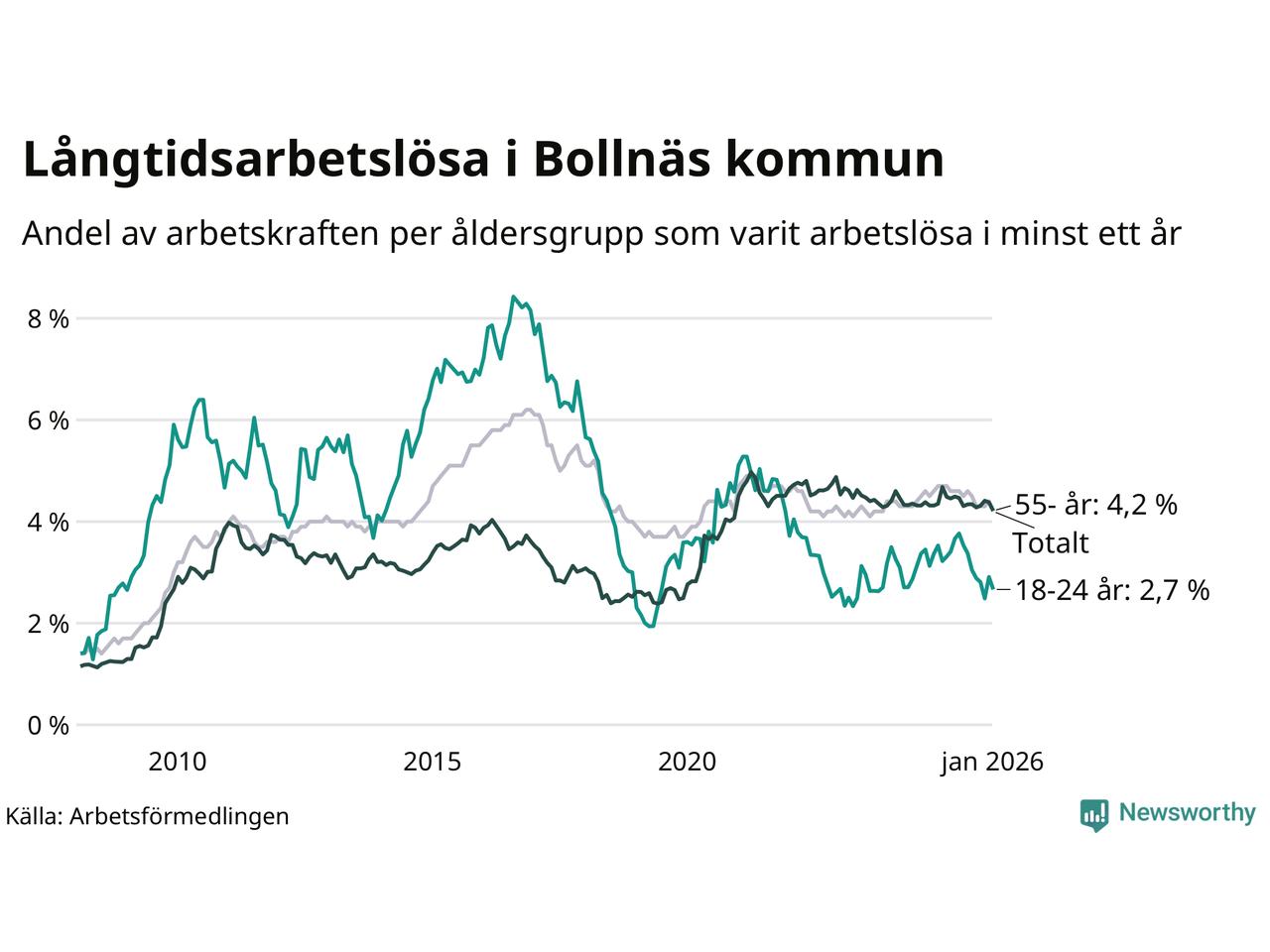 | Andel arbetslösa i minst ett år | 4,2 % | 3,8 % | 2,9 % |