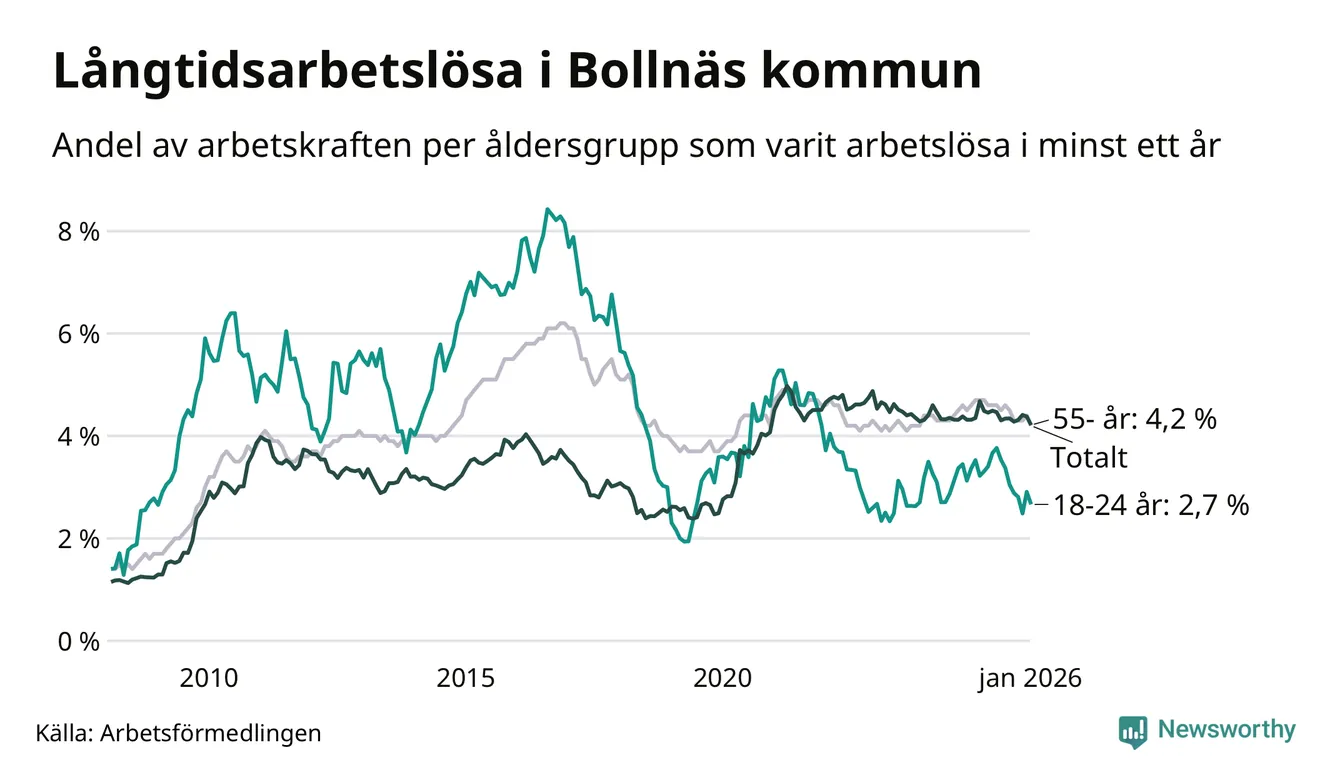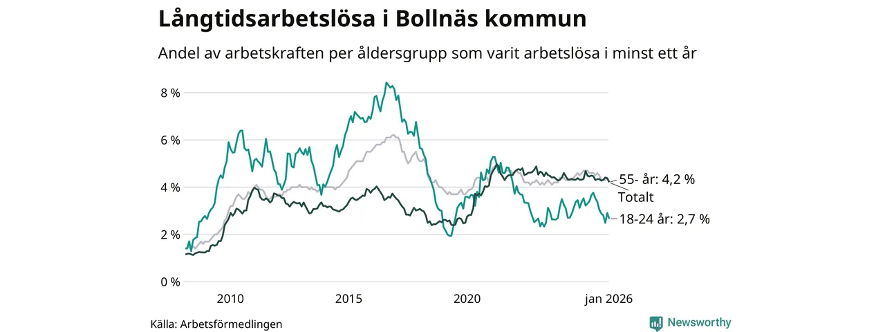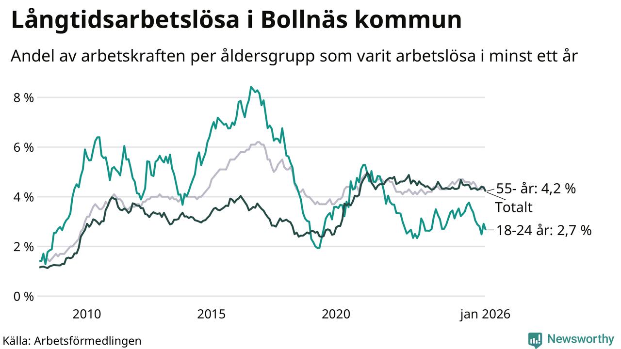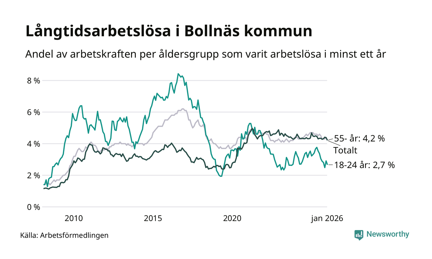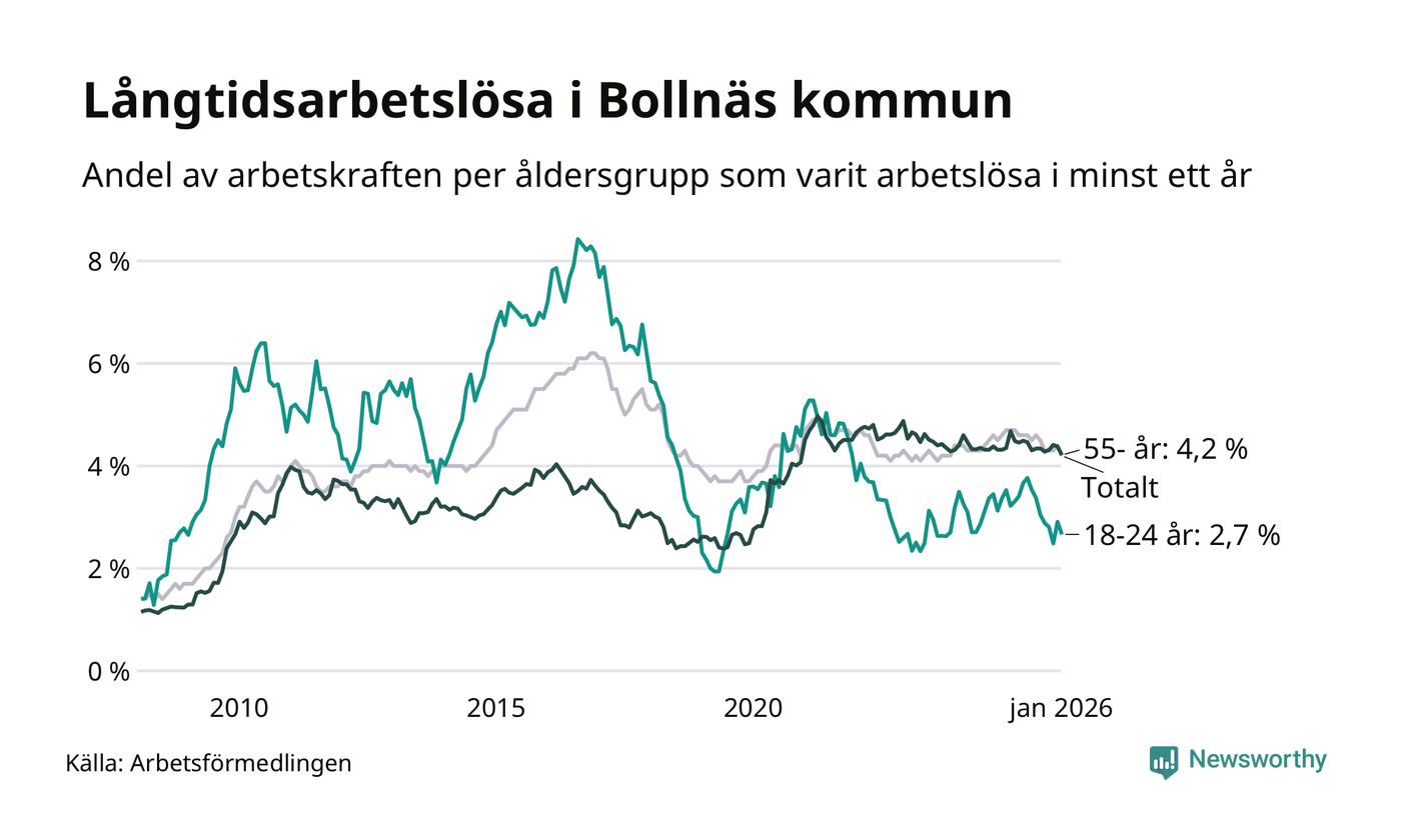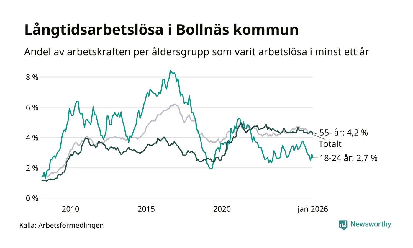 Av de 514 personerna som varit arbetslösa i mer än ett år i Bollnäs kommun är 127 personer mellan 55 och 661 år och 32 är mellan 18 och 24 år. För den äldre gruppen är andelen arbetslösa 4,2 procent medan den i den yngre gruppen är 2,7 procent. Även i riket som helhet är långtidsarbetslösheten högre i gruppen äldre.