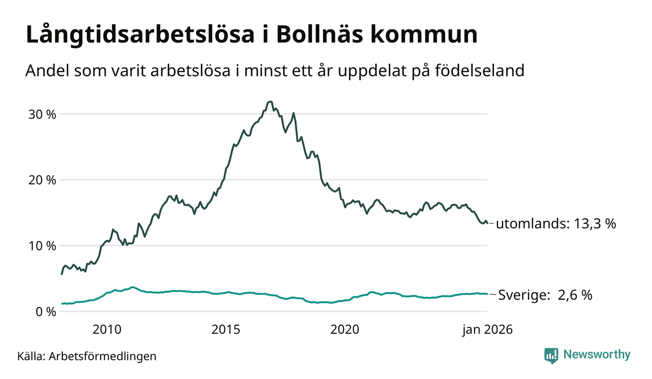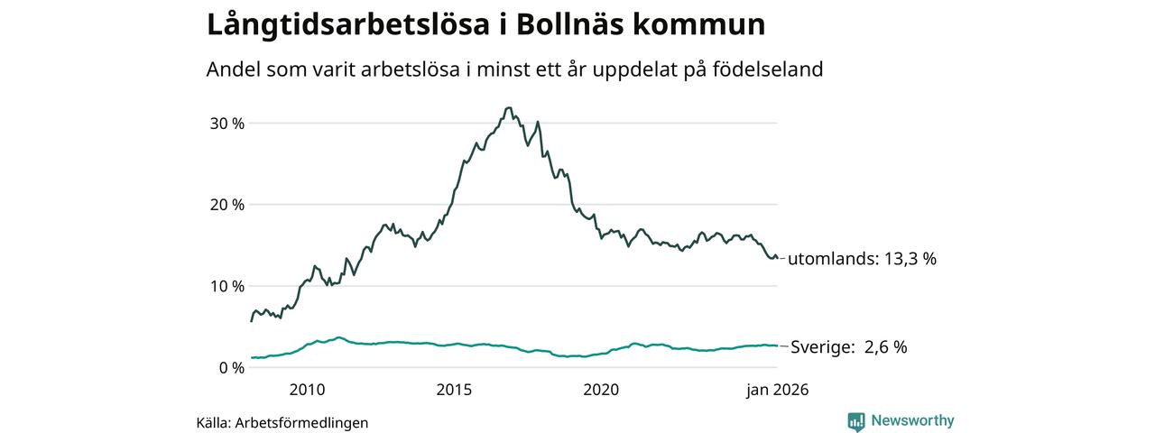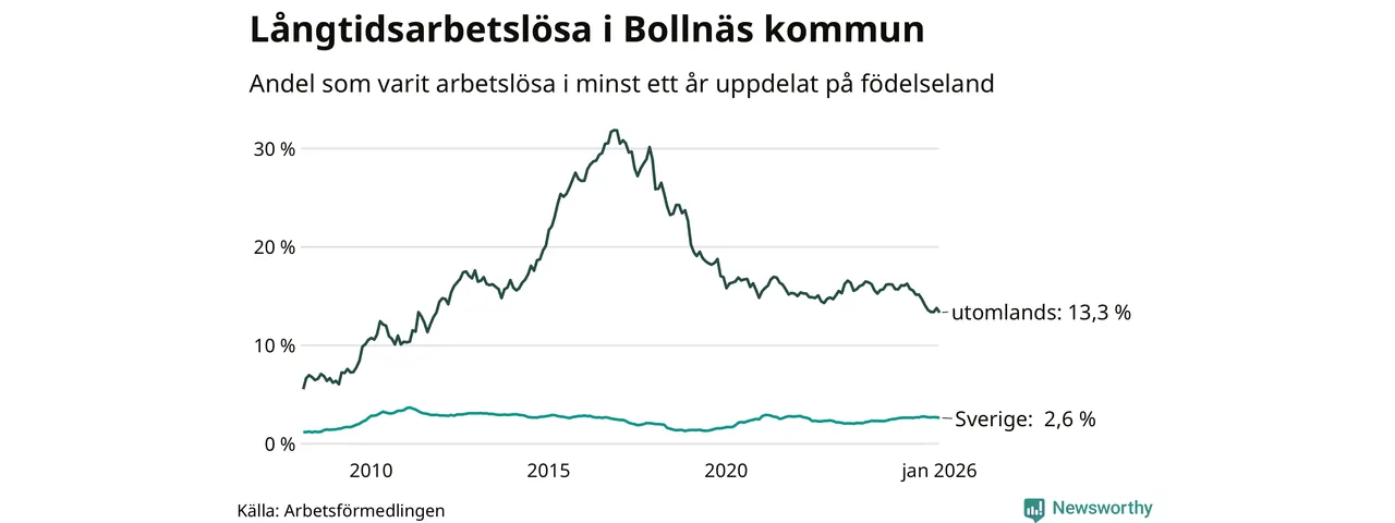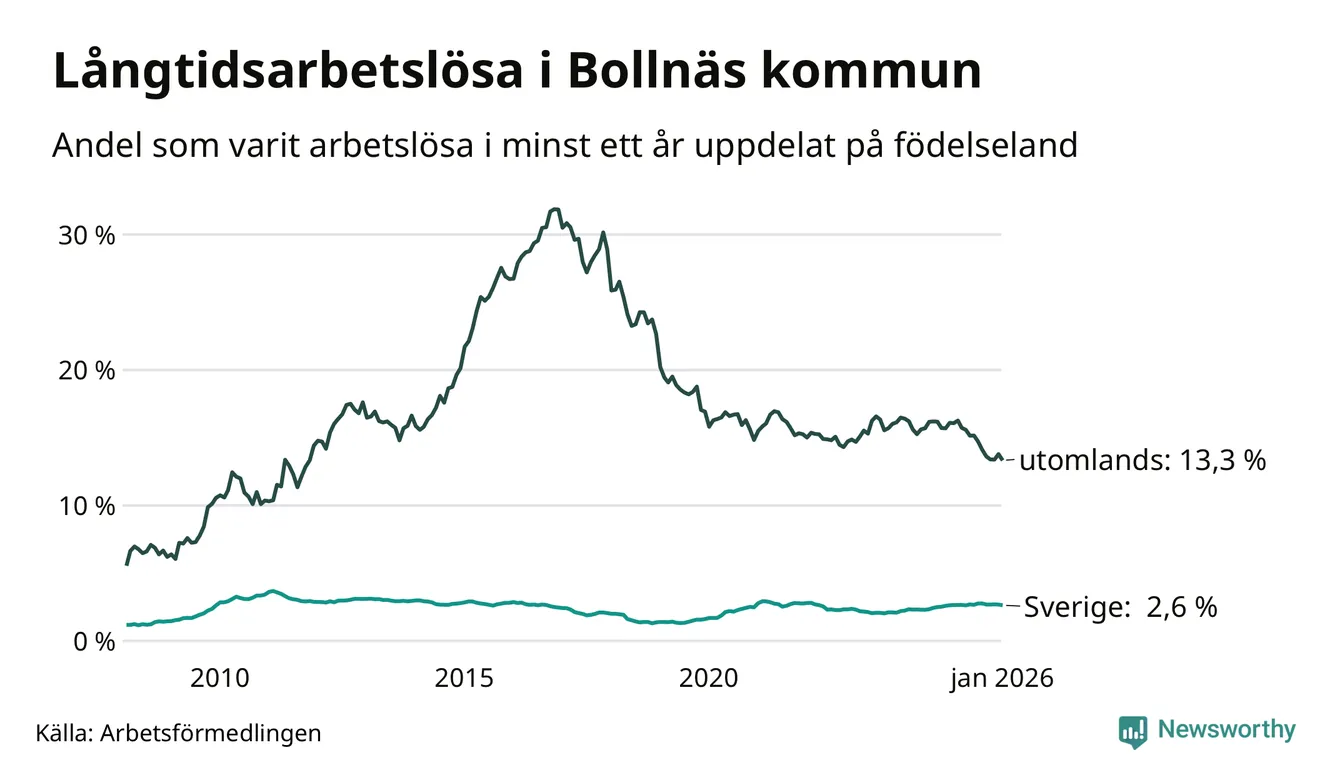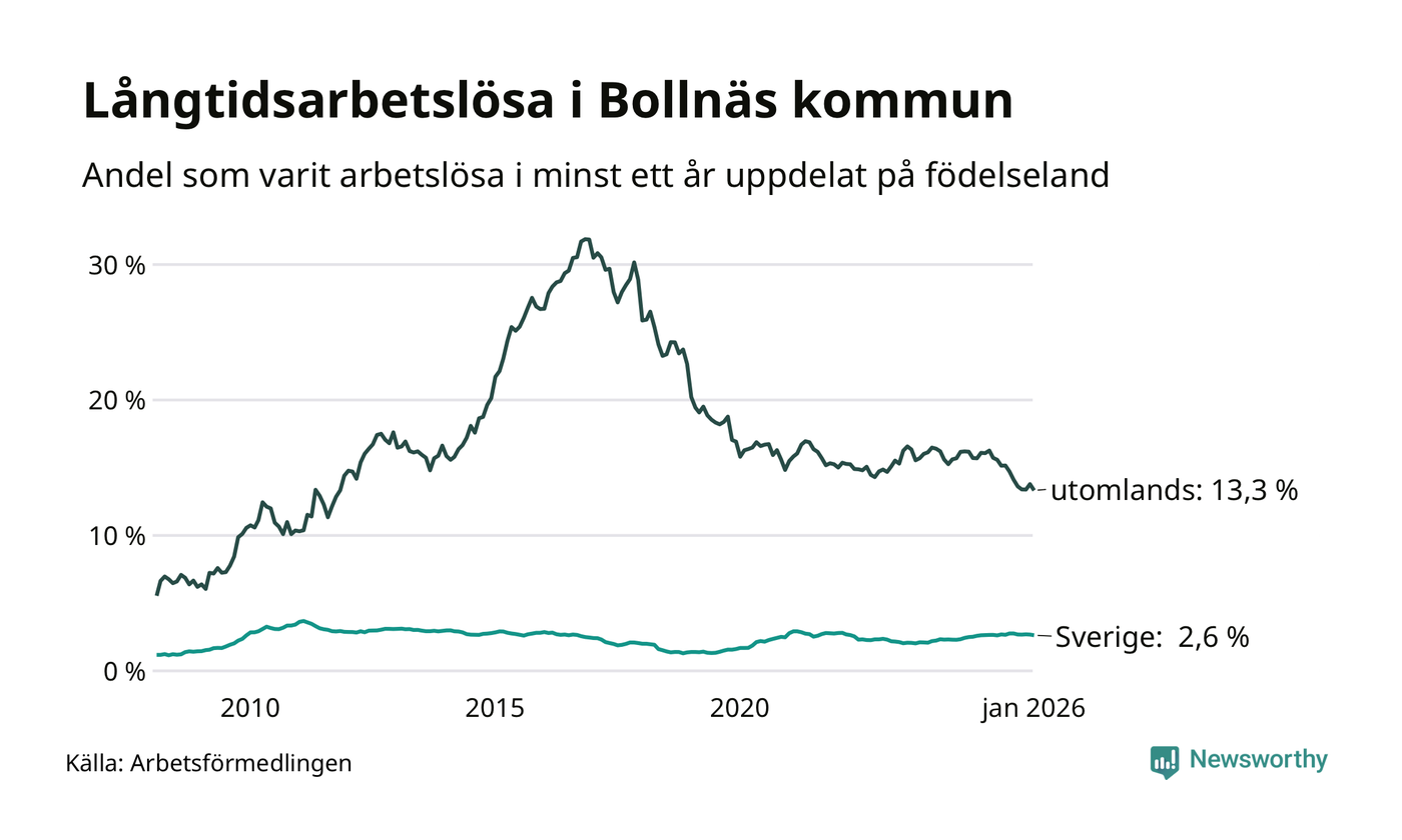 272 av de långtidsarbetslösa i Bollnäs är födda i Sverige, medan 242 är födda utomlands. Det innebär att långtidsarbetslösheten bland Sverigefödda är 2,6 procent, medan den är fem gånger så hög – 13,3 procent – bland födda utomlands. Även i riket som helhet är arbetslösheten högre bland utrikesfödda.