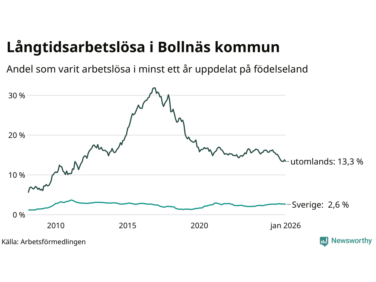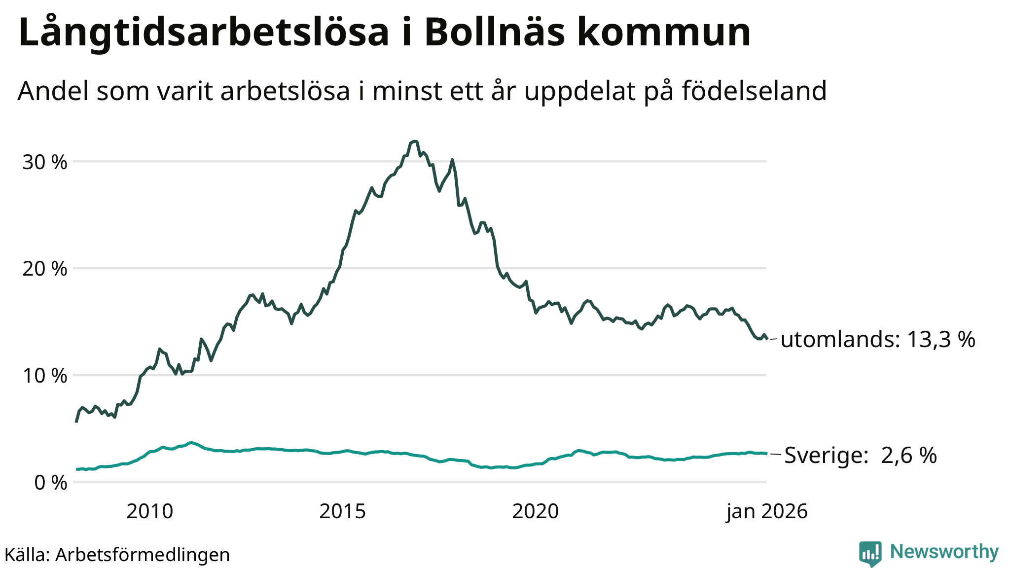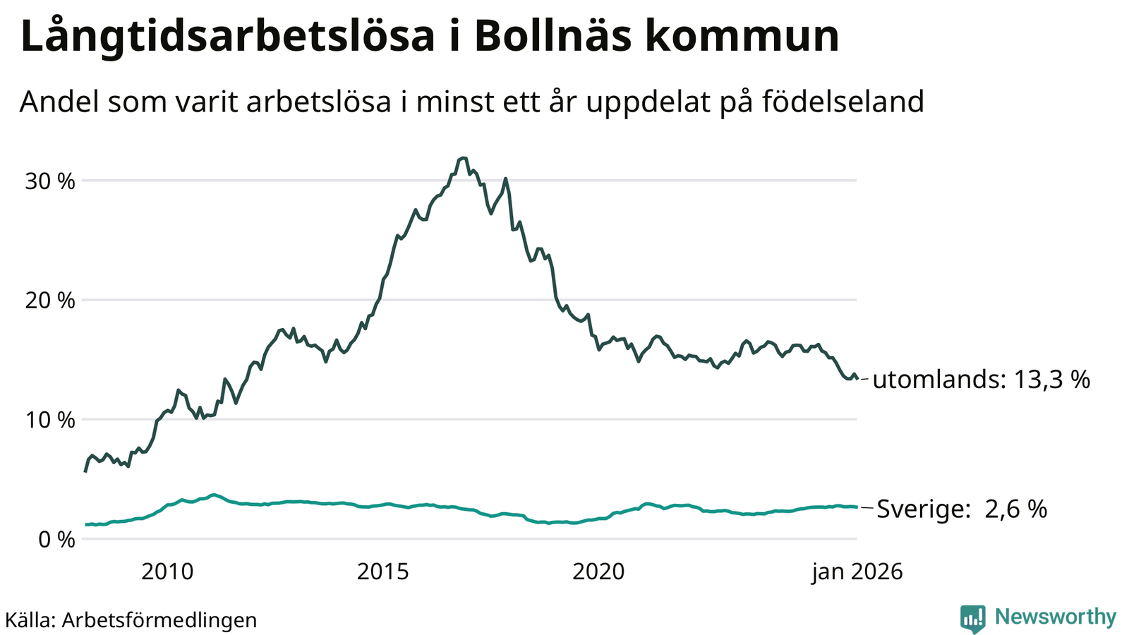 272 av de långtidsarbetslösa i Bollnäs är födda i Sverige, medan 242 är födda utomlands. Det innebär att långtidsarbetslösheten bland Sverigefödda är 2,6 procent, medan den är fem gånger så hög – 13,3 procent – bland födda utomlands. Även i riket som helhet är arbetslösheten högre bland utrikesfödda.
