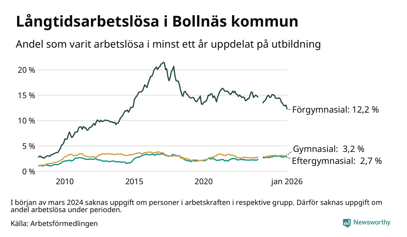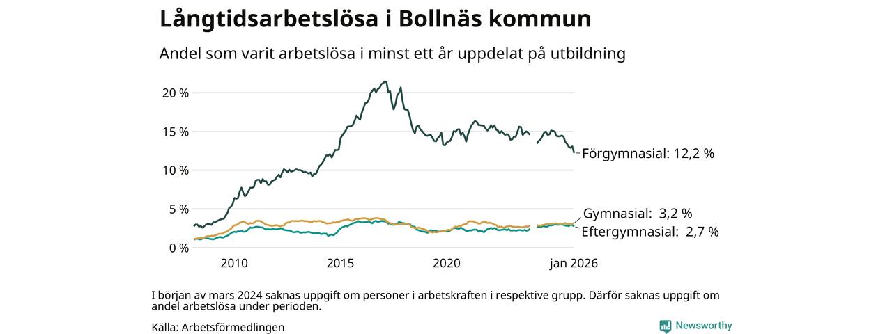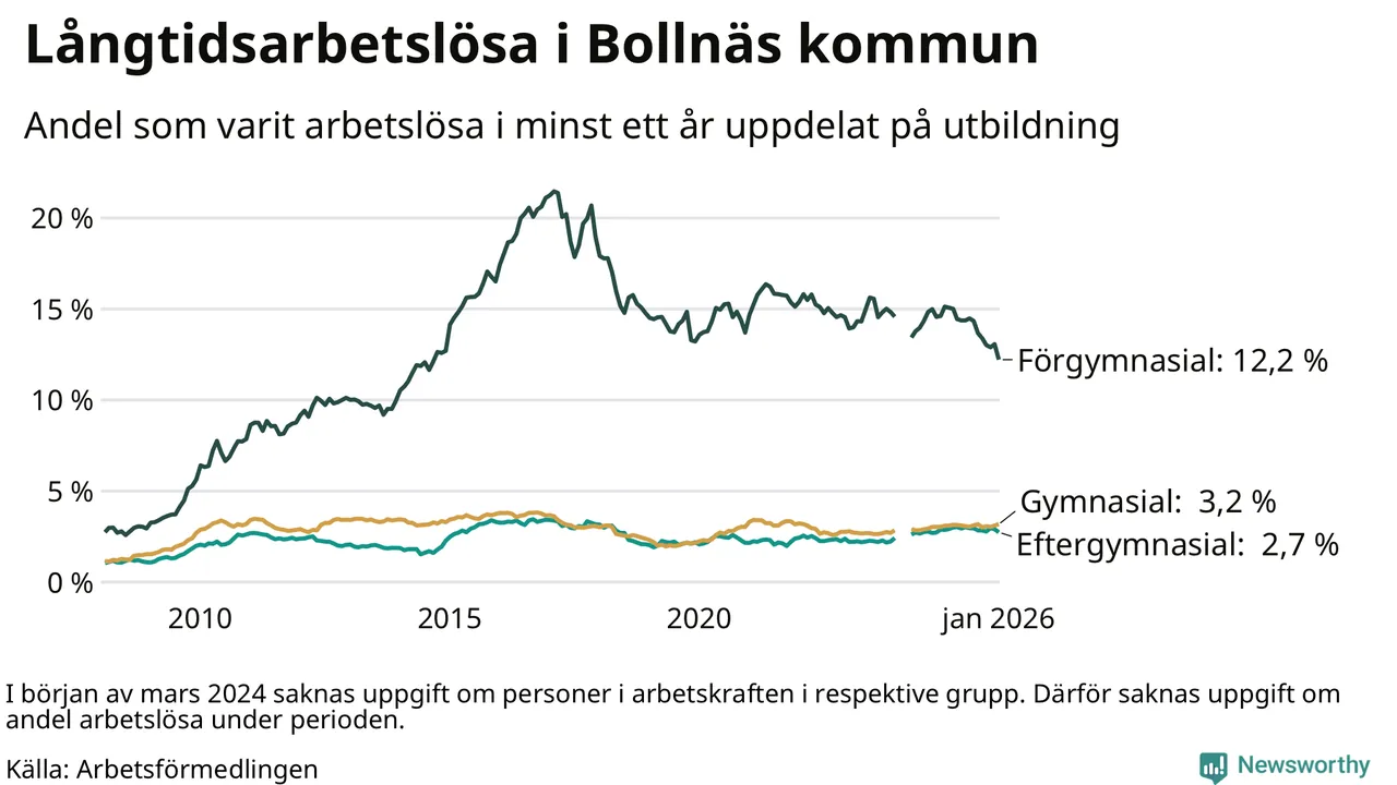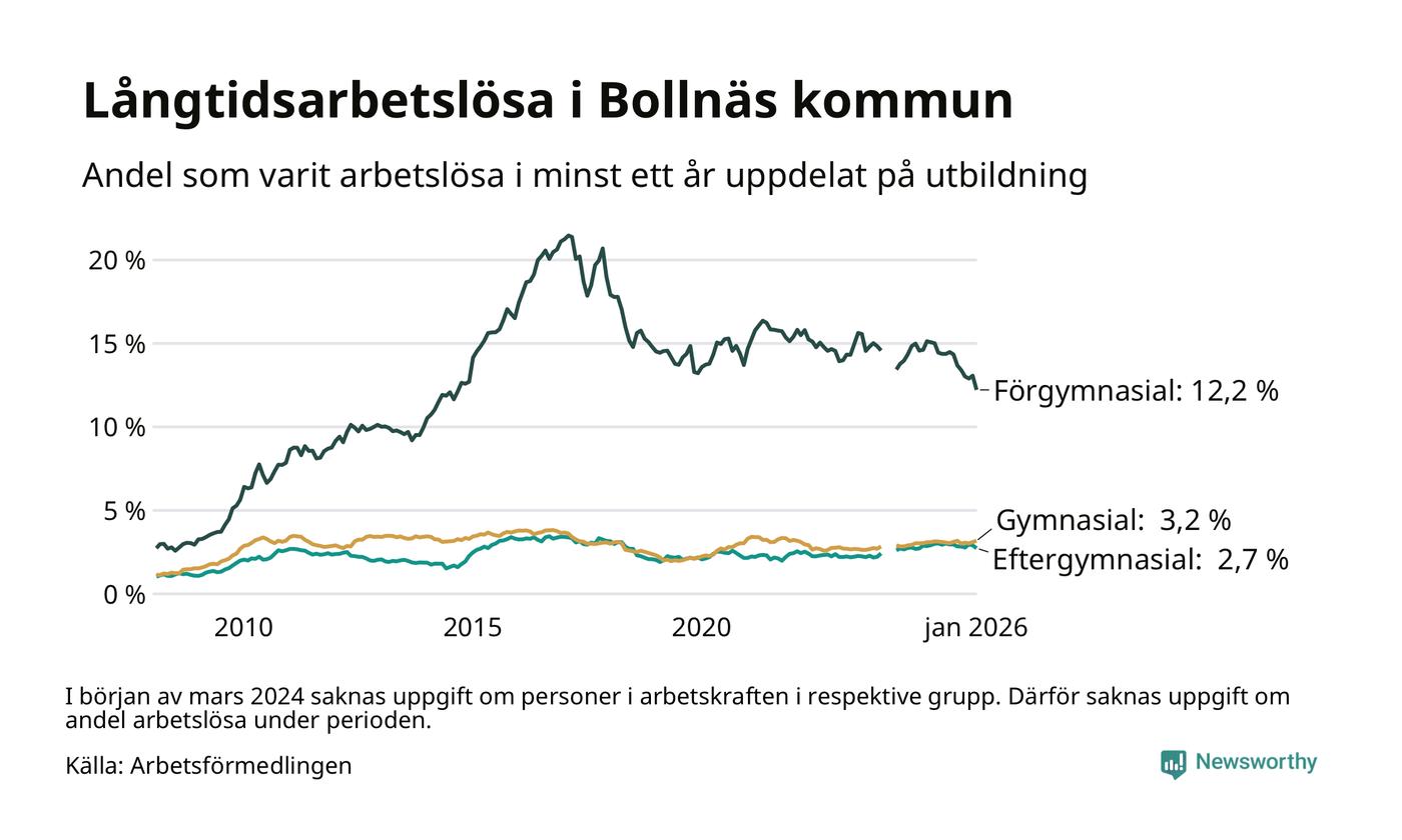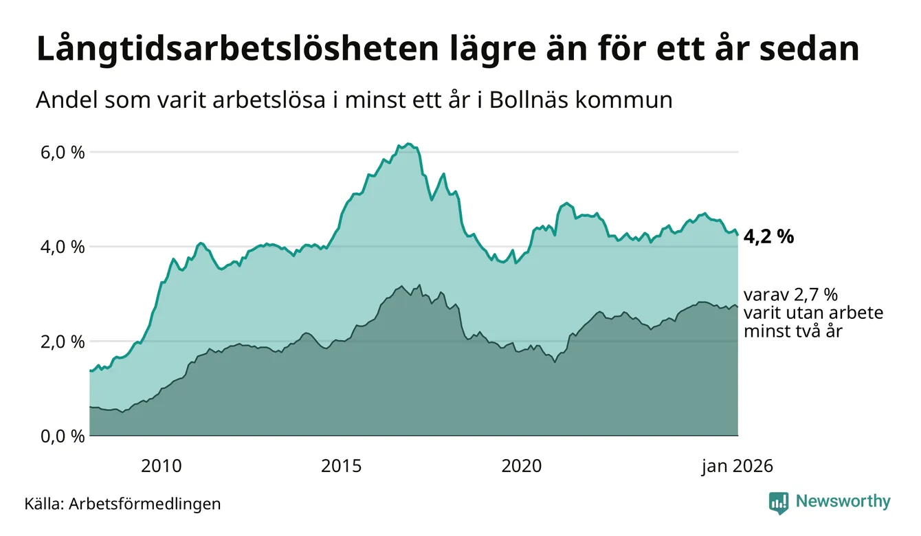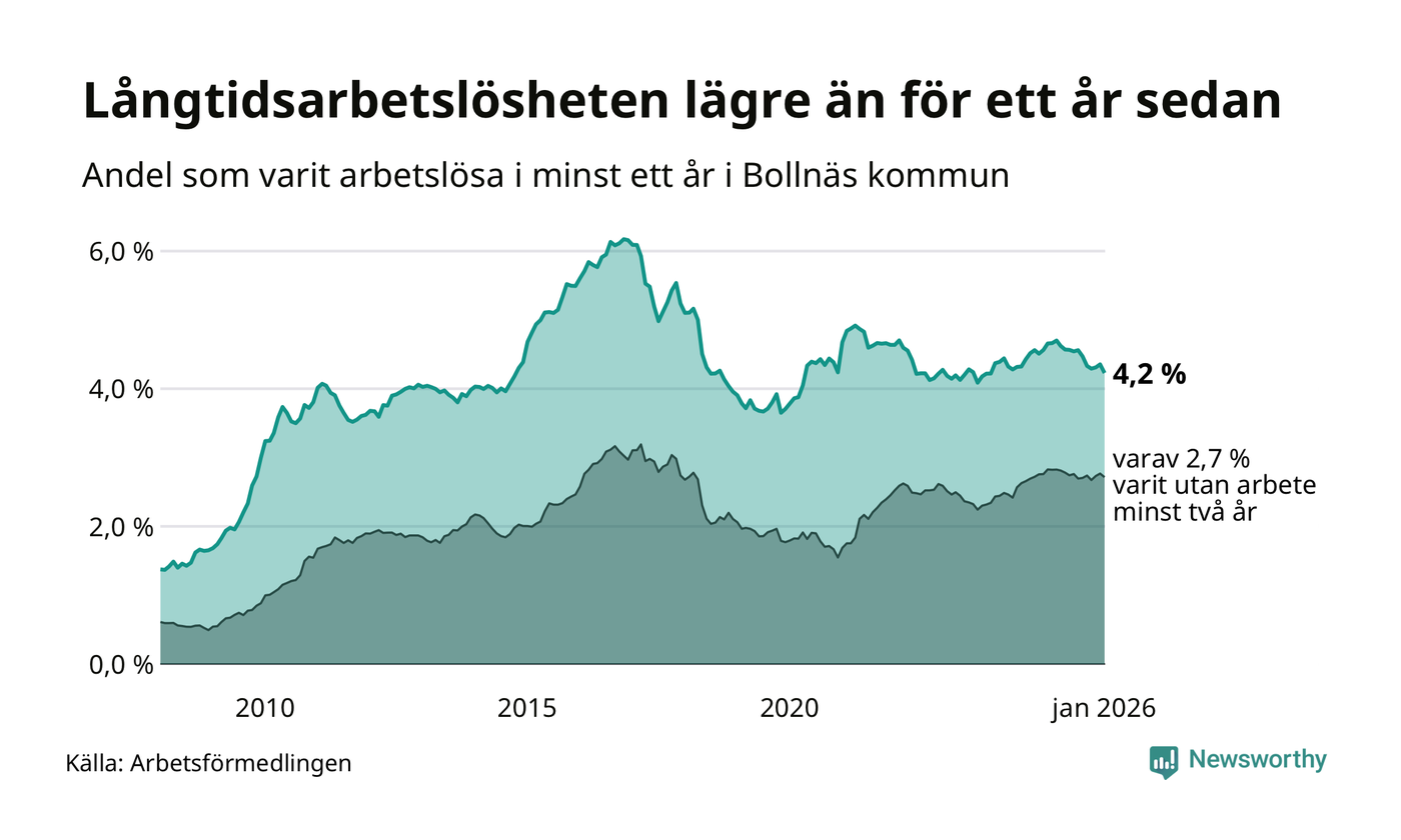 I januari hade 514 Bollnäsbor varit arbetslösa i minst ett år, vilket är tio färre än månaden innan. 514 personer motsvarar 4,2 procent av arbetskraften i kommunen – andelen långtidsarbetslösa är 0,5 procentenheter lägre än samma månad för ett år sedan. Bollnäs tillhör de kommuner som har högst andel långtidsarbetslösa i hela landet just nu.