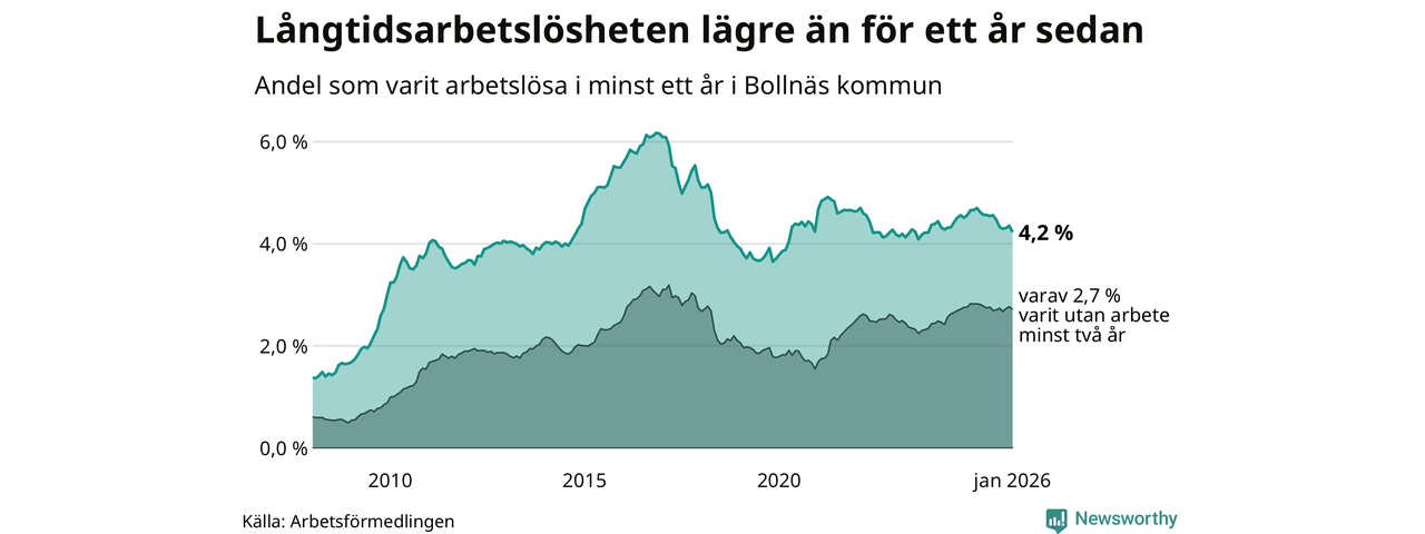 Antalet som står allra längst från arbetsmarknaden – som varit utan arbete utan i minst två år – har minskat jämfört med samma månad för ett år sedan: från 342 till 330, eller 2,7 procent av arbetskraften i januari 2026.