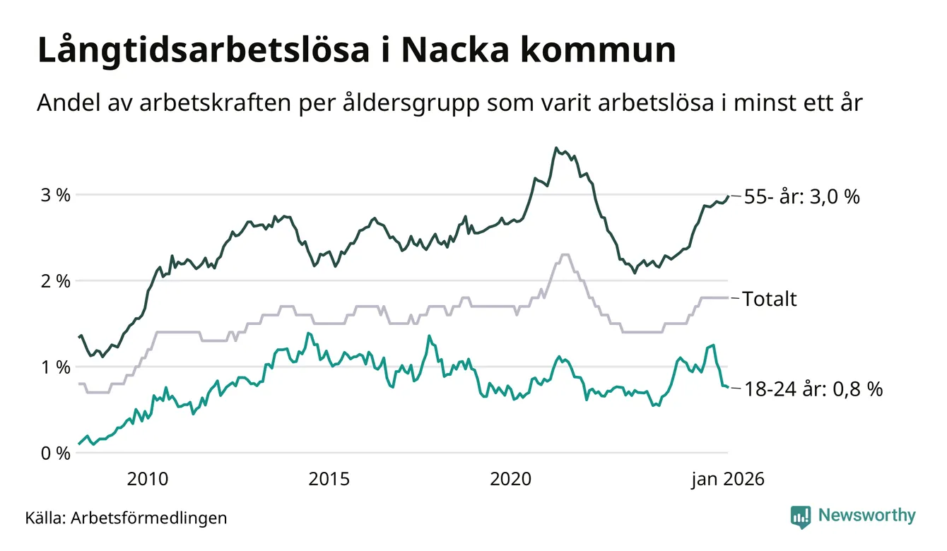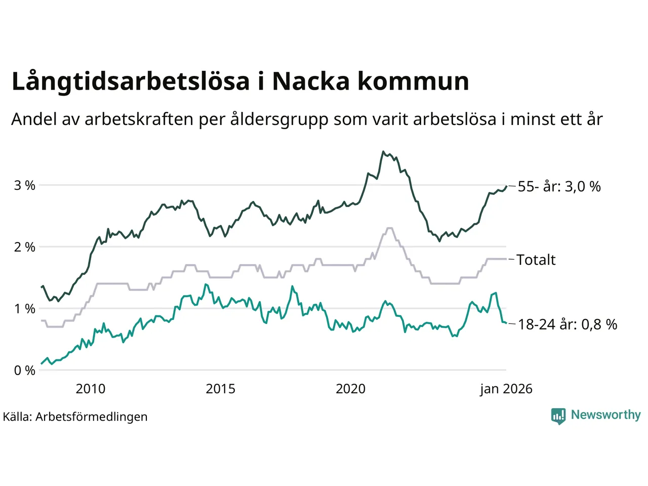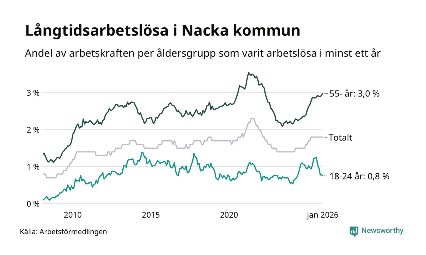Av de 1 049 personerna som varit arbetslösa i mer än ett år i Nacka kommun är 360 personer mellan 55 och 661 år och 38 är mellan 18 och 24 år. För den äldre gruppen är andelen arbetslösa 3,0 procent medan den i den yngre gruppen är 0,8 procent. Även i riket som helhet är långtidsarbetslösheten högre i gruppen äldre.