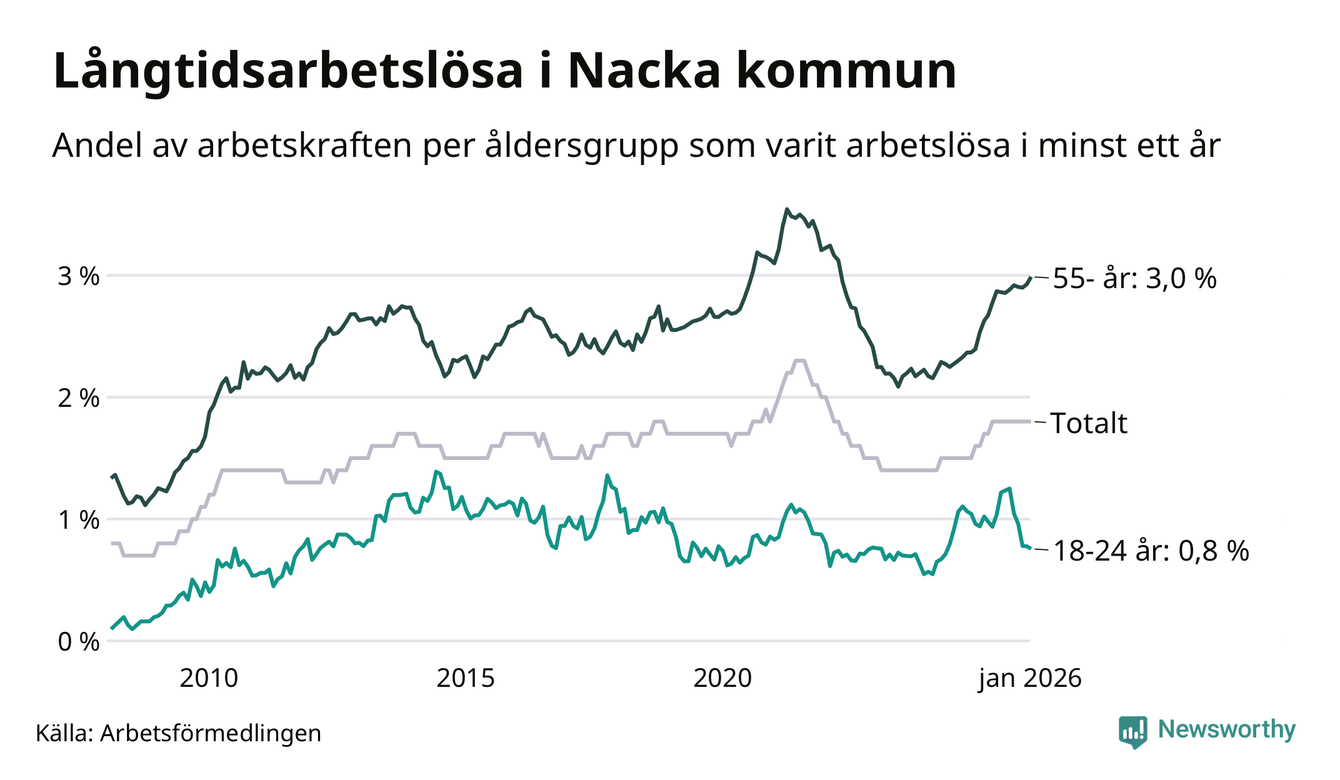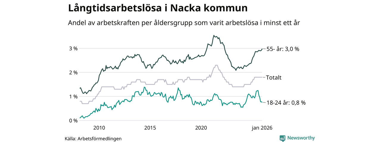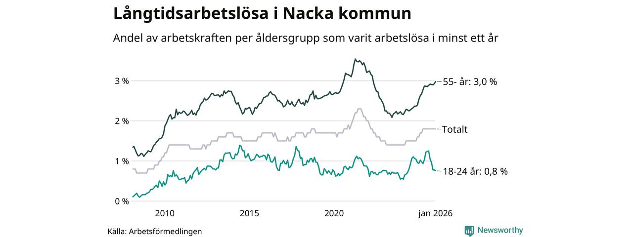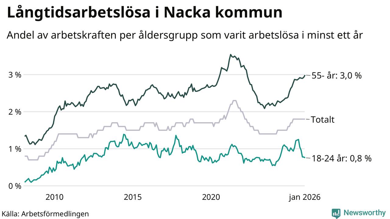 Av de 1 049 personerna som varit arbetslösa i mer än ett år i Nacka kommun är 360 personer mellan 55 och 661 år och 38 är mellan 18 och 24 år. För den äldre gruppen är andelen arbetslösa 3,0 procent medan den i den yngre gruppen är 0,8 procent. Även i riket som helhet är långtidsarbetslösheten högre i gruppen äldre.