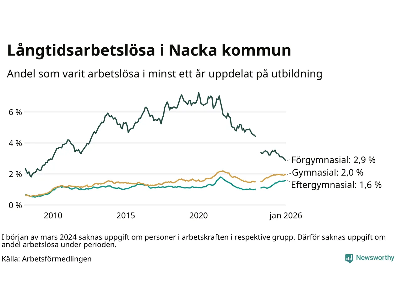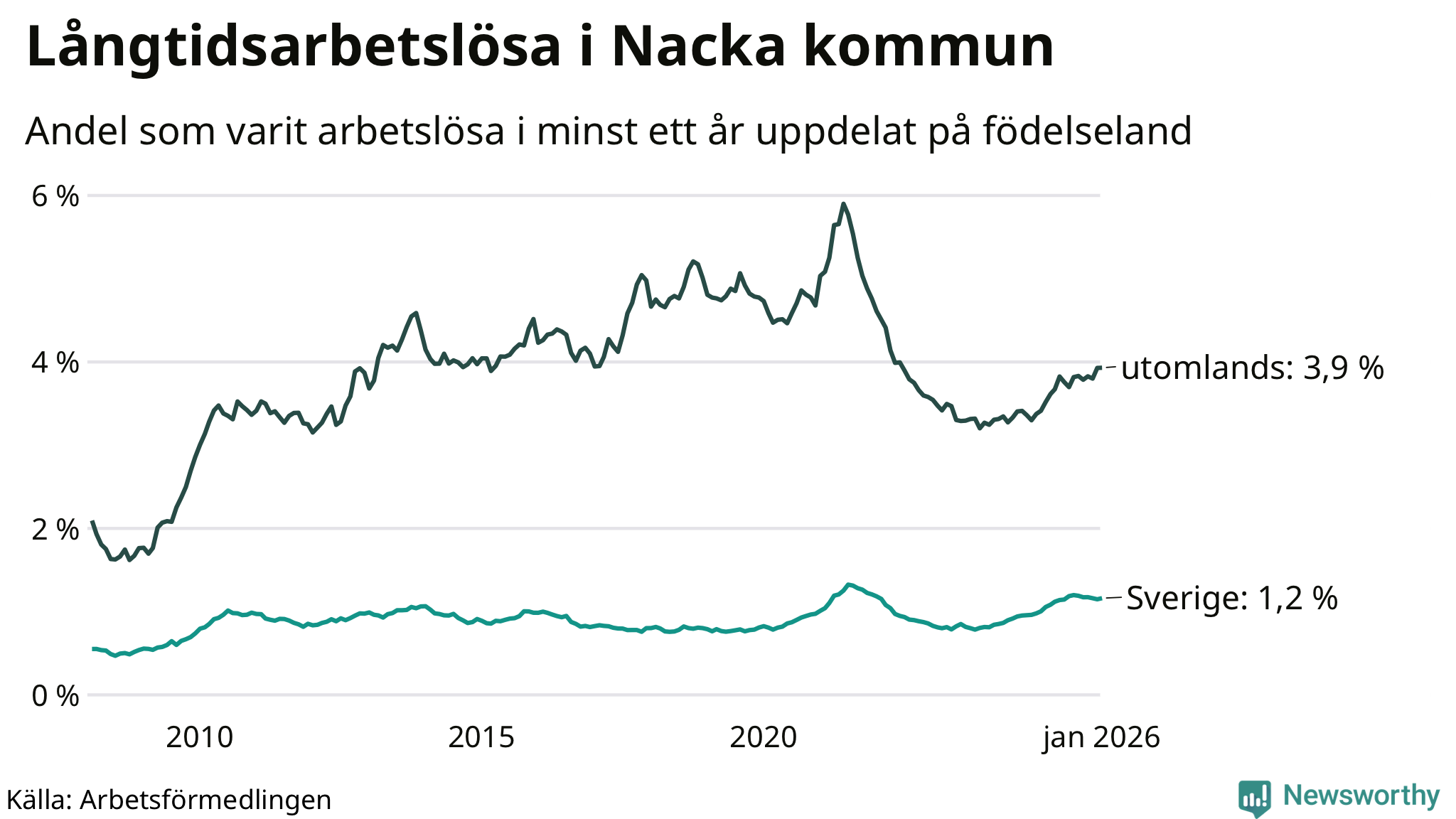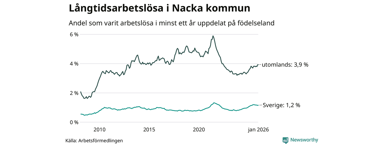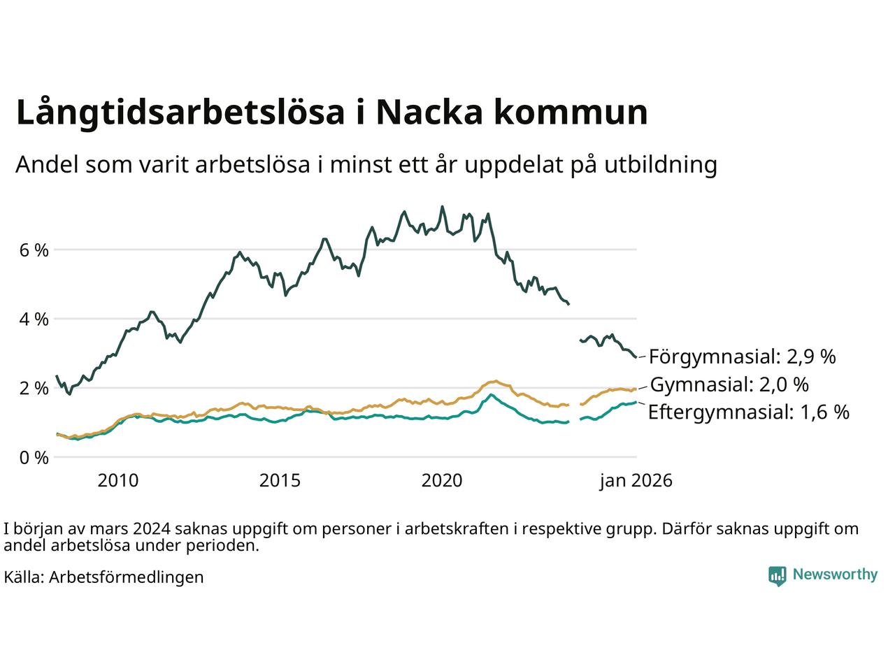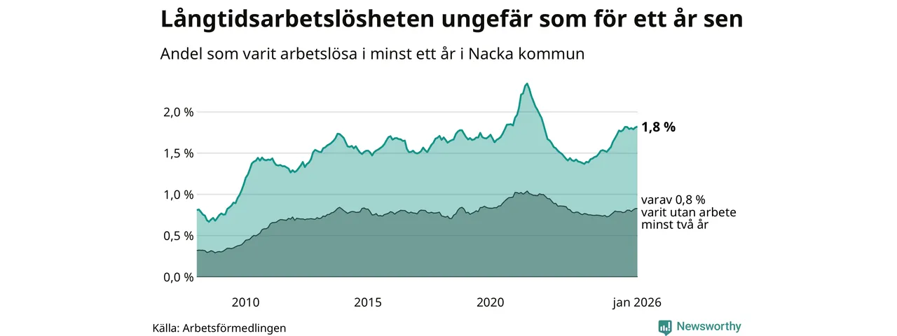 I januari hade 1 049 Nackabor varit arbetslösa i minst ett år, vilket är 16 fler än månaden innan. 1 049 personer motsvarar 1,8 procent av arbetskraften i kommunen – andelen långtidsarbetslösa är ungefär på samma nivå som för ett år sedan.