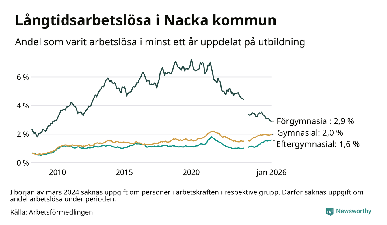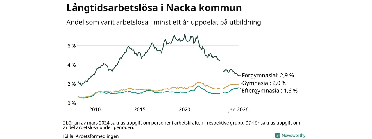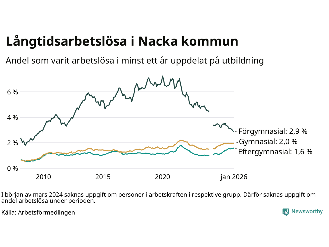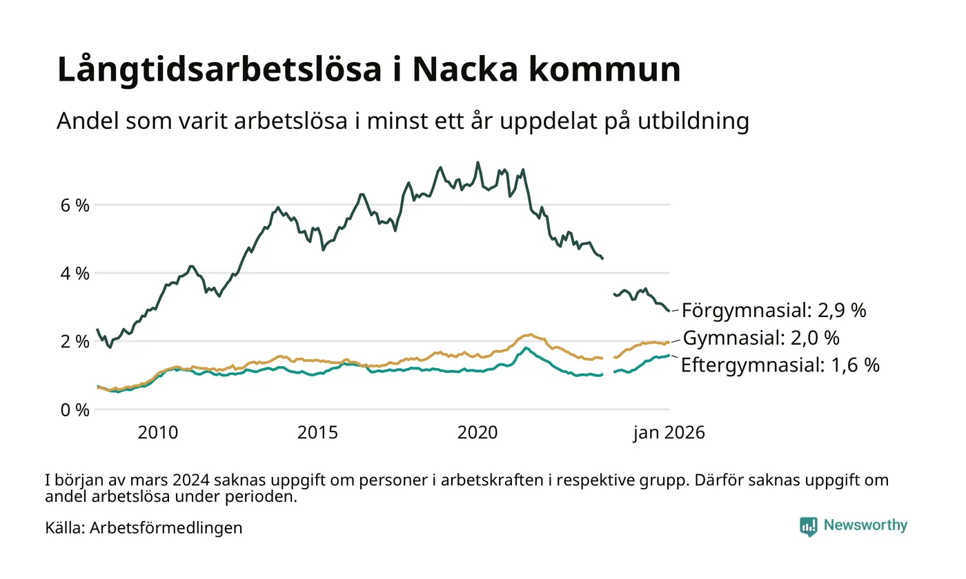I januari hade 1 049 Nackabor varit arbetslösa i minst ett år, vilket är 16 fler än månaden innan. 1 049 personer motsvarar 1,8 procent av arbetskraften i kommunen – andelen långtidsarbetslösa är ungefär på samma nivå som för ett år sedan.
