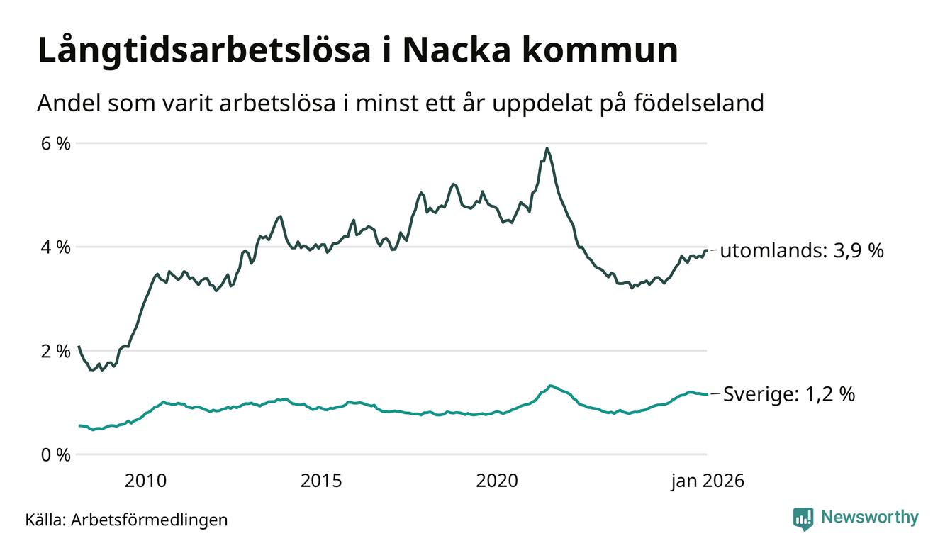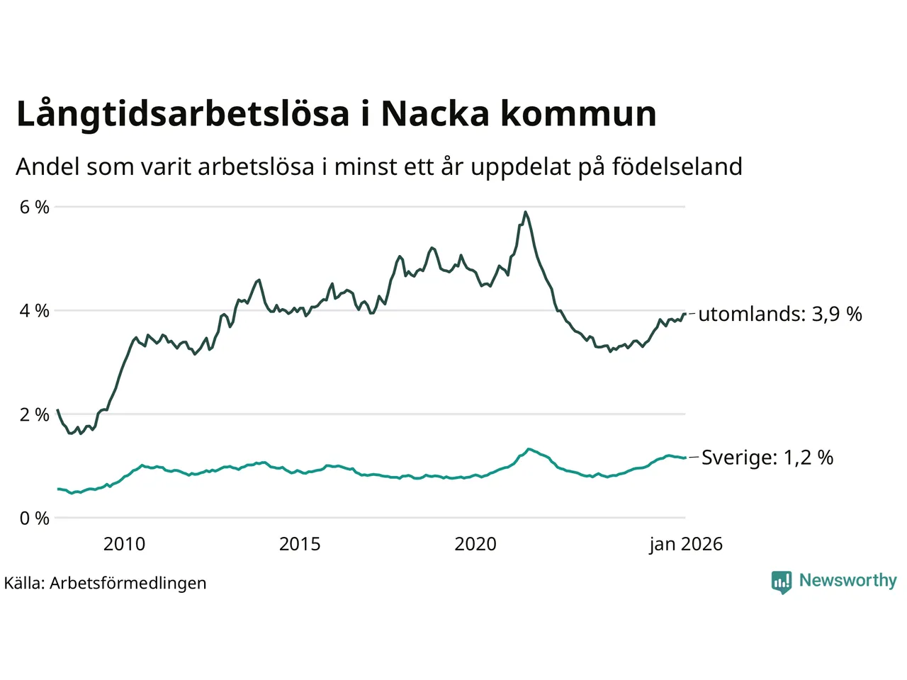 509 av de långtidsarbetslösa i Nacka är födda i Sverige, medan 540 är födda utomlands. Det innebär att långtidsarbetslösheten bland Sverigefödda är 1,2 procent, medan den är tre gånger så hög – 3,9 procent – bland födda utomlands. Även i riket som helhet är arbetslösheten högre bland utrikesfödda.