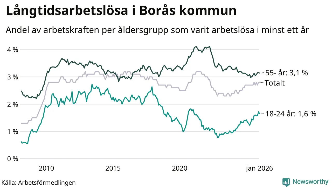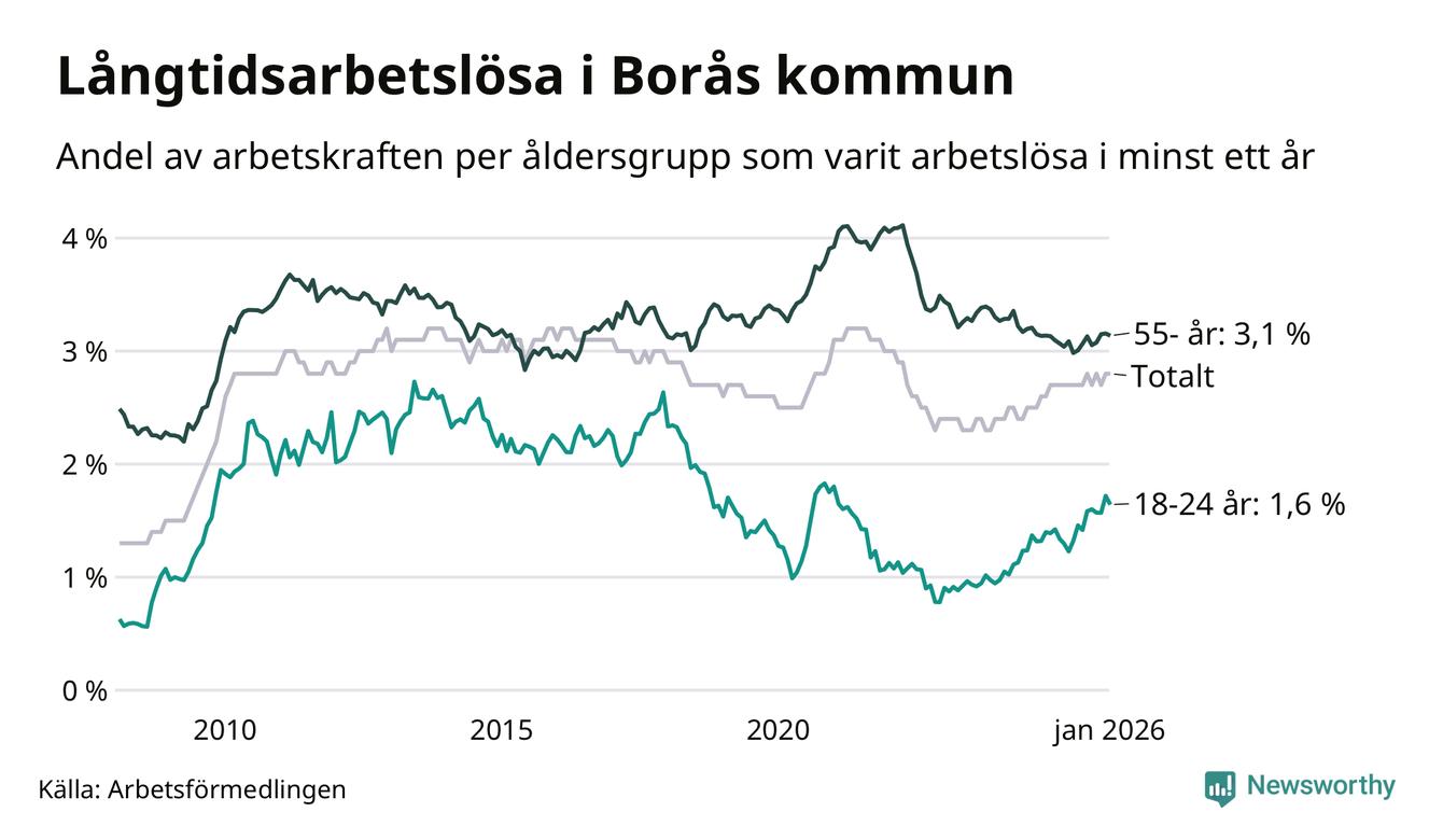 Av de 1 650 personerna som varit arbetslösa i mer än ett år i Borås kommun är 374 personer mellan 55 och 661 år och 110 är mellan 18 och 24 år. För den äldre gruppen är andelen arbetslösa 3,1 procent medan den i den yngre gruppen är 1,6 procent. Även i riket som helhet är långtidsarbetslösheten högre i gruppen äldre.