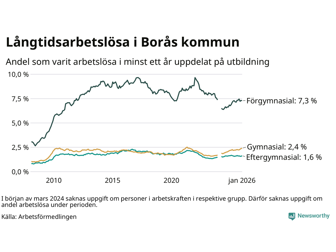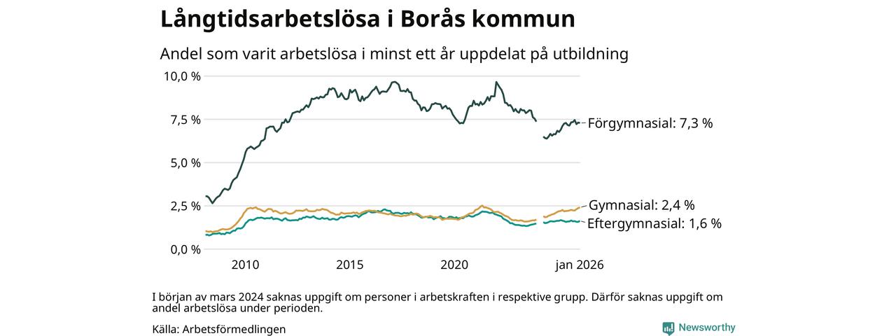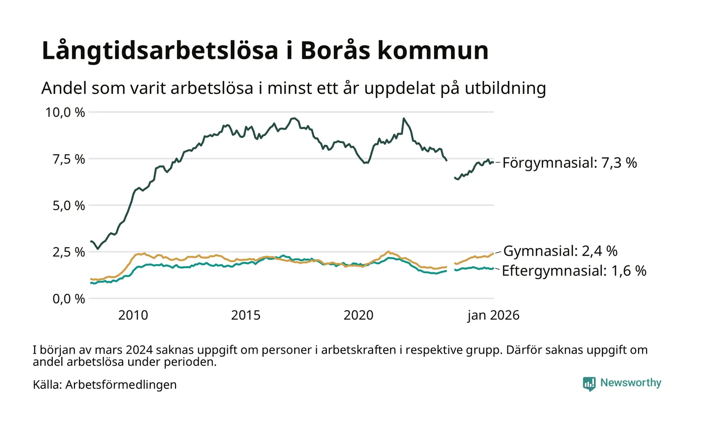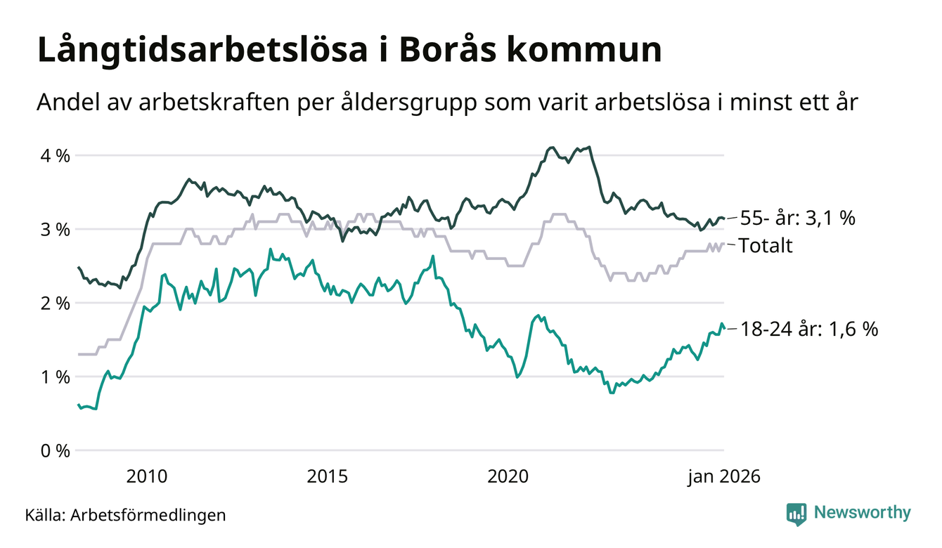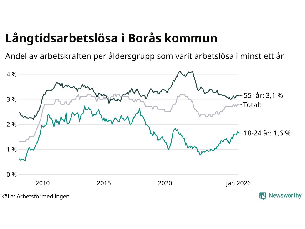 I januari hade 1 650 Boråsbor varit arbetslösa i minst ett år, vilket är 33 fler än månaden innan. 1 650 personer motsvarar 2,8 procent av arbetskraften i kommunen – andelen långtidsarbetslösa är ungefär på samma nivå som för ett år sedan.