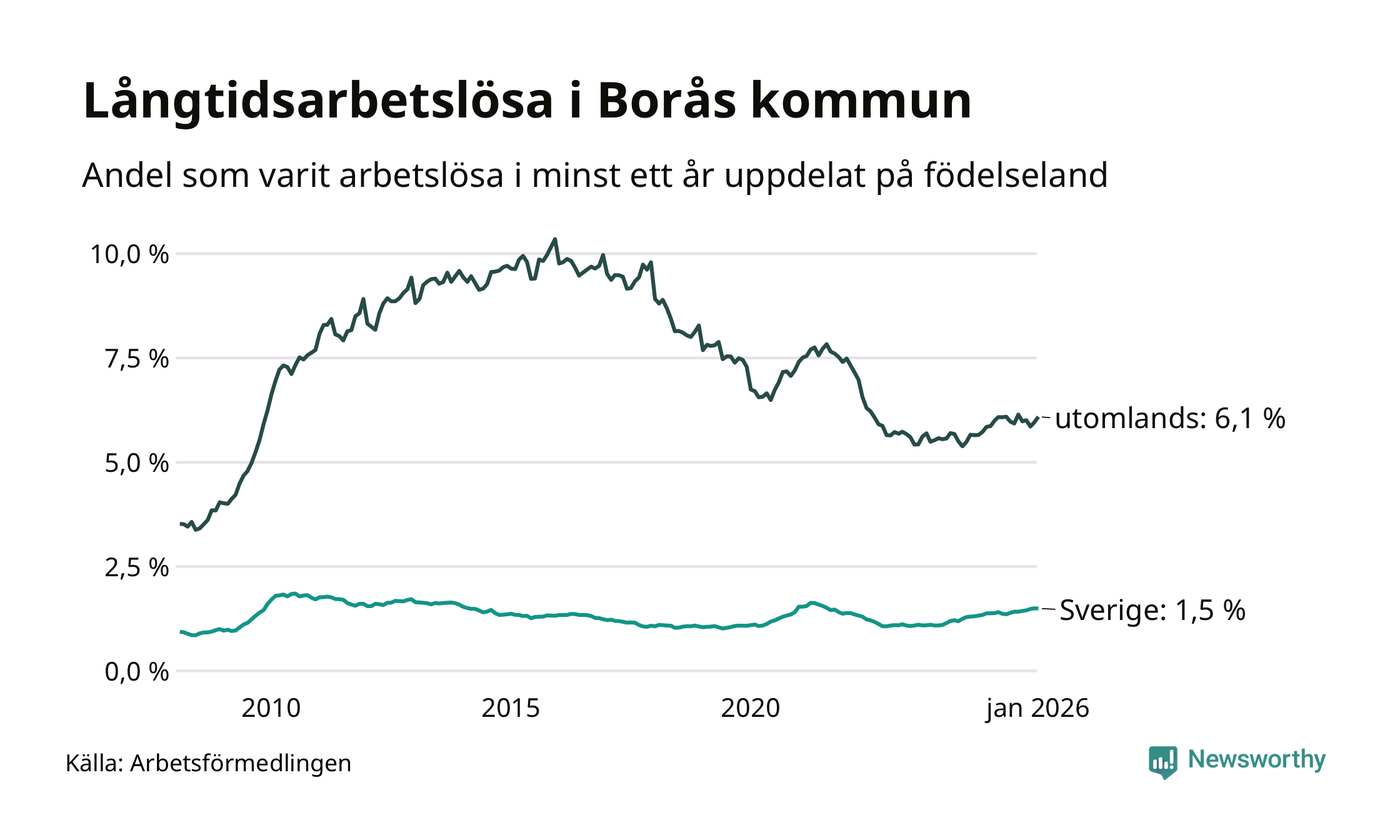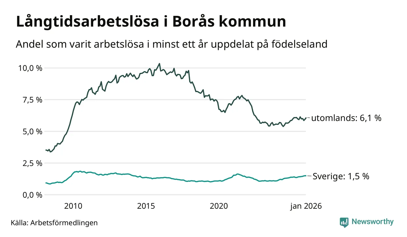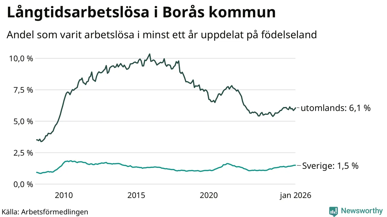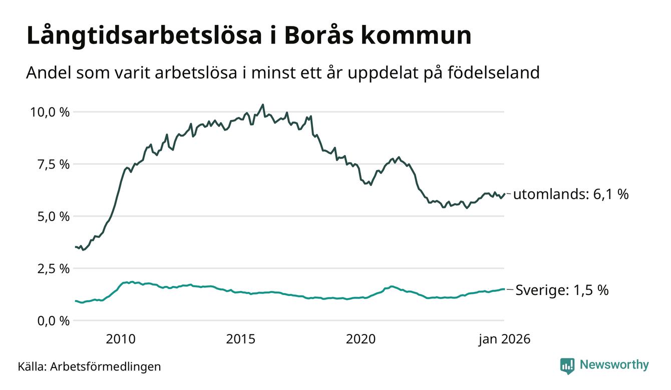 625 av de långtidsarbetslösa i Borås är födda i Sverige, medan 1 025 är födda utomlands. Det innebär att långtidsarbetslösheten bland Sverigefödda är 1,5 procent, medan den är fyra gånger så hög – 6,1 procent – bland födda utomlands. Även i riket som helhet är arbetslösheten högre bland utrikesfödda.