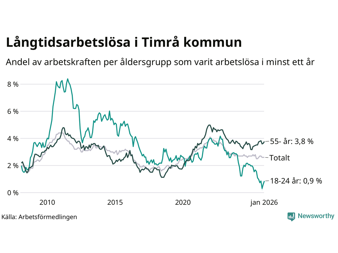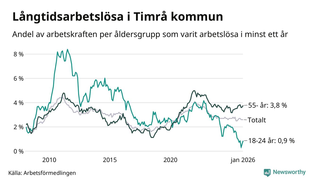 Av de 226 personerna som varit arbetslösa i mer än ett år i Timrå kommun är 81 personer mellan 55 och 661 år och sju är mellan 18 och 24 år. För den äldre gruppen är andelen arbetslösa 3,8 procent medan den i den yngre gruppen är 0,9 procent. Även i riket som helhet är långtidsarbetslösheten högre i gruppen äldre.