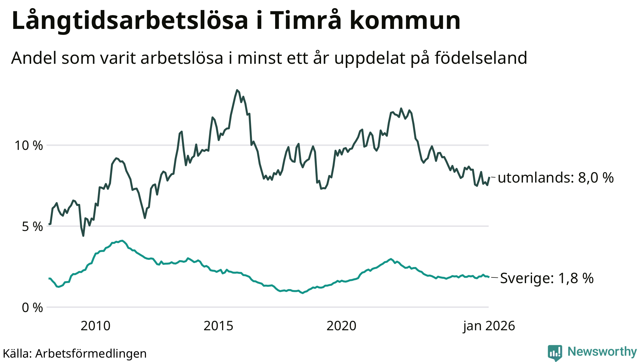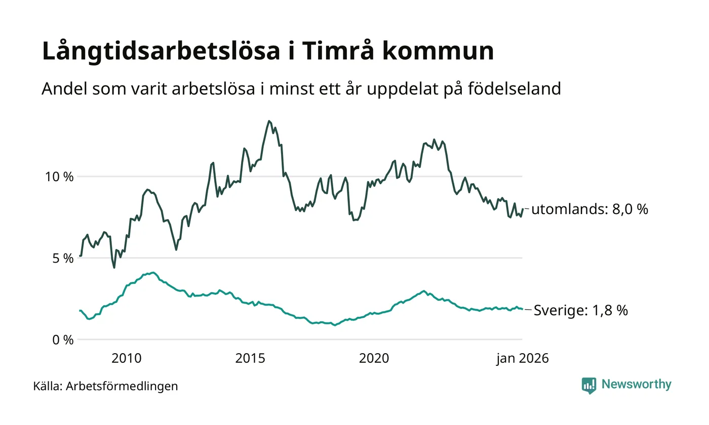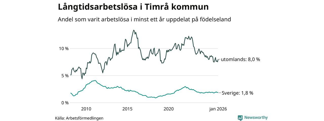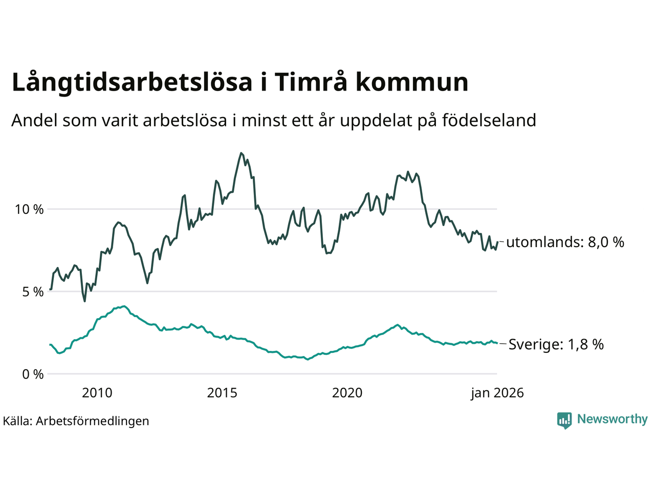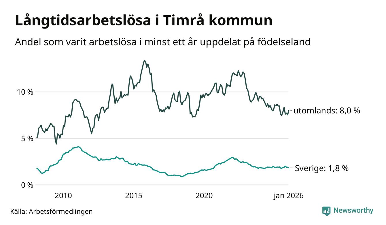 139 av de långtidsarbetslösa i Timrå är födda i Sverige, medan 87 är födda utomlands. Det innebär att långtidsarbetslösheten bland Sverigefödda är 1,8 procent, medan den är fyra gånger så hög – 8,0 procent – bland födda utomlands. Även i riket som helhet är arbetslösheten högre bland utrikesfödda.