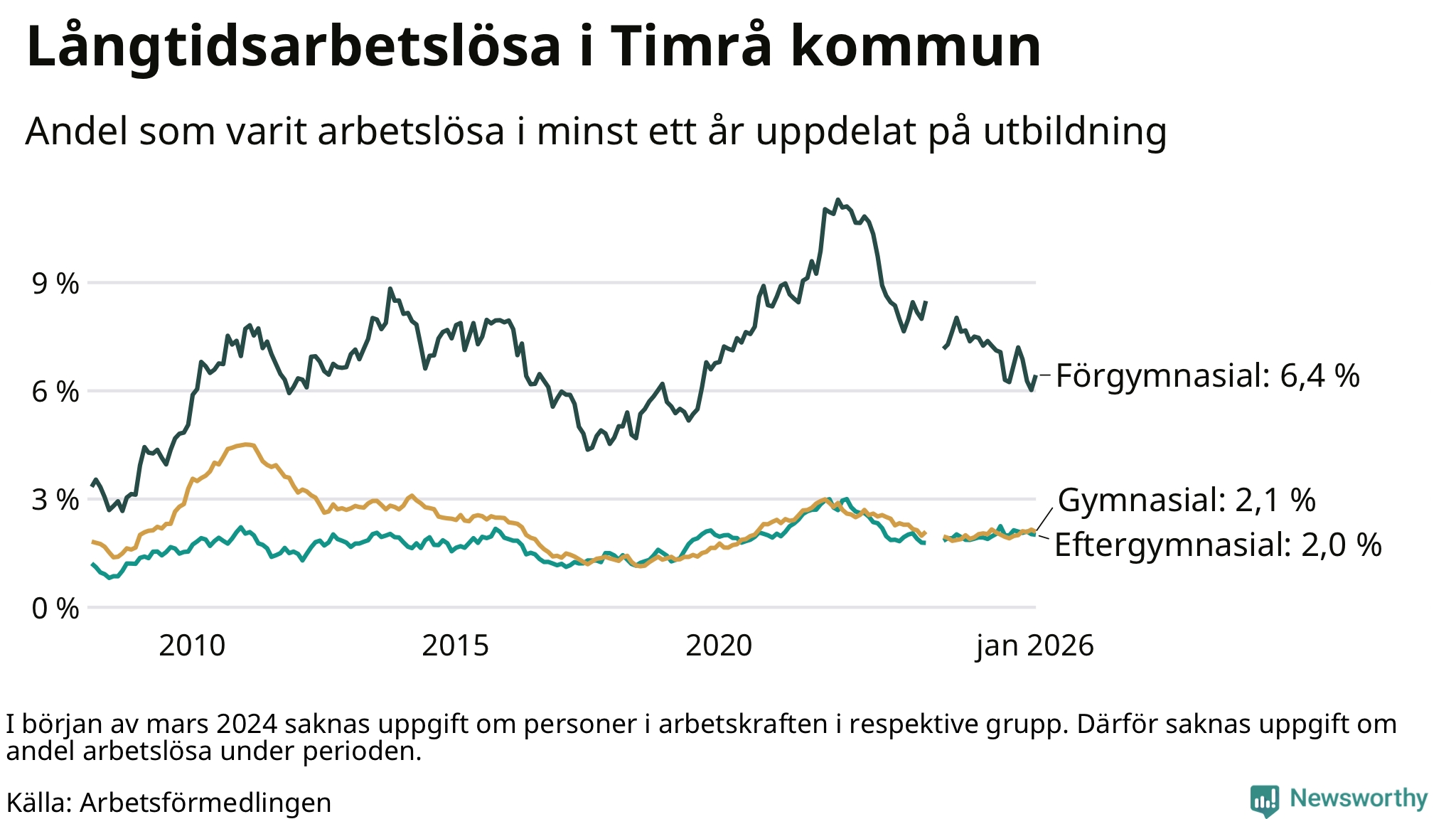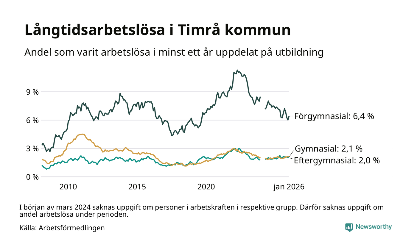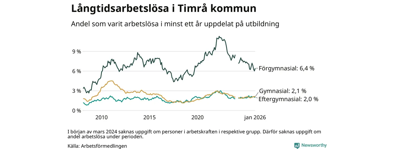 Graf: Andel arbetslösa i Timrå som varit utan arbete i minst 12 månader