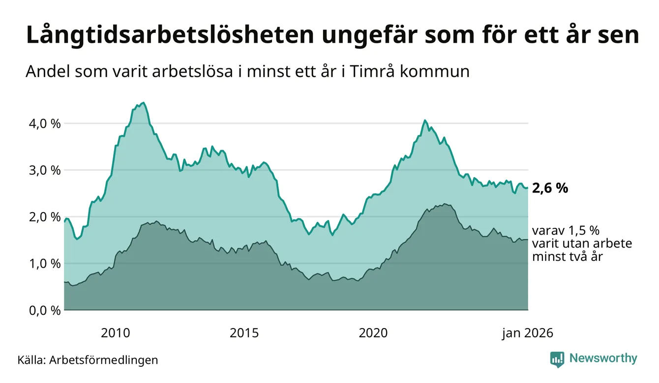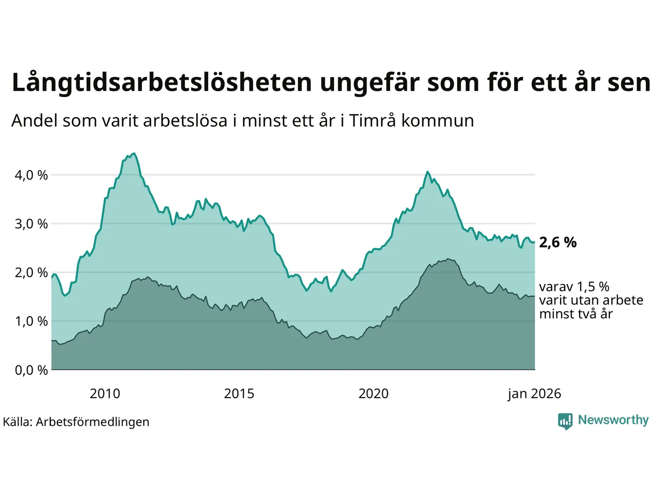I januari hade 226 Timråbor varit arbetslösa i minst ett år, vilket är tre fler än månaden innan. 226 personer motsvarar 2,6 procent av arbetskraften i kommunen – andelen långtidsarbetslösa är ungefär på samma nivå som för ett år sedan.