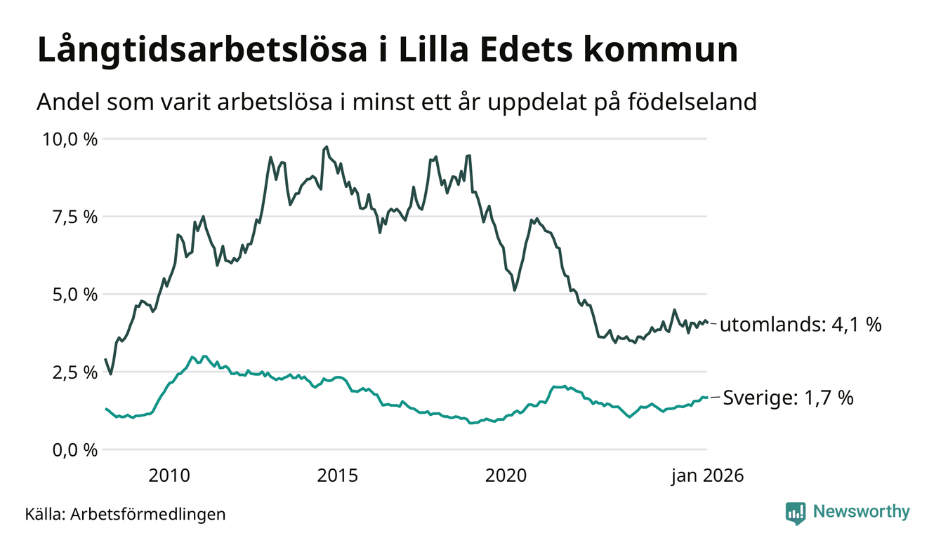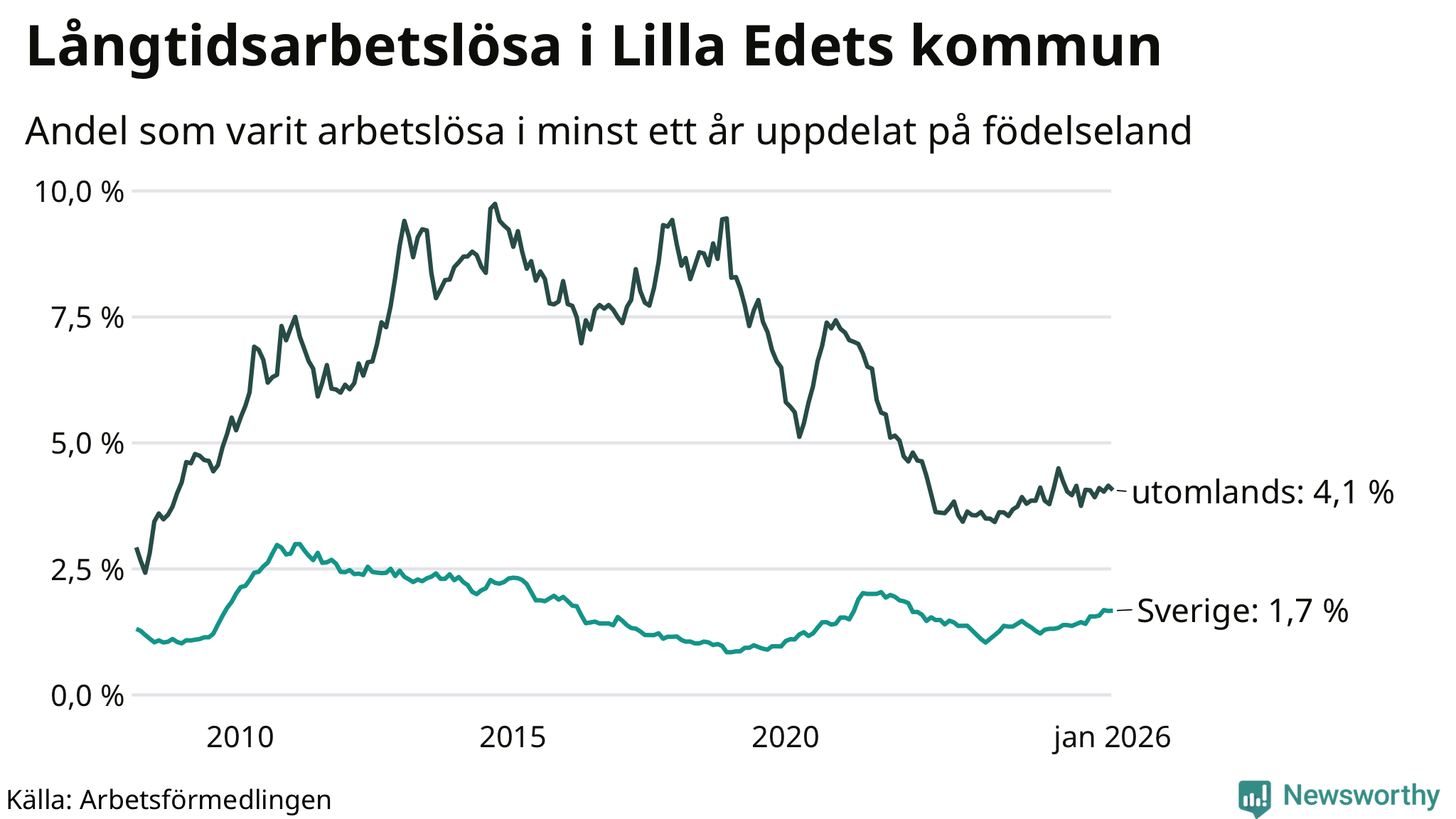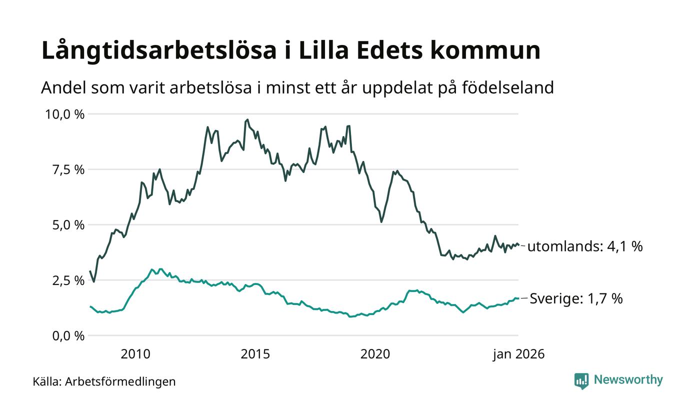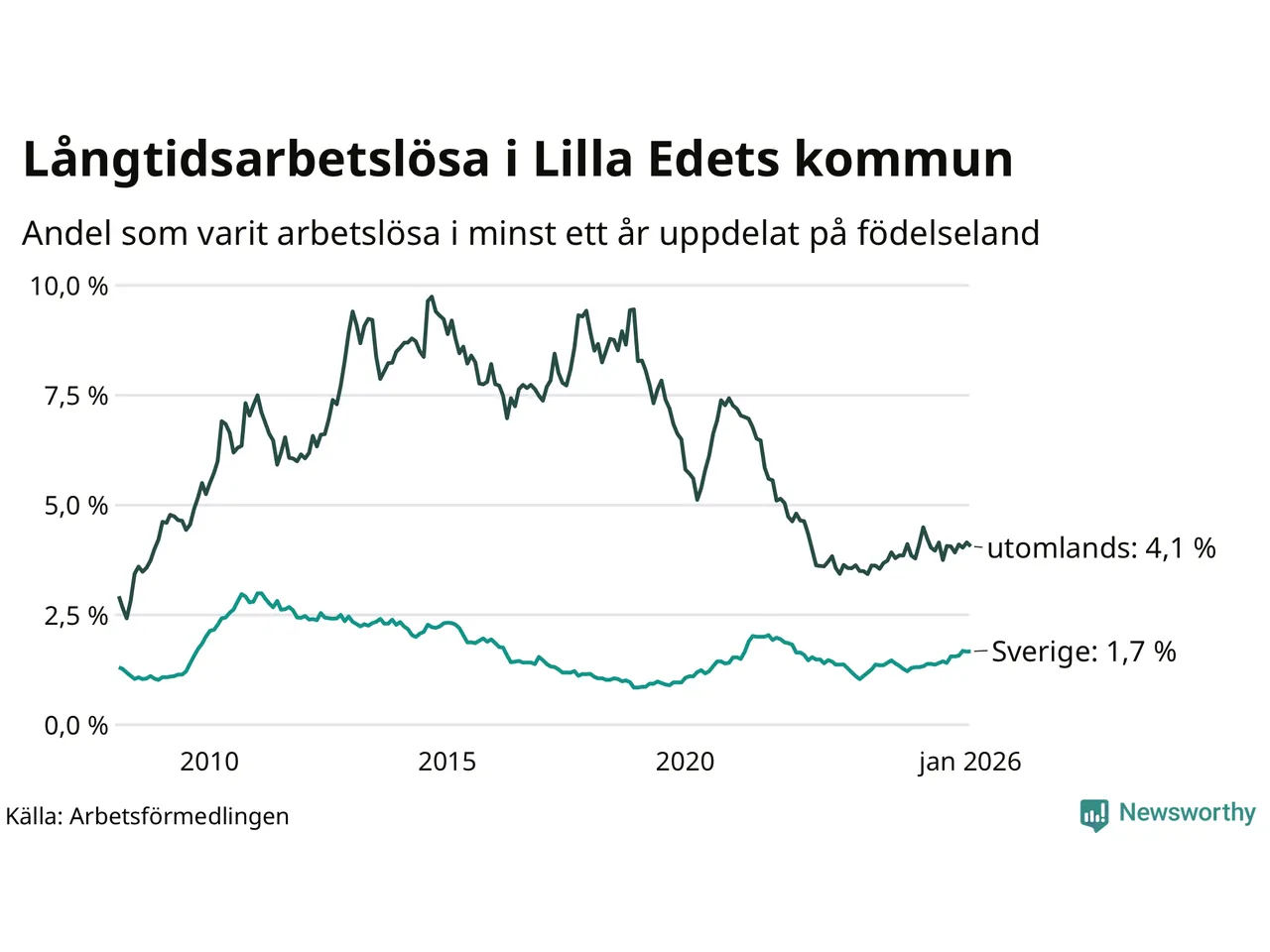 92 av de långtidsarbetslösa i Lilla Edet är födda i Sverige, medan 64 är födda utomlands. Det innebär att långtidsarbetslösheten bland Sverigefödda är 1,7 procent, medan den är två gånger så hög – 4,1 procent – bland födda utomlands. Även i riket som helhet är arbetslösheten högre bland utrikesfödda.