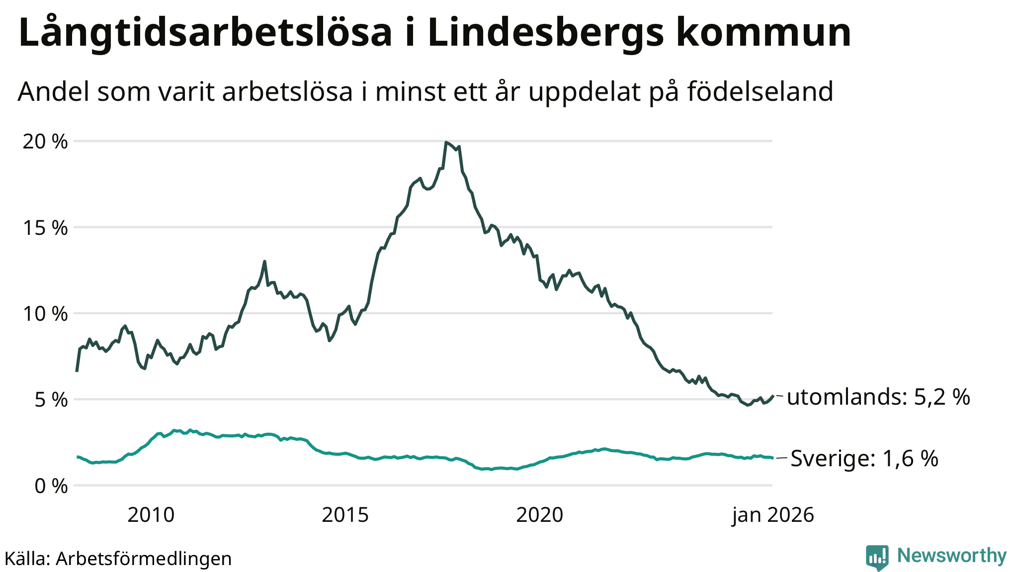 137 av de långtidsarbetslösa i Lindesberg är födda i Sverige, medan 100 är födda utomlands. Det innebär att långtidsarbetslösheten bland Sverigefödda är 1,6 procent, medan den är tre gånger så hög – 5,2 procent – bland födda utomlands. Även i riket som helhet är arbetslösheten högre bland utrikesfödda.