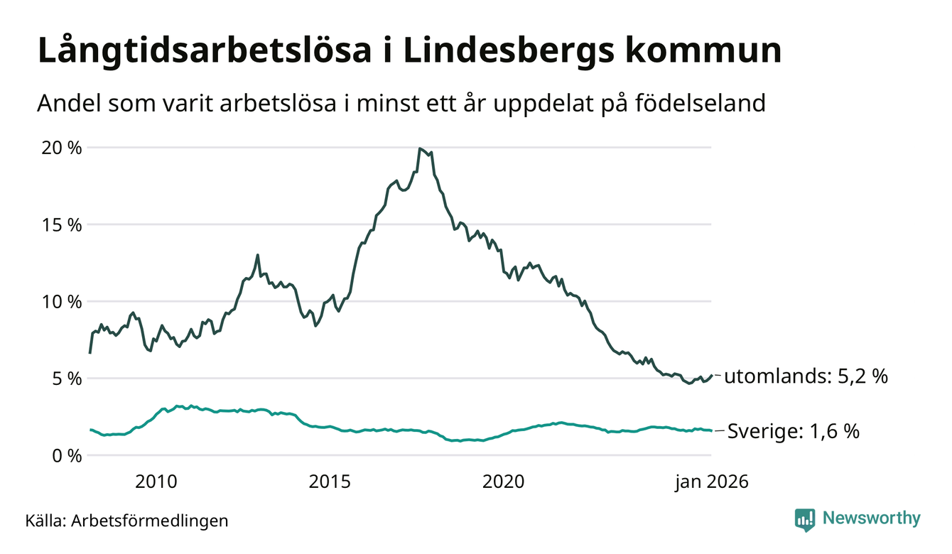 Graf: Andel arbetslösa uppdelat på födelseland i Lindesberg