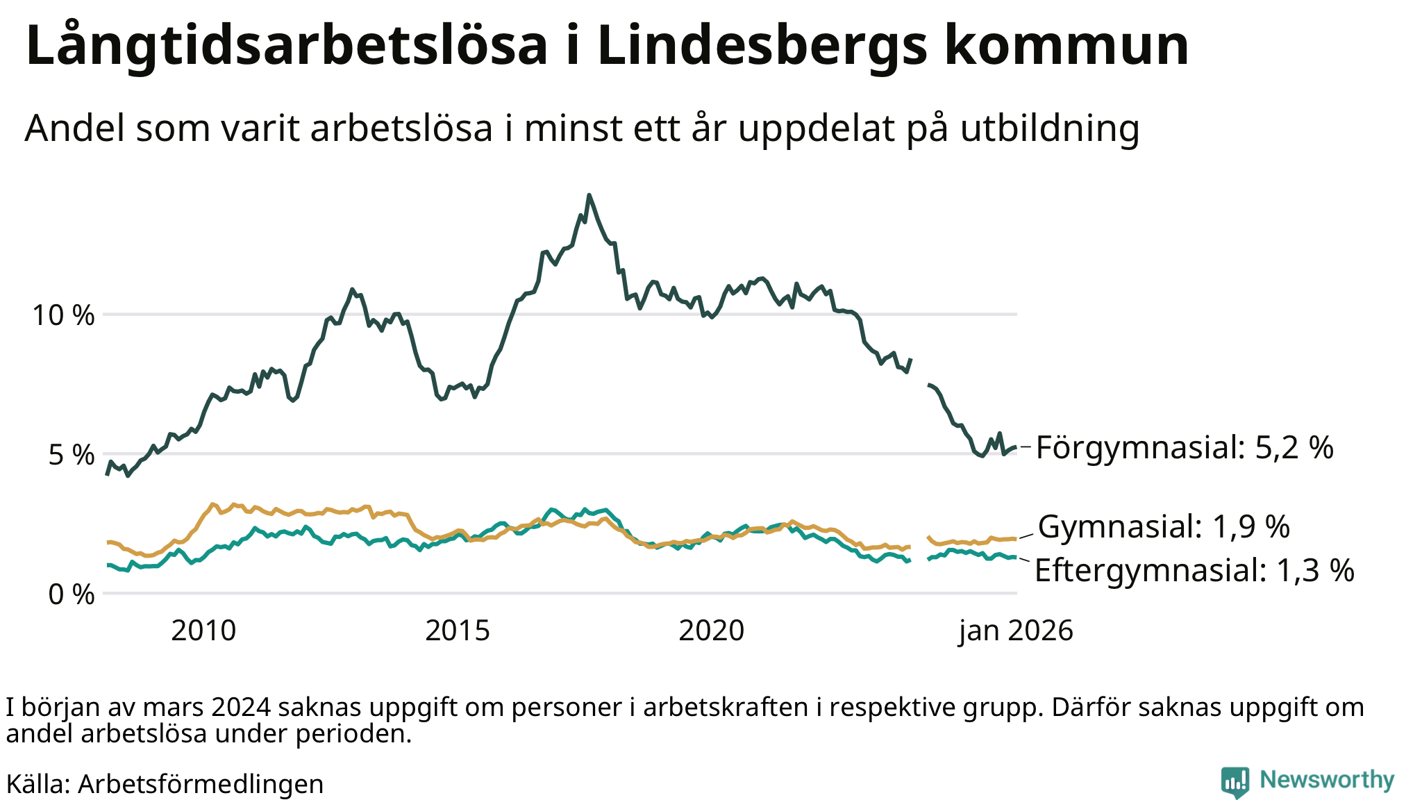 Graf över andel långtidsarbetslösa i Lindesberg uppdelat på utbildningsnivå