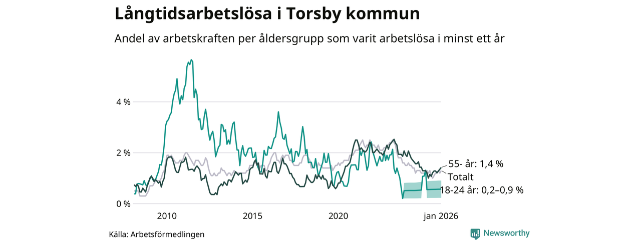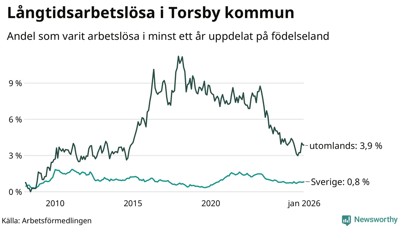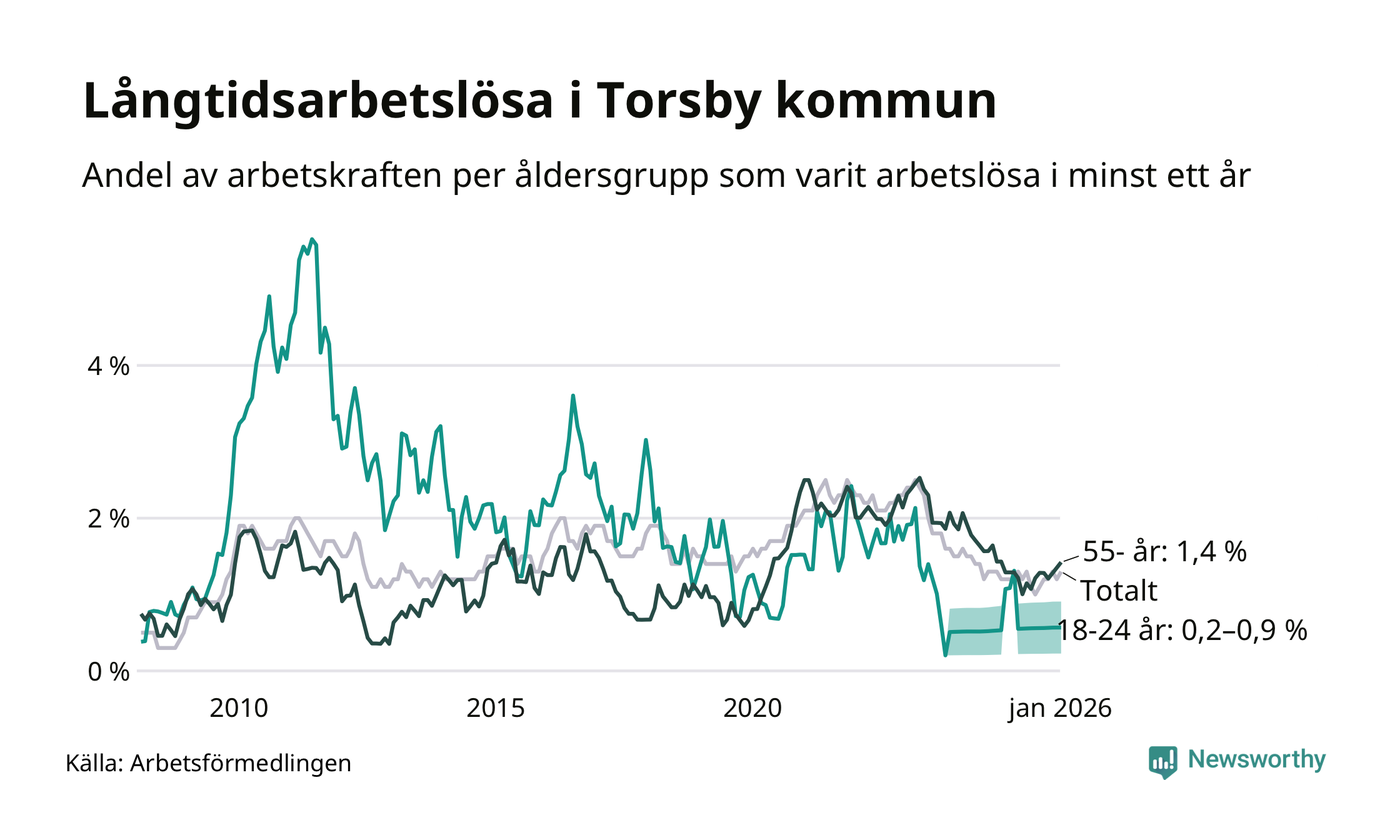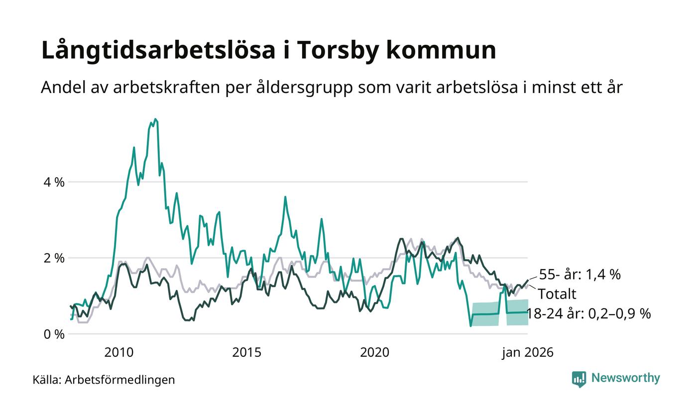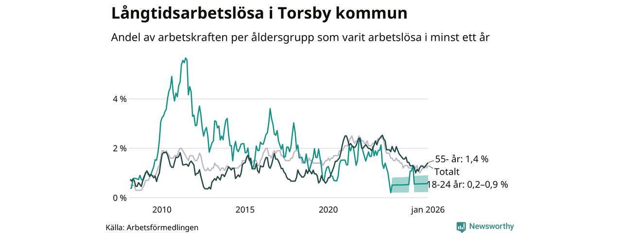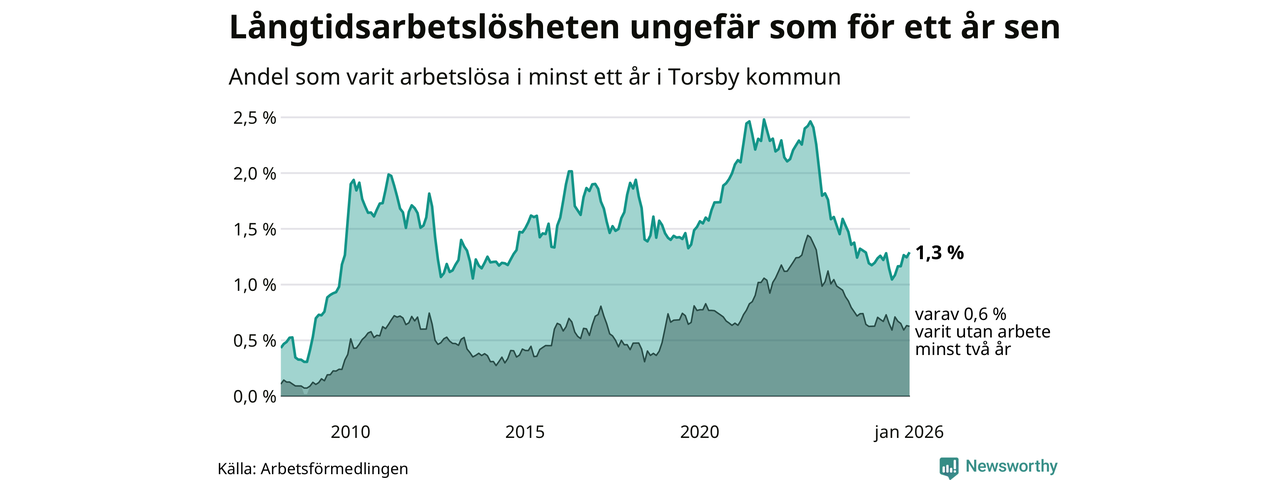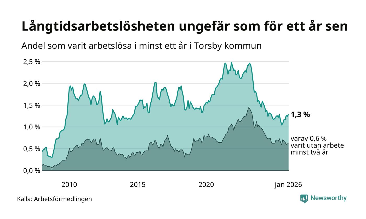 I januari hade 66 Torsbybor varit arbetslösa i minst ett år, vilket är tre fler än månaden innan. 66 personer motsvarar 1,3 procent av arbetskraften i kommunen – andelen långtidsarbetslösa är ungefär på samma nivå som för ett år sedan.
