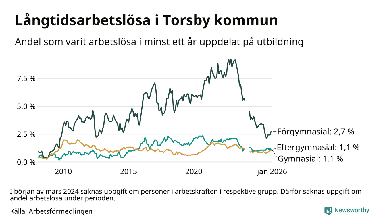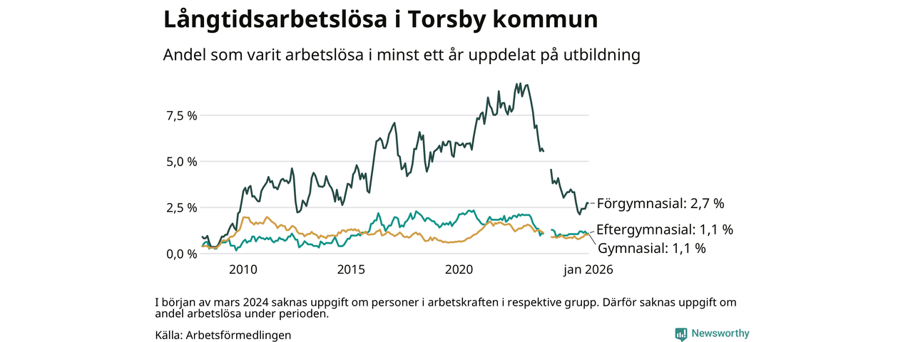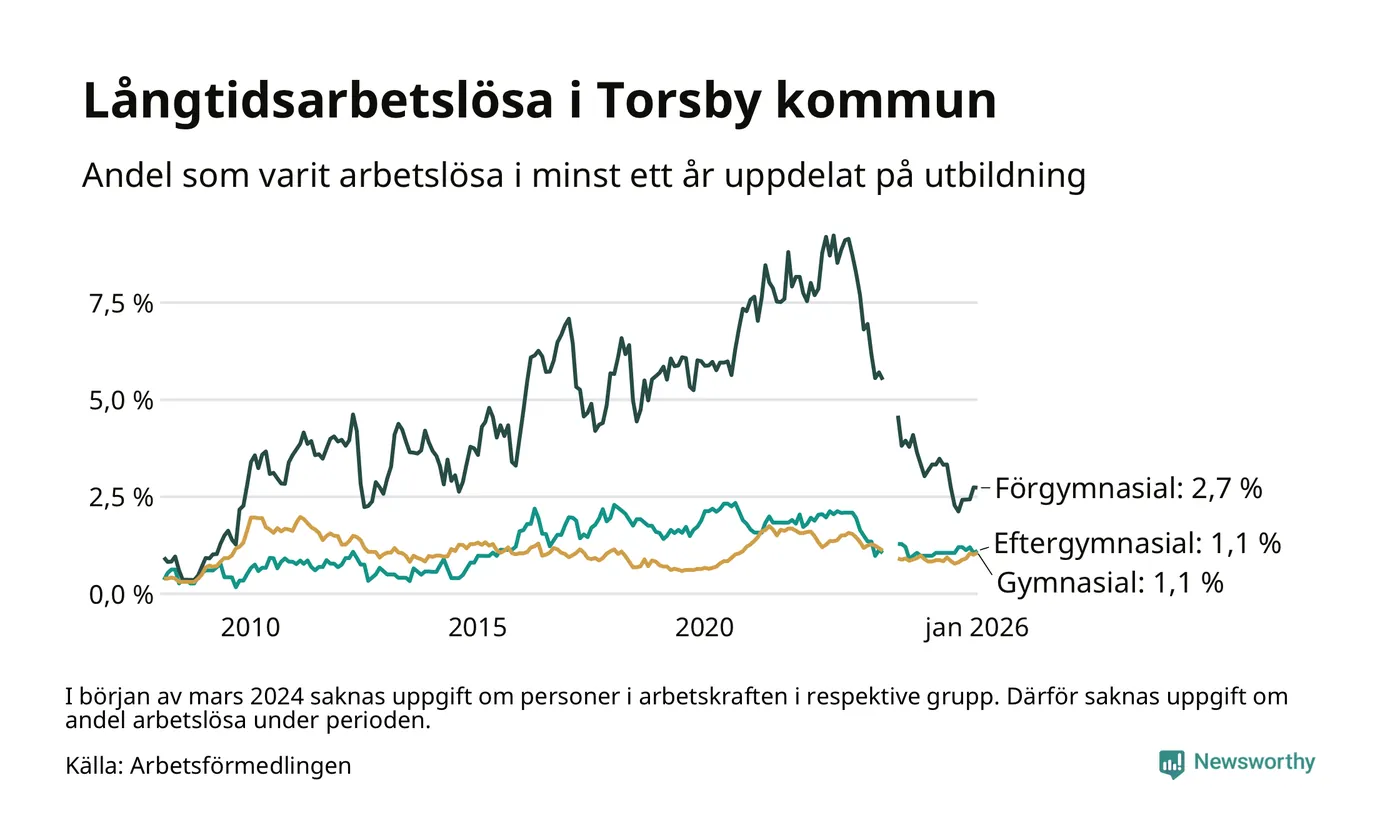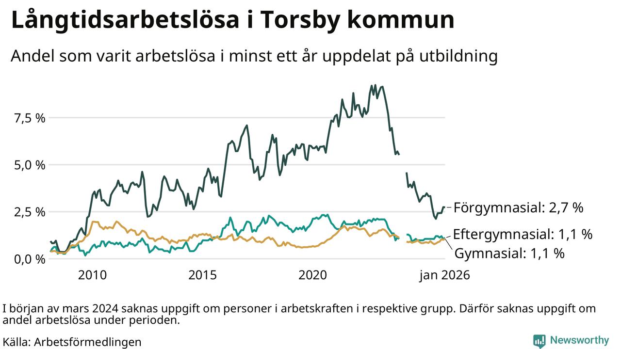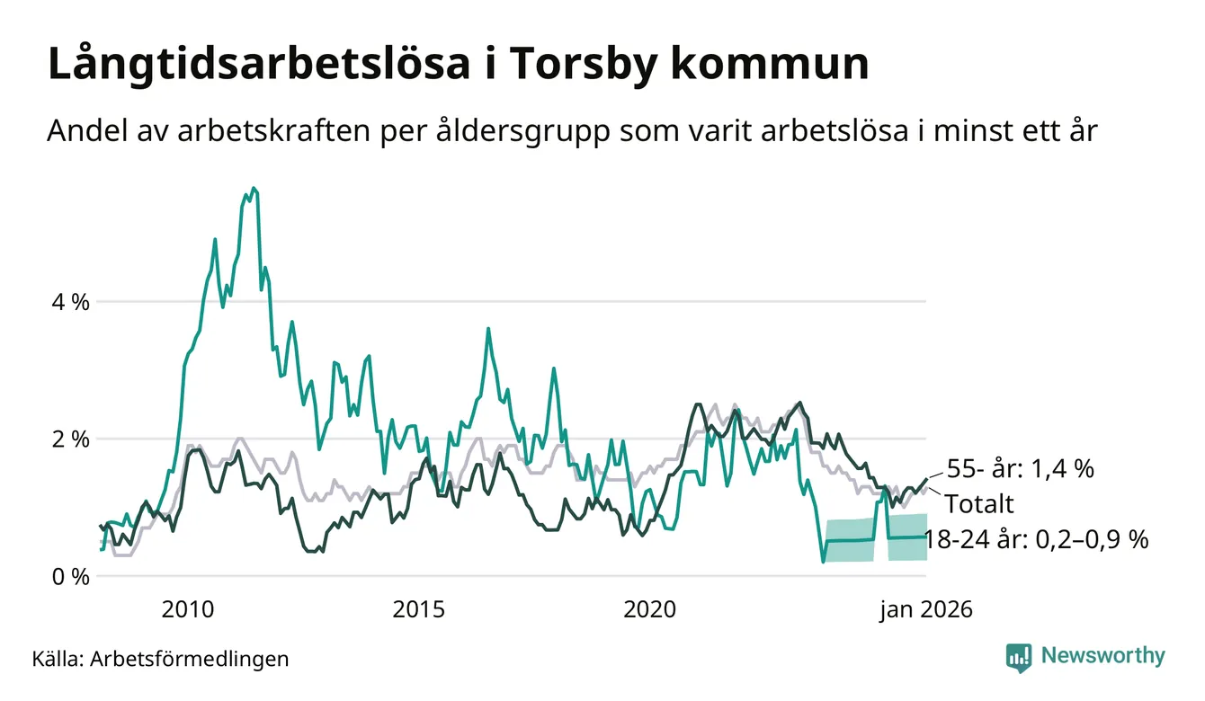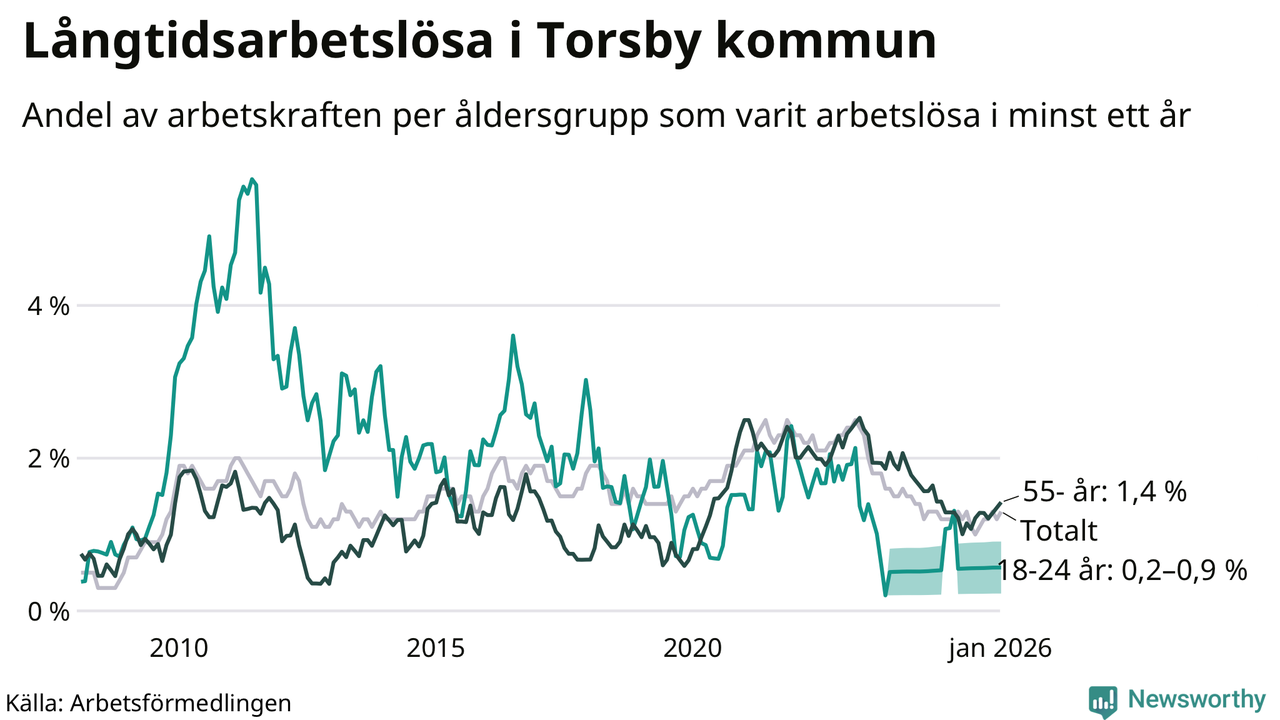 I januari hade 66 Torsbybor varit arbetslösa i minst ett år, vilket är tre fler än månaden innan. 66 personer motsvarar 1,3 procent av arbetskraften i kommunen – andelen långtidsarbetslösa är ungefär på samma nivå som för ett år sedan.
