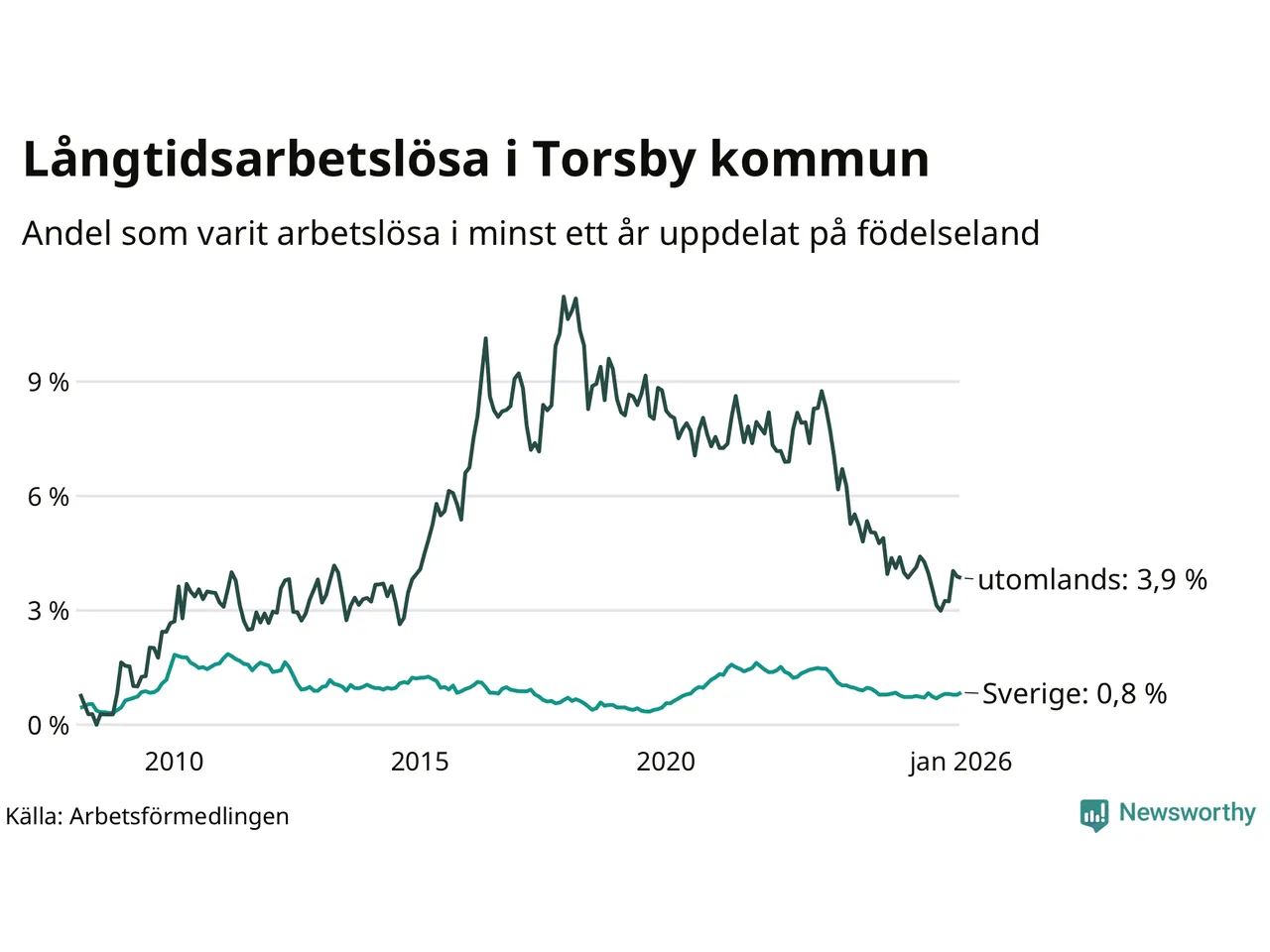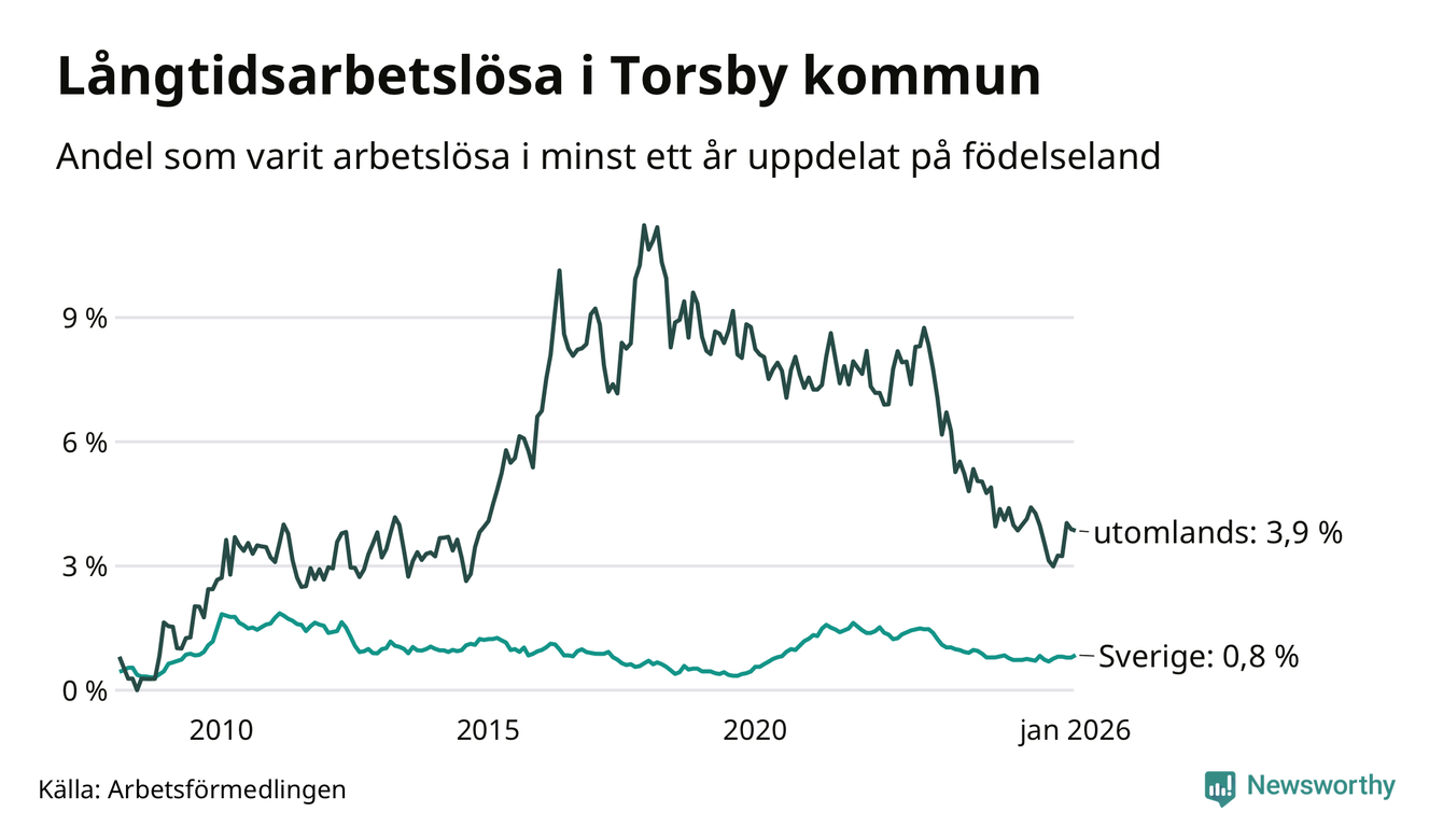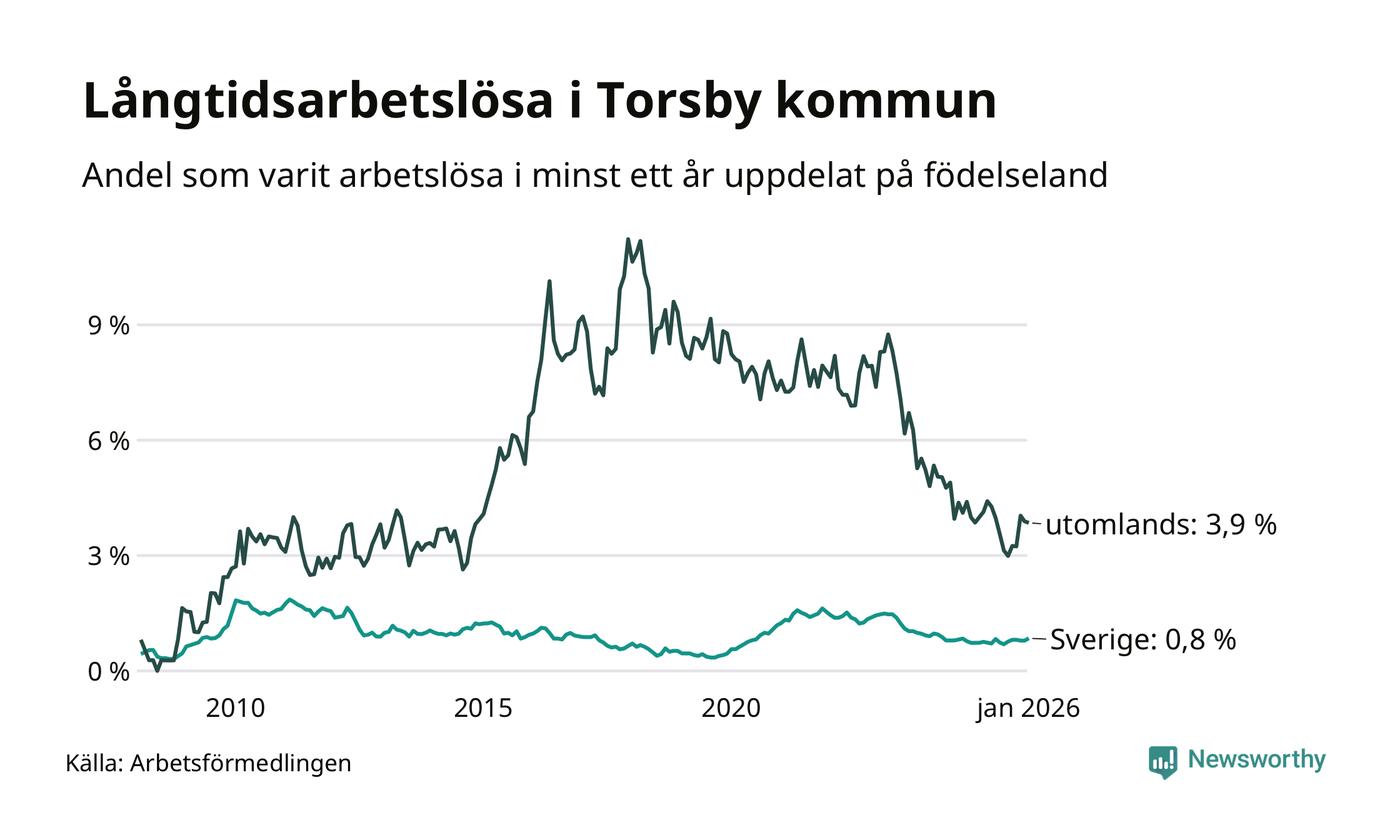 37 av de långtidsarbetslösa i Torsby är födda i Sverige, medan 29 är födda utomlands. Det innebär att långtidsarbetslösheten bland Sverigefödda är 0,8 procent, medan den är fem gånger så hög – 3,9 procent – bland födda utomlands. Även i riket som helhet är arbetslösheten högre bland utrikesfödda.
