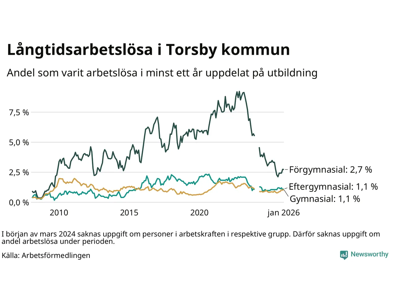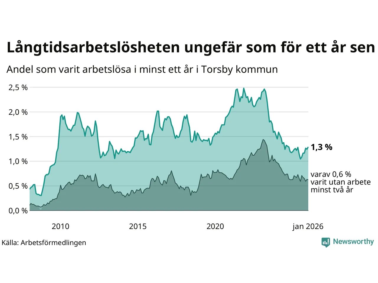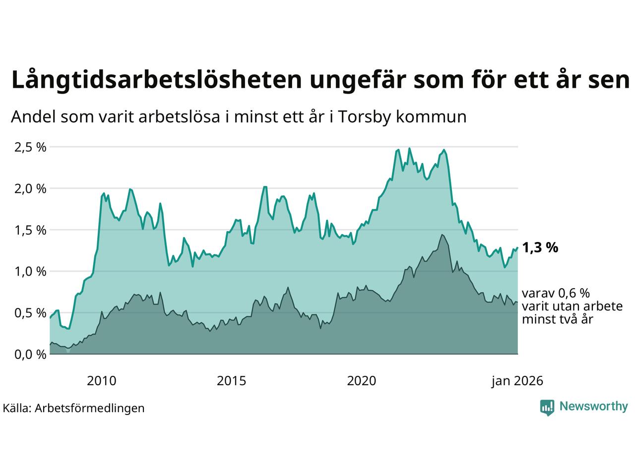 | Andel arbetslösa i minst två år | 0,6 % | 1,3 % | 1,6 % |