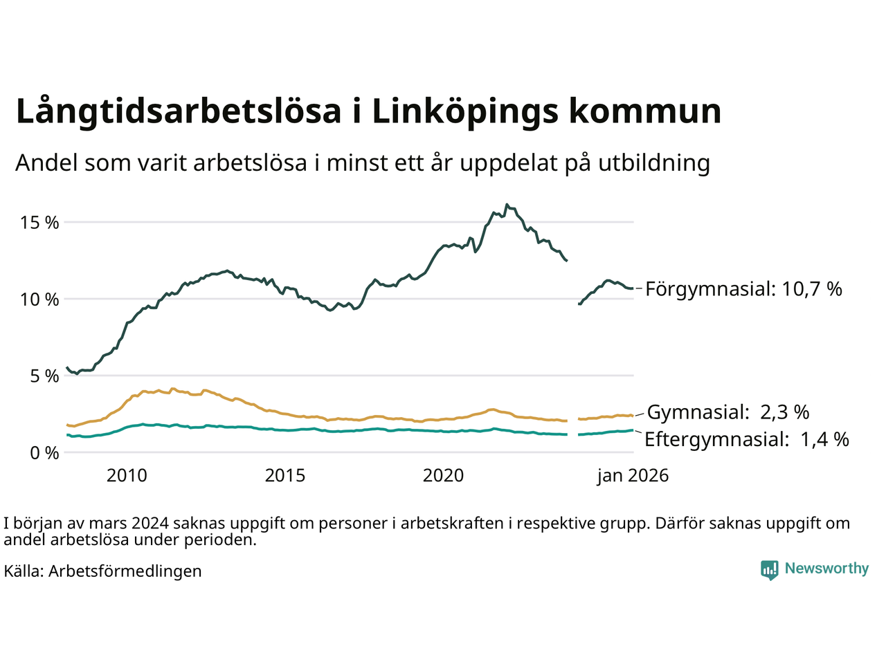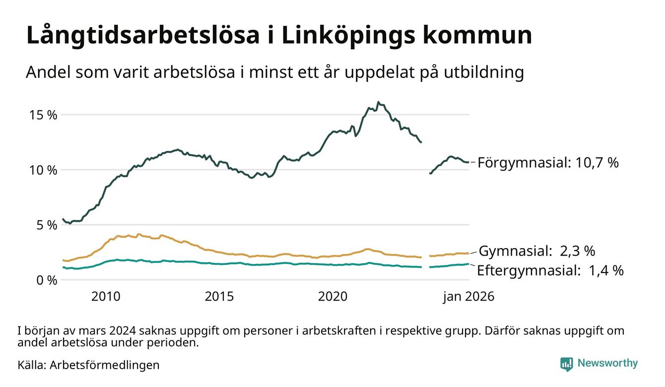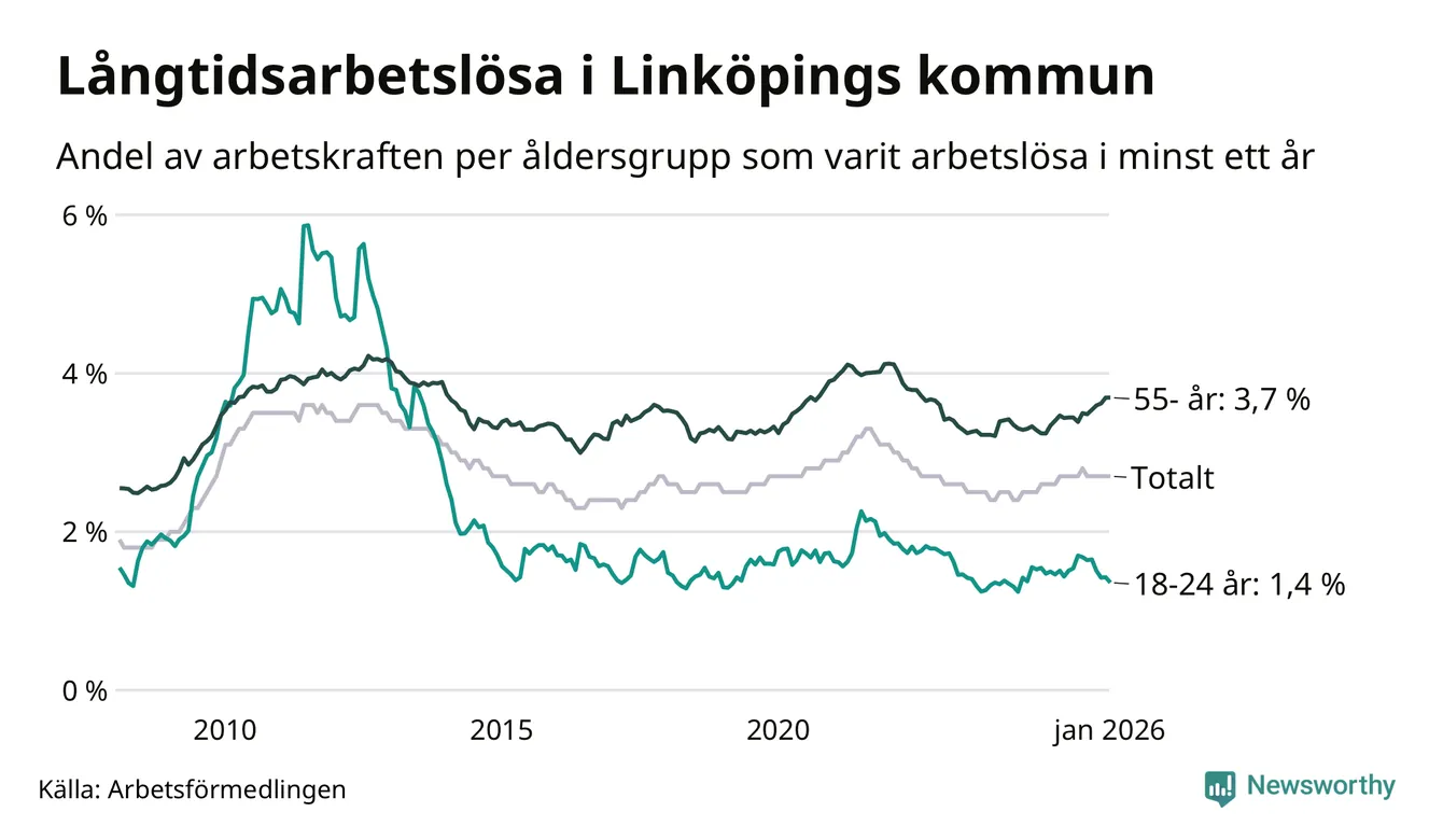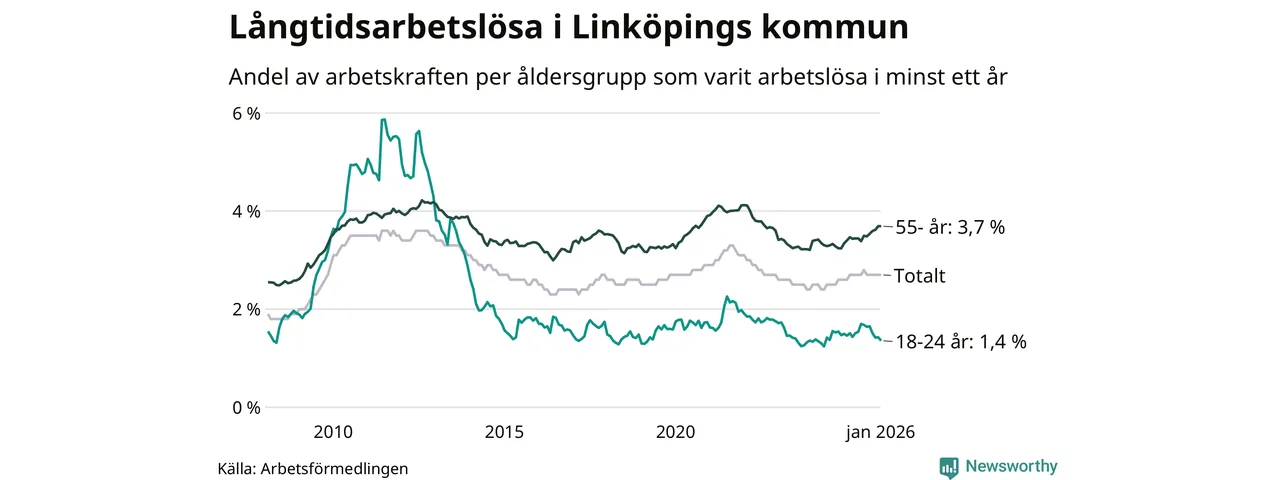 Av de 2 349 personerna som varit arbetslösa i mer än ett år i Linköpings kommun är 608 personer mellan 55 och 661 år och 146 är mellan 18 och 24 år. För den äldre gruppen är andelen arbetslösa 3,7 procent medan den i den yngre gruppen är 1,4 procent. Även i riket som helhet är långtidsarbetslösheten högre i gruppen äldre.