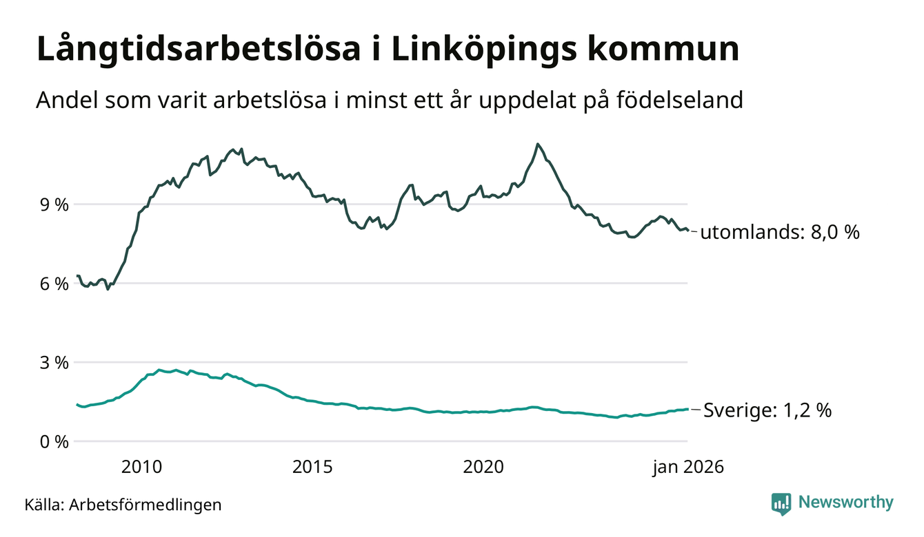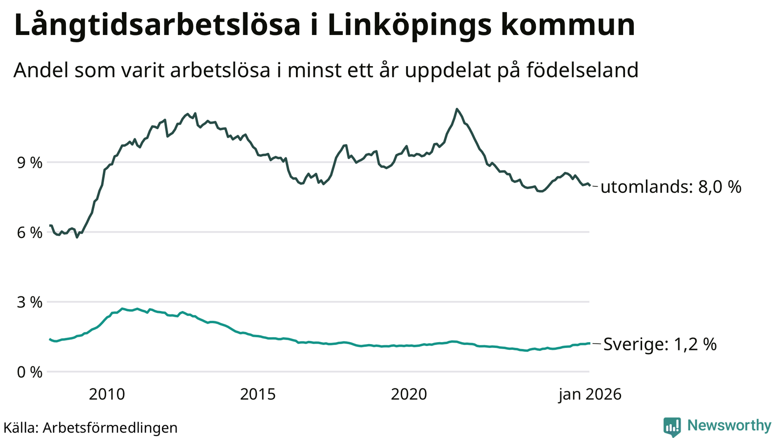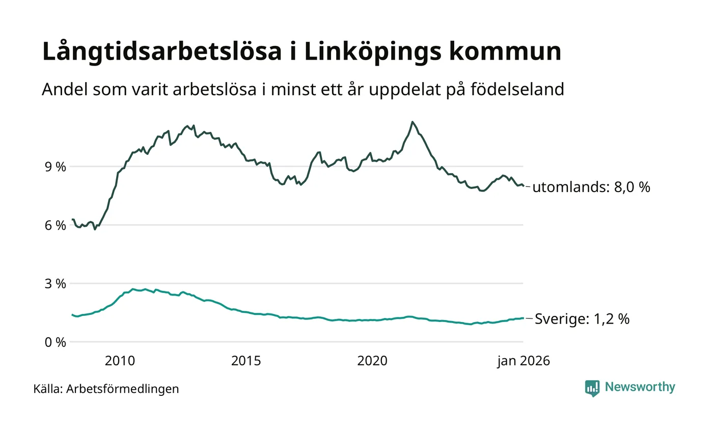 817 av de långtidsarbetslösa i Linköping är födda i Sverige, medan 1 532 är födda utomlands. Det innebär att långtidsarbetslösheten bland Sverigefödda är 1,2 procent, medan den är sju gånger så hög – 8,0 procent – bland födda utomlands. Även i riket som helhet är arbetslösheten högre bland utrikesfödda.