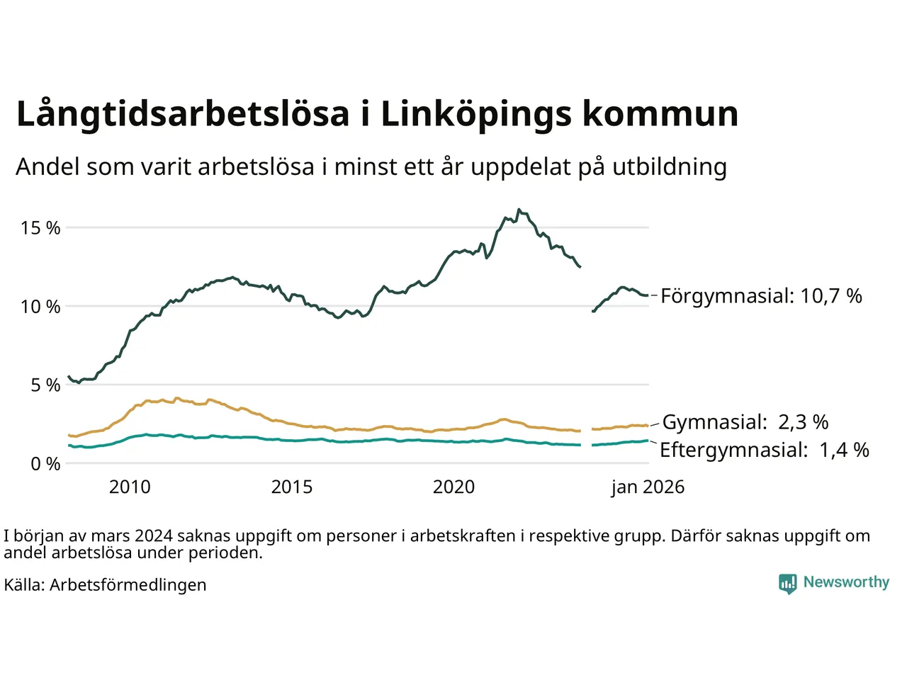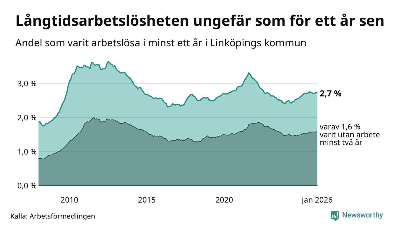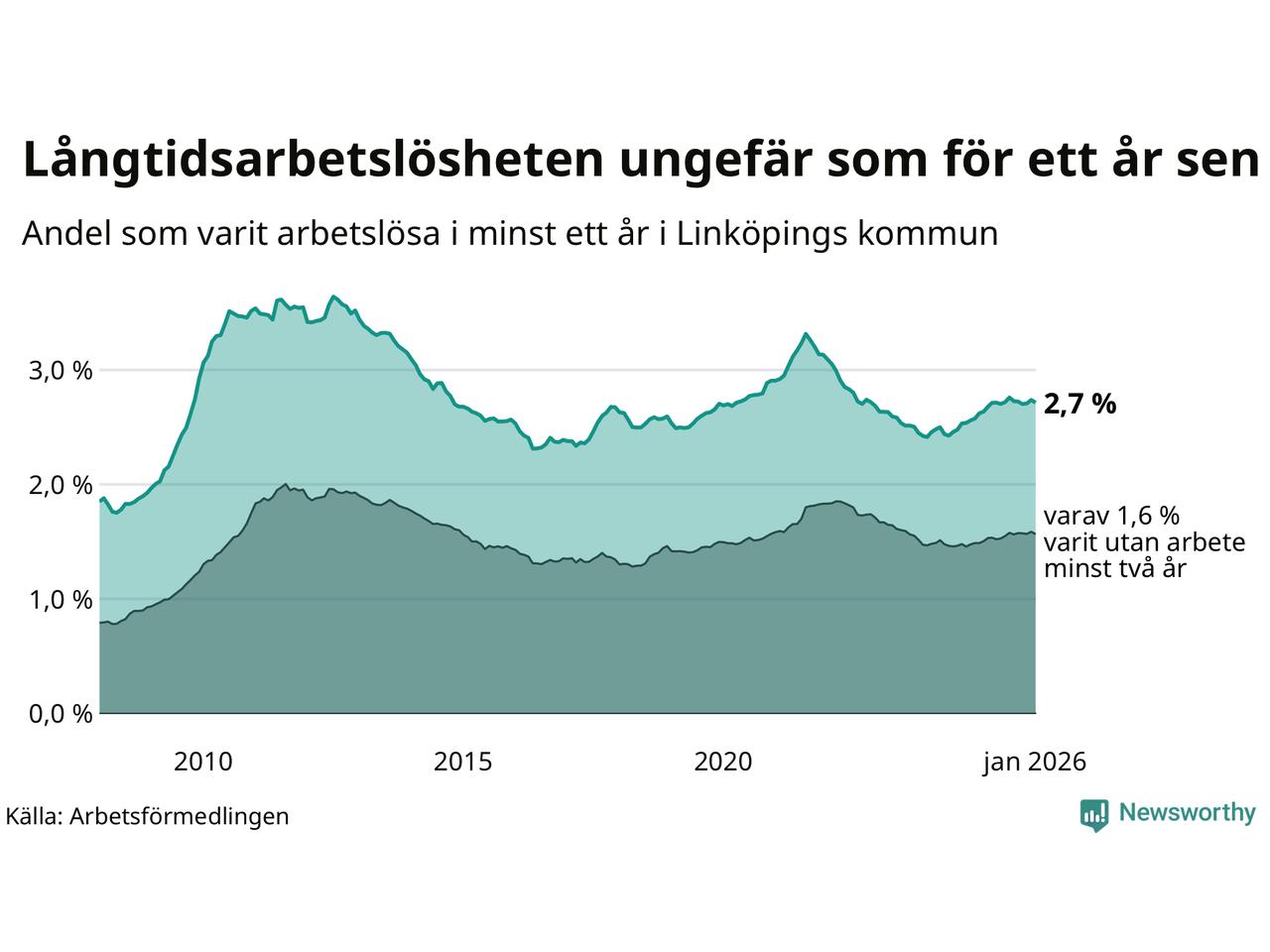 I januari hade 2 349 Linköpingsbor varit arbetslösa i minst ett år, vilket är två färre än månaden innan. 2 349 personer motsvarar 2,7 procent av arbetskraften i kommunen – andelen långtidsarbetslösa är ungefär på samma nivå som för ett år sedan.