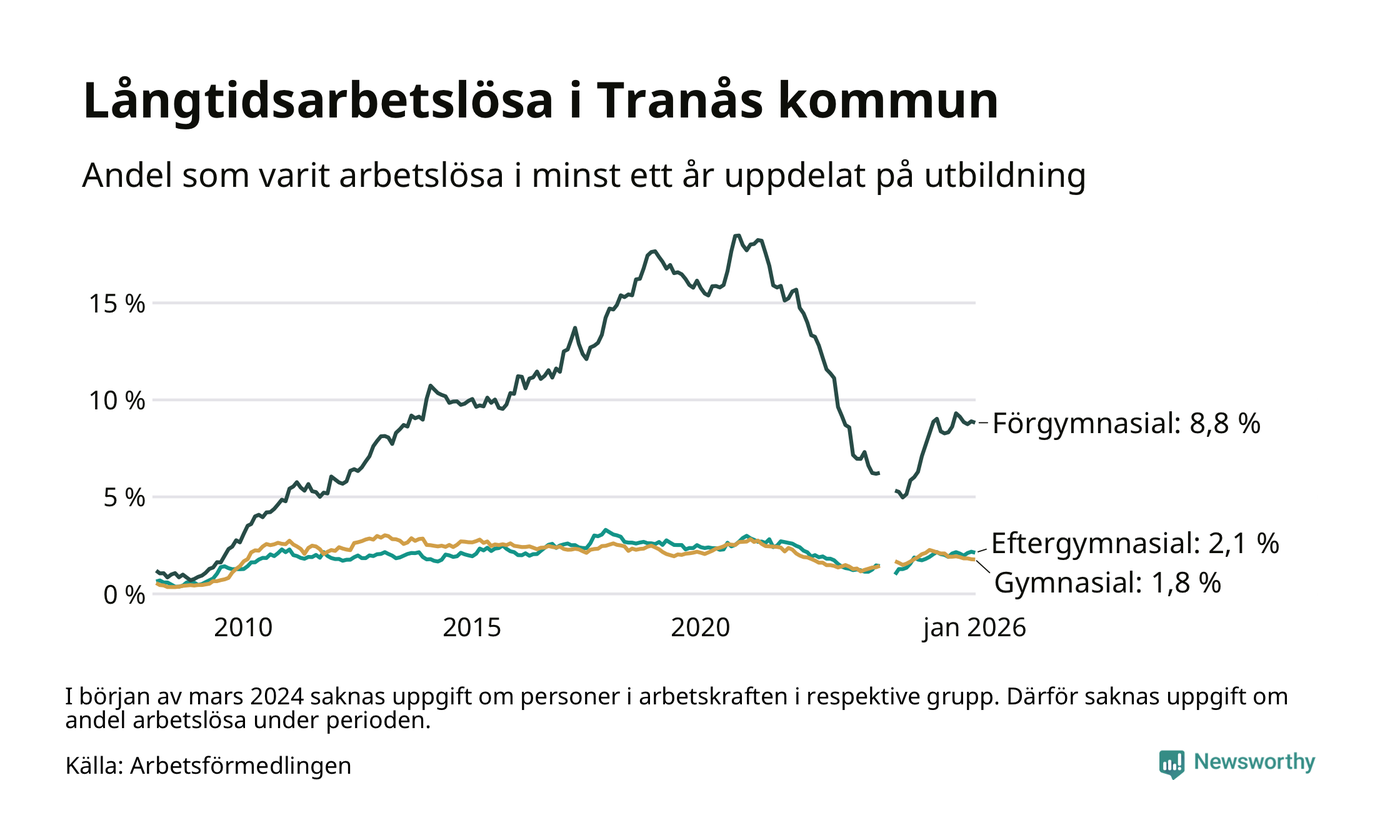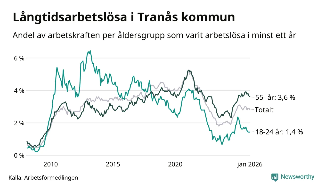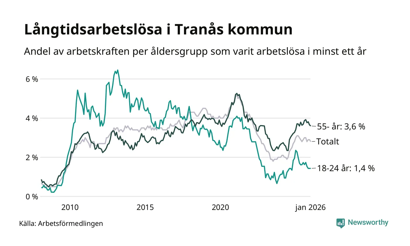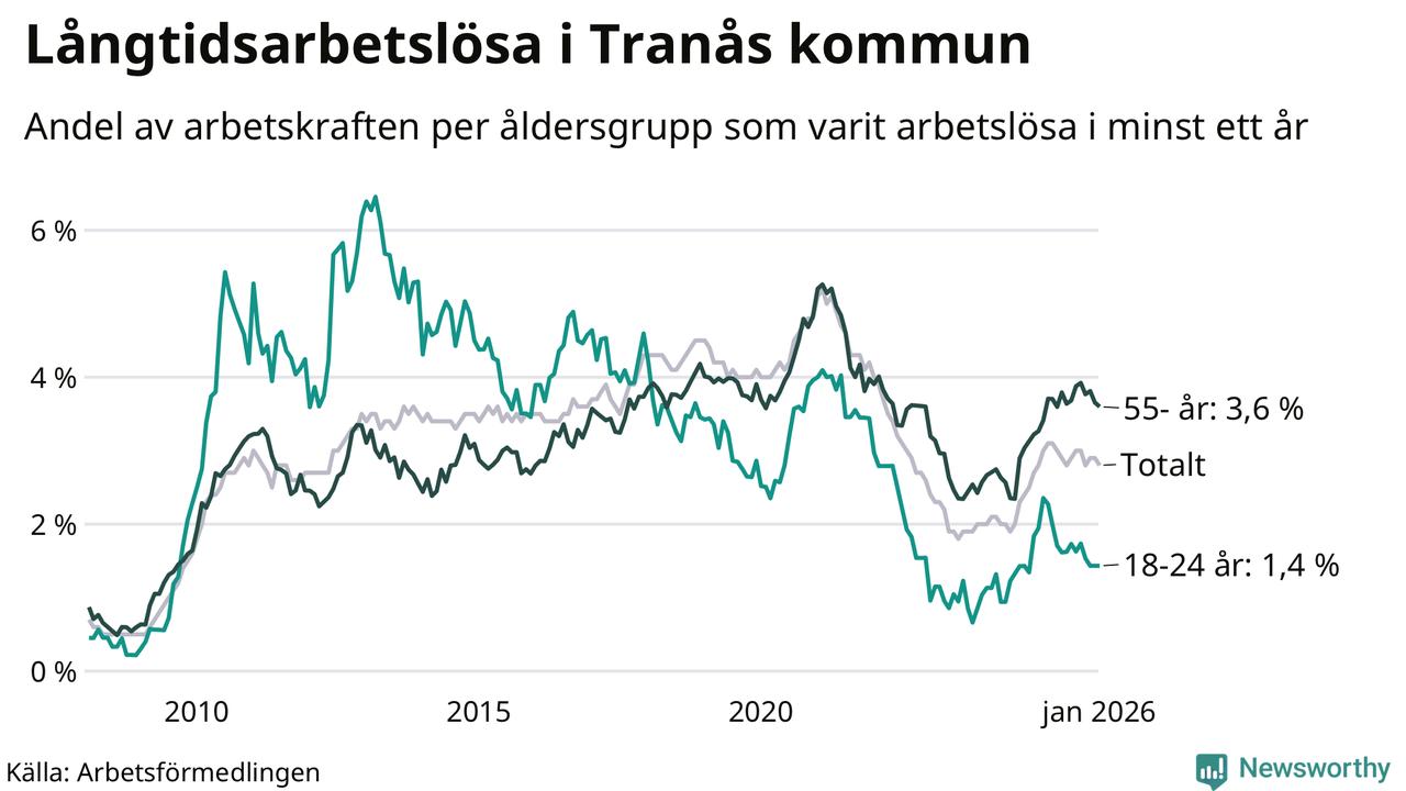 Av de 251 personerna som varit arbetslösa i mer än ett år i Tranås kommun är 73 personer mellan 55 och 661 år och 14 är mellan 18 och 24 år. För den äldre gruppen är andelen arbetslösa 3,6 procent medan den i den yngre gruppen är 1,4 procent. Även i riket som helhet är långtidsarbetslösheten högre i gruppen äldre.