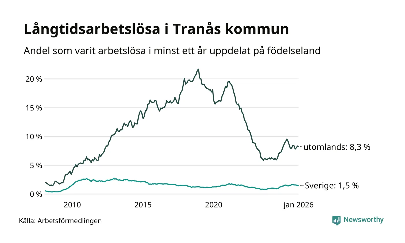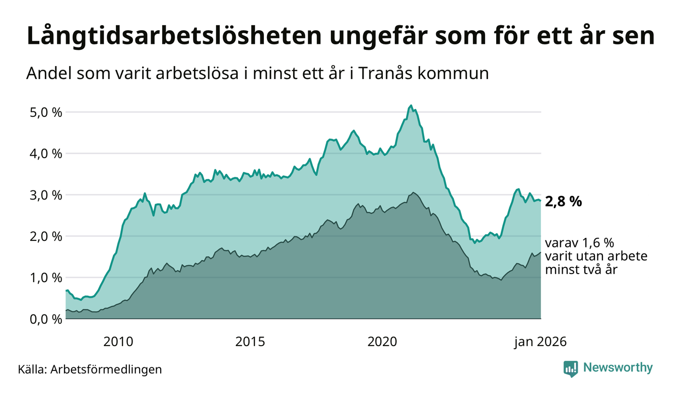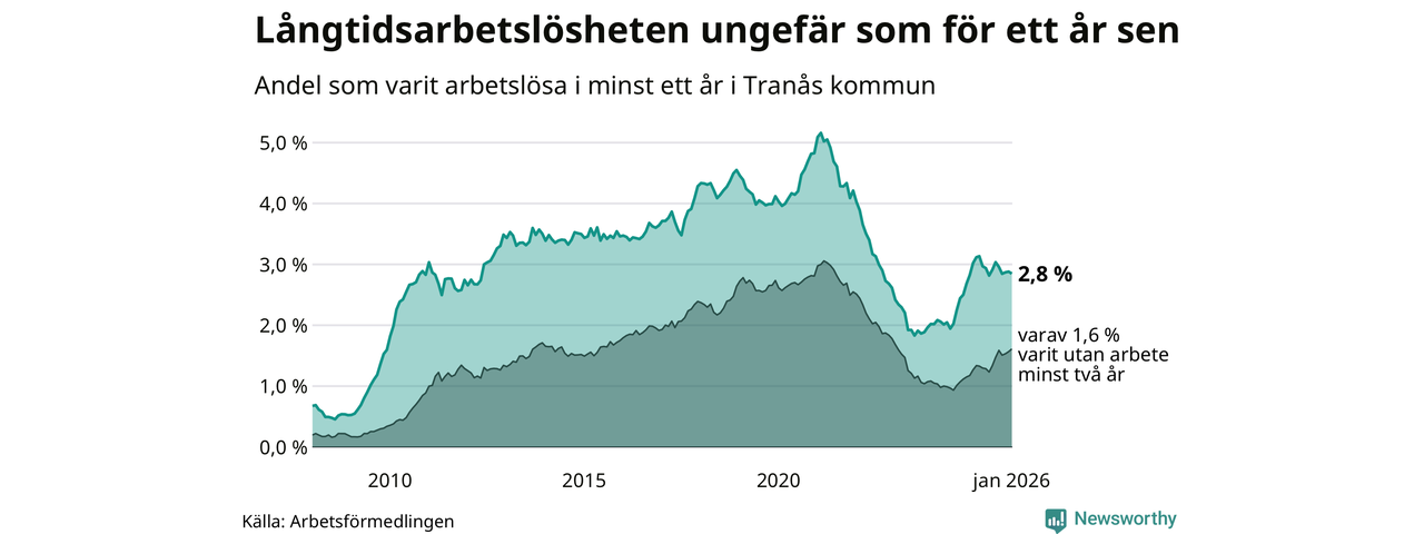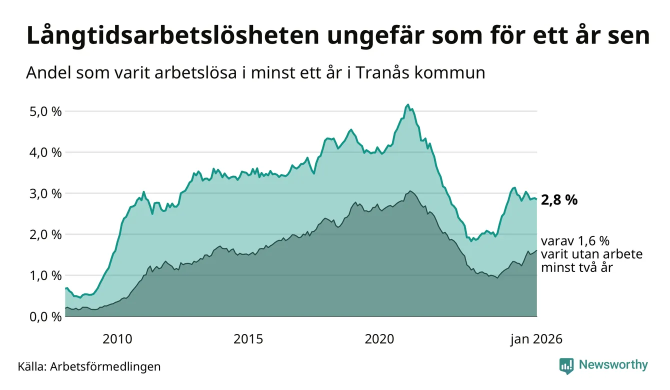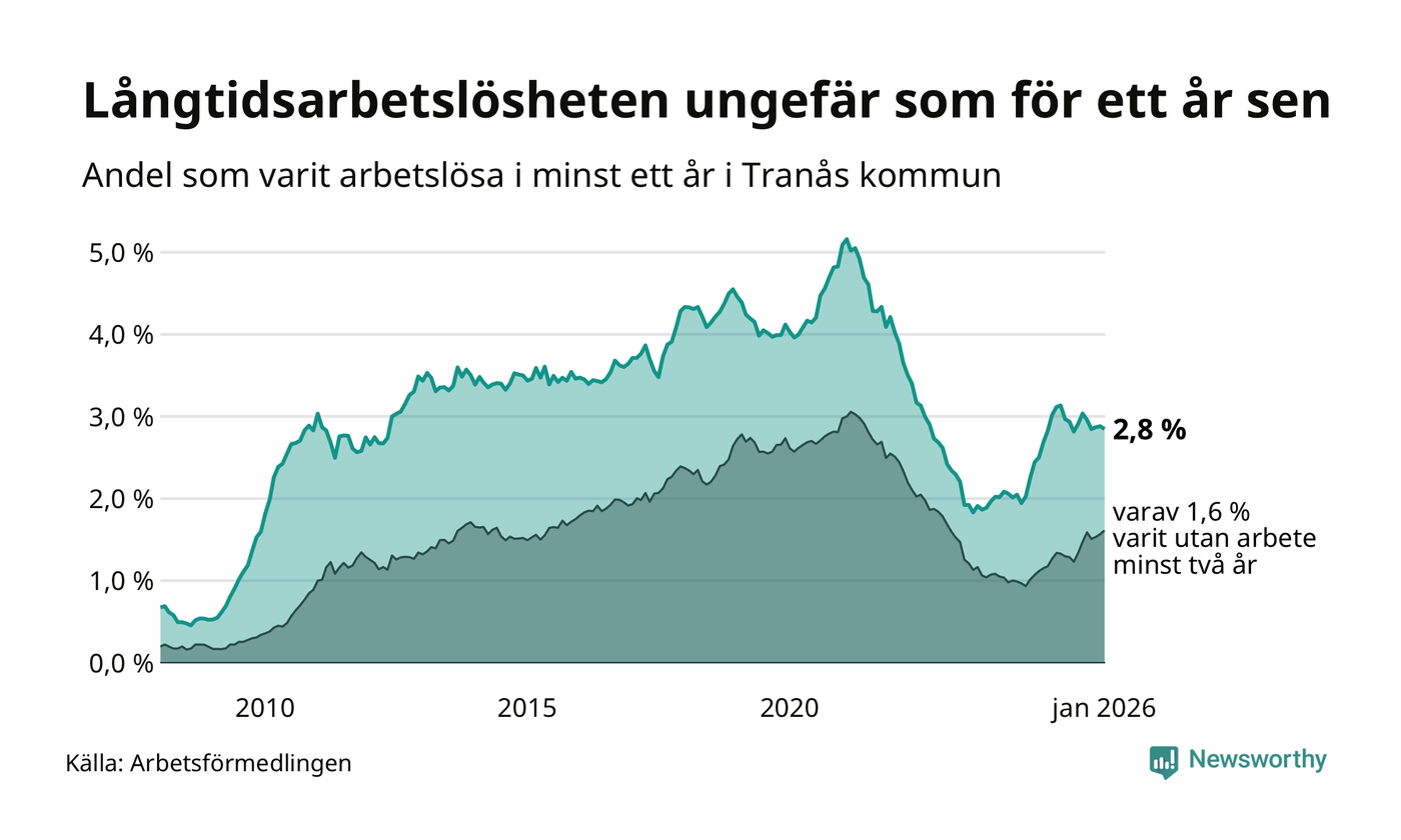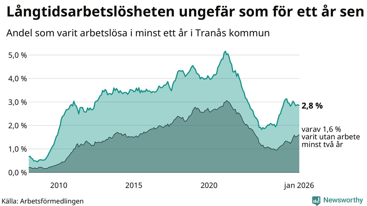 I januari hade 251 Tranåsbor varit arbetslösa i minst ett år, vilket är en färre än månaden innan. 251 personer motsvarar 2,8 procent av arbetskraften i kommunen – andelen långtidsarbetslösa är ungefär på samma nivå som för ett år sedan.