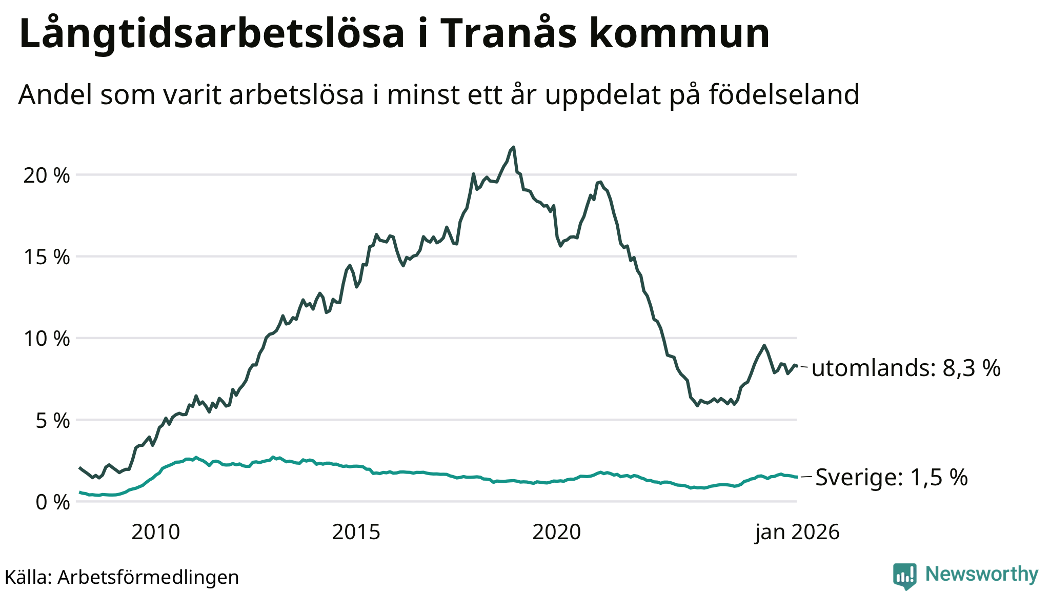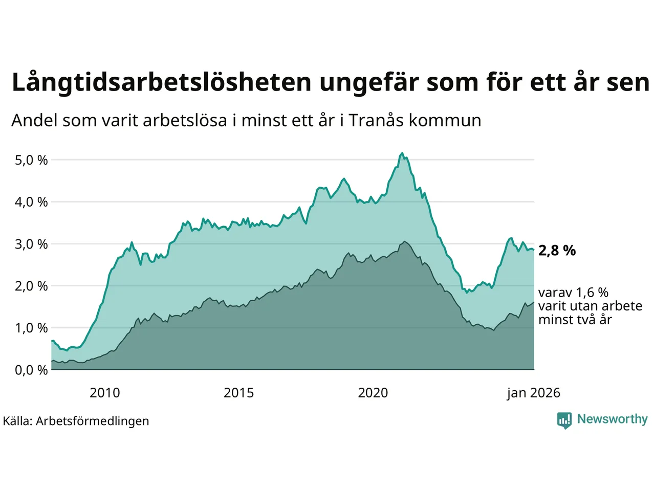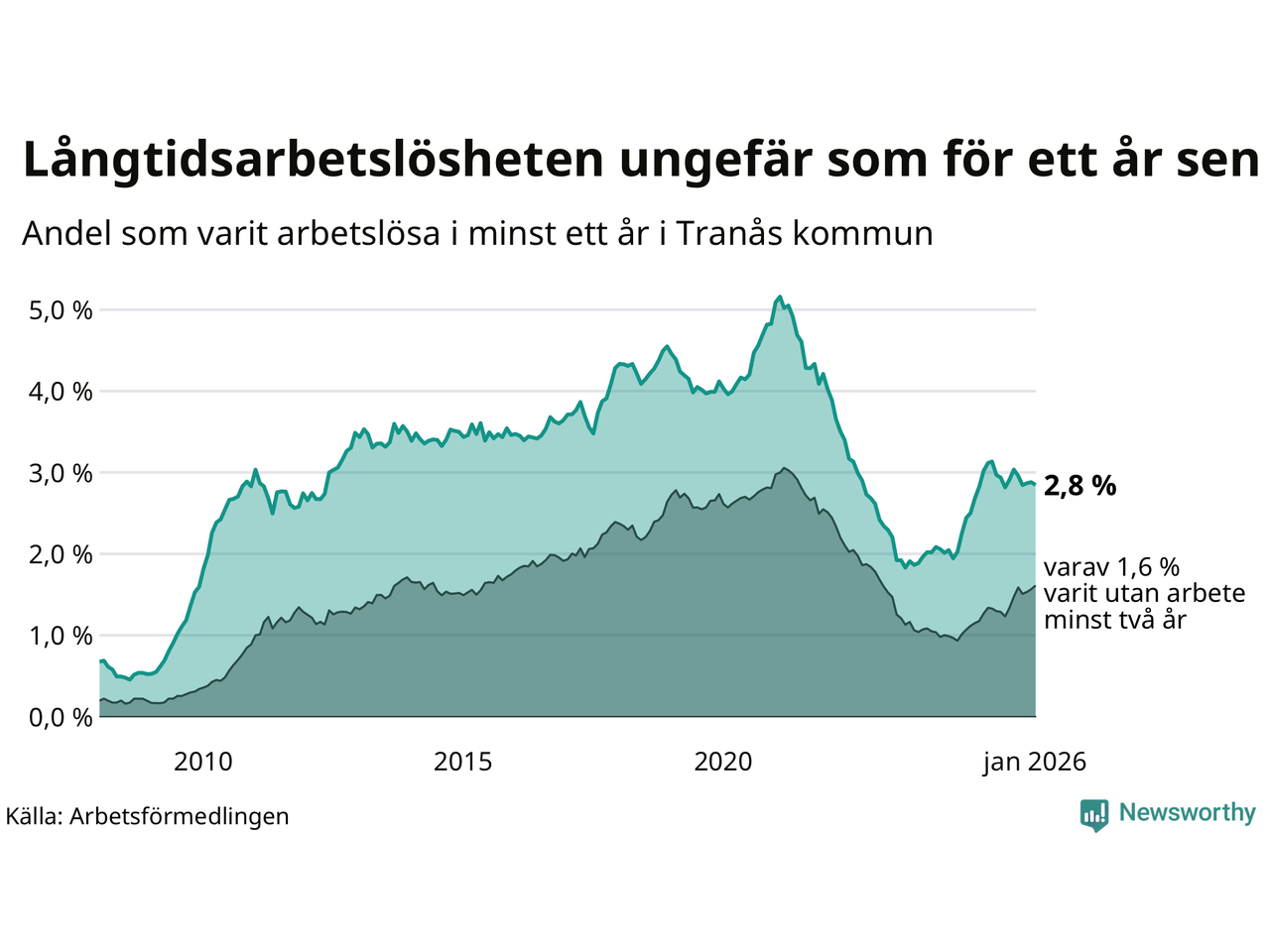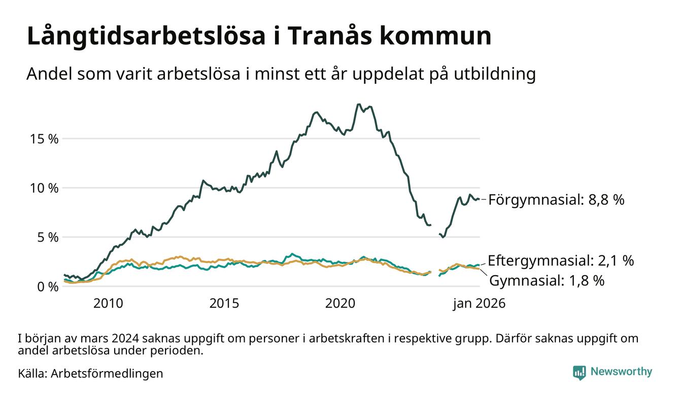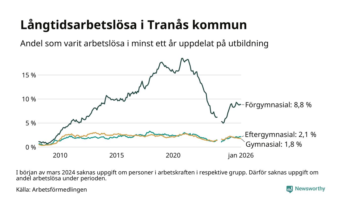 I januari hade 251 Tranåsbor varit arbetslösa i minst ett år, vilket är en färre än månaden innan. 251 personer motsvarar 2,8 procent av arbetskraften i kommunen – andelen långtidsarbetslösa är ungefär på samma nivå som för ett år sedan.