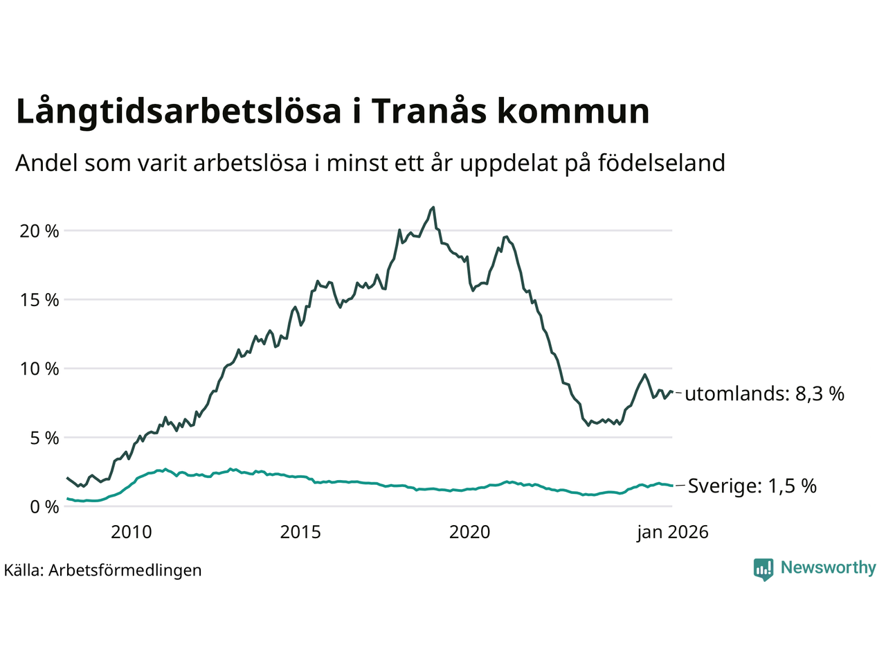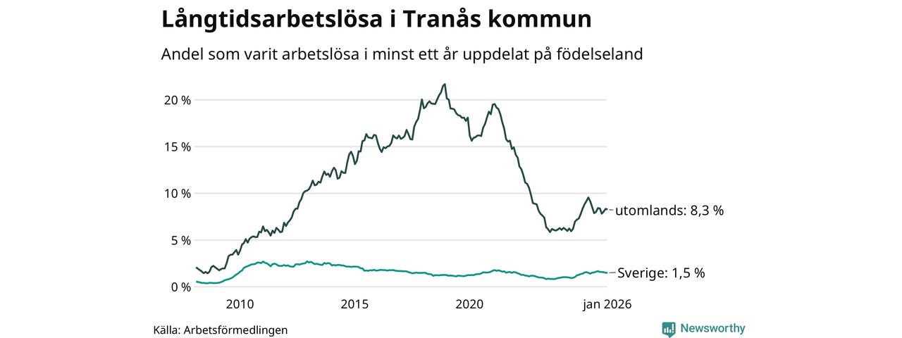 105 av de långtidsarbetslösa i Tranås är födda i Sverige, medan 146 är födda utomlands. Det innebär att långtidsarbetslösheten bland Sverigefödda är 1,5 procent, medan den är sex gånger så hög – 8,3 procent – bland födda utomlands. Även i riket som helhet är arbetslösheten högre bland utrikesfödda.