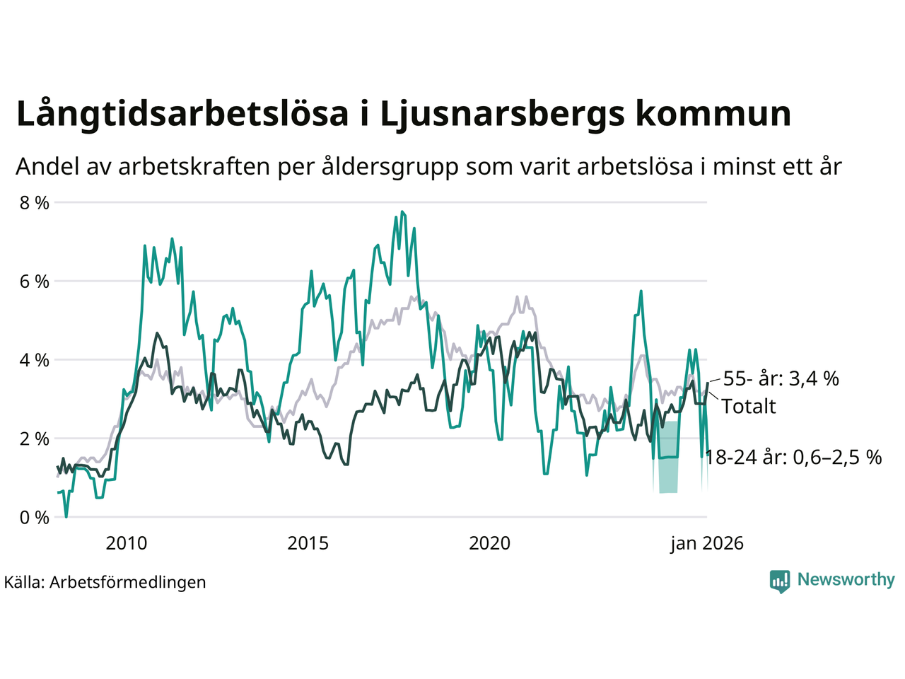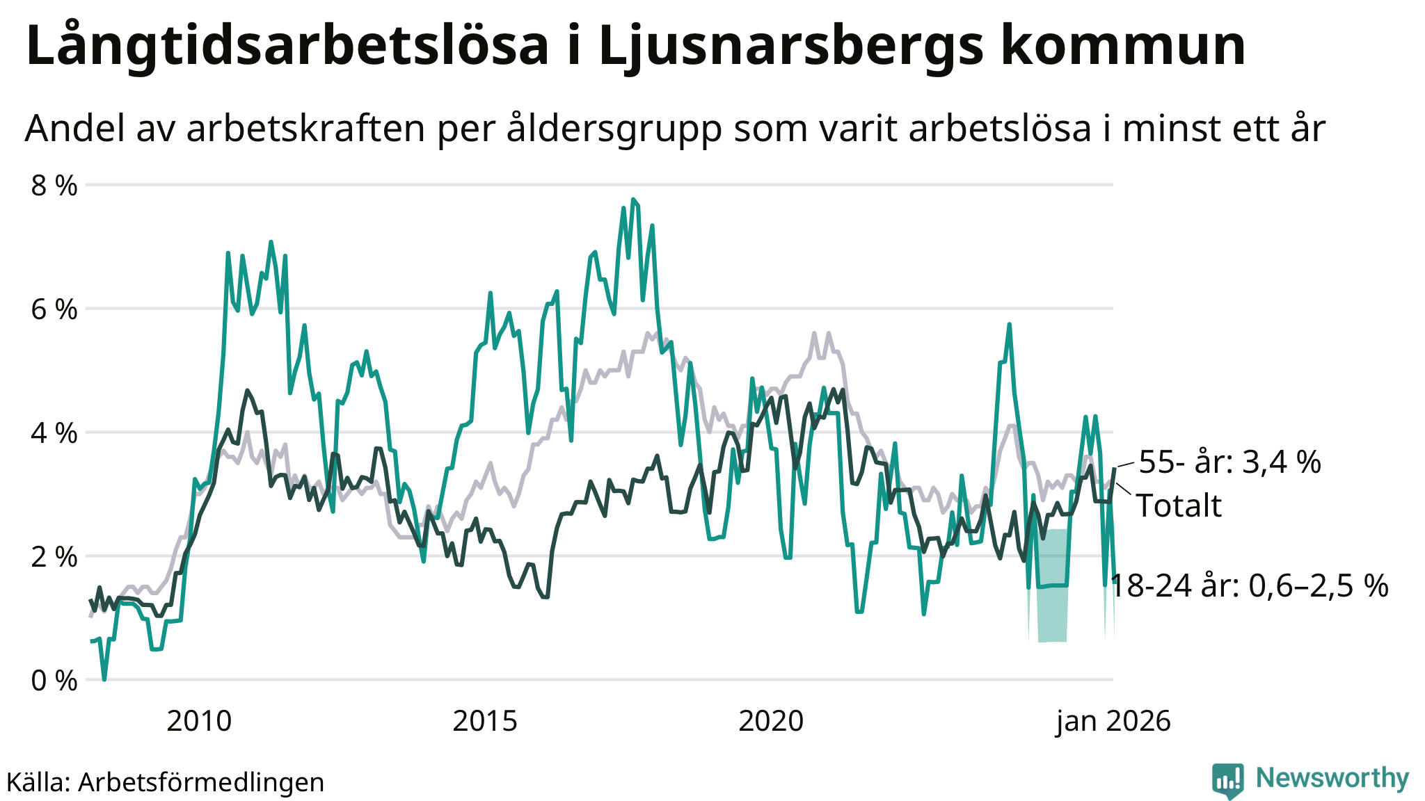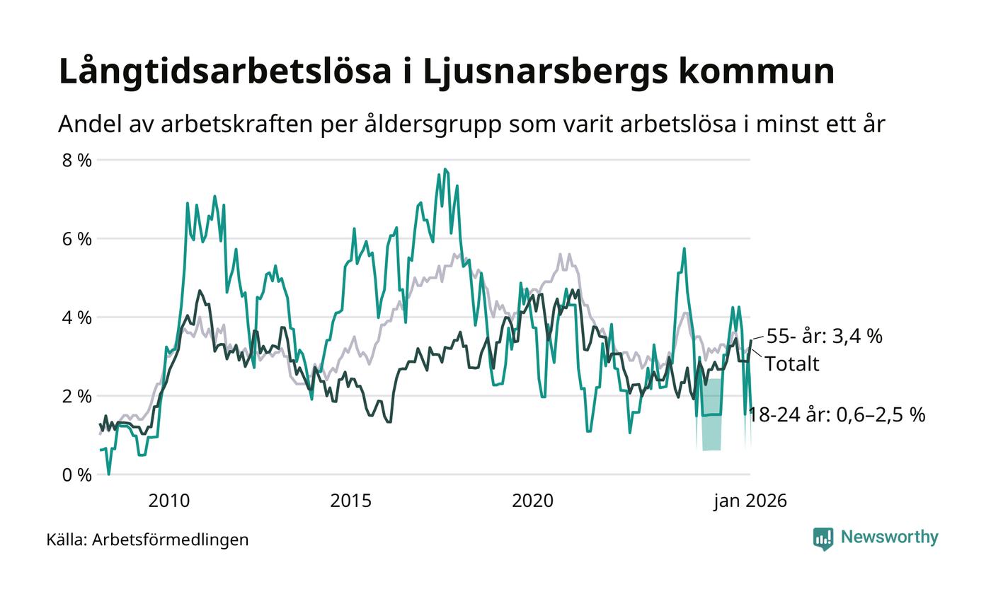 Av de 57 personerna som varit arbetslösa i mer än ett år i Ljusnarsbergs kommun är 18 personer mellan 55 och 661 år och mellan en och fyra är mellan 18 och 24 år. För den äldre gruppen är andelen arbetslösa 3,4 procent medan den i den yngre gruppen är mellan 0,6 och 2,5 procent. Även i riket som helhet är långtidsarbetslösheten högre i gruppen äldre.