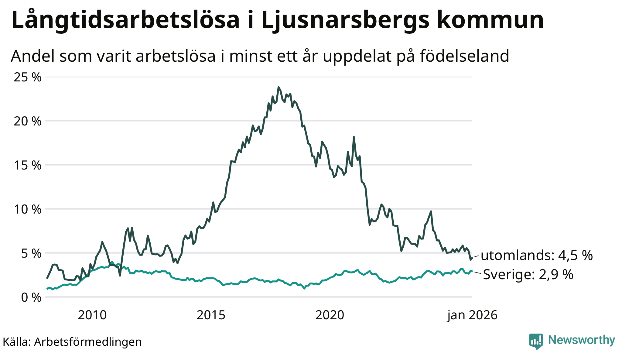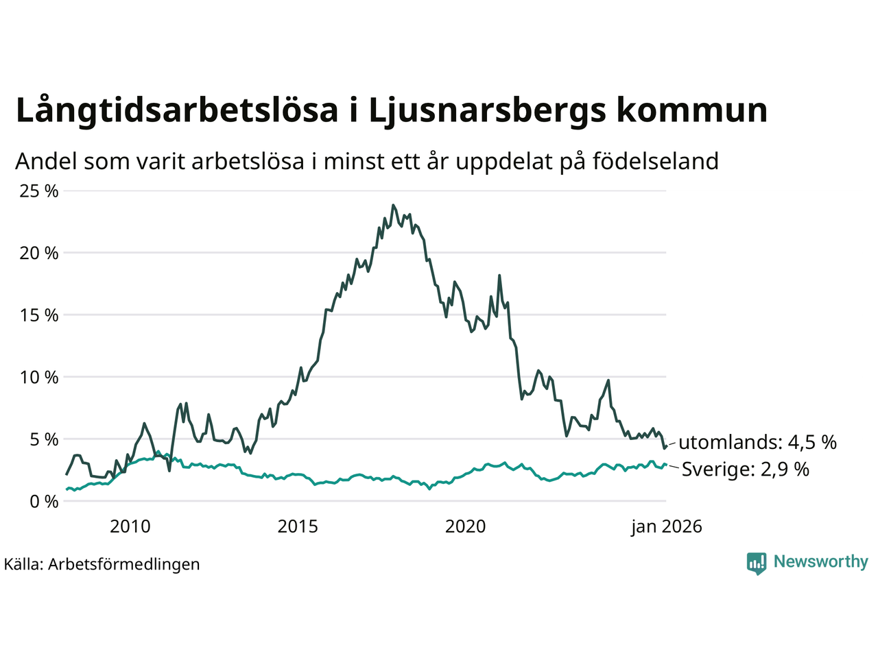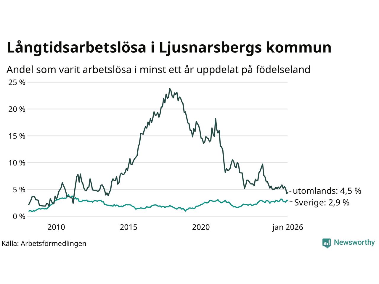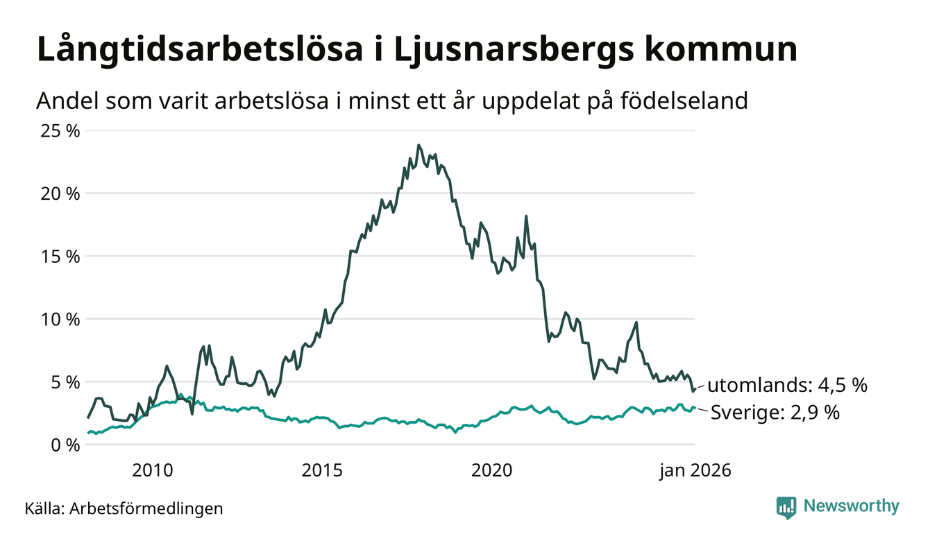 43 av de långtidsarbetslösa i Ljusnarsberg är födda i Sverige, medan 14 är födda utomlands. Det innebär att långtidsarbetslösheten bland Sverigefödda är 2,9 procent, medan den är 4,5 procent bland födda utomlands. Även i riket som helhet är arbetslösheten högre bland utrikesfödda.