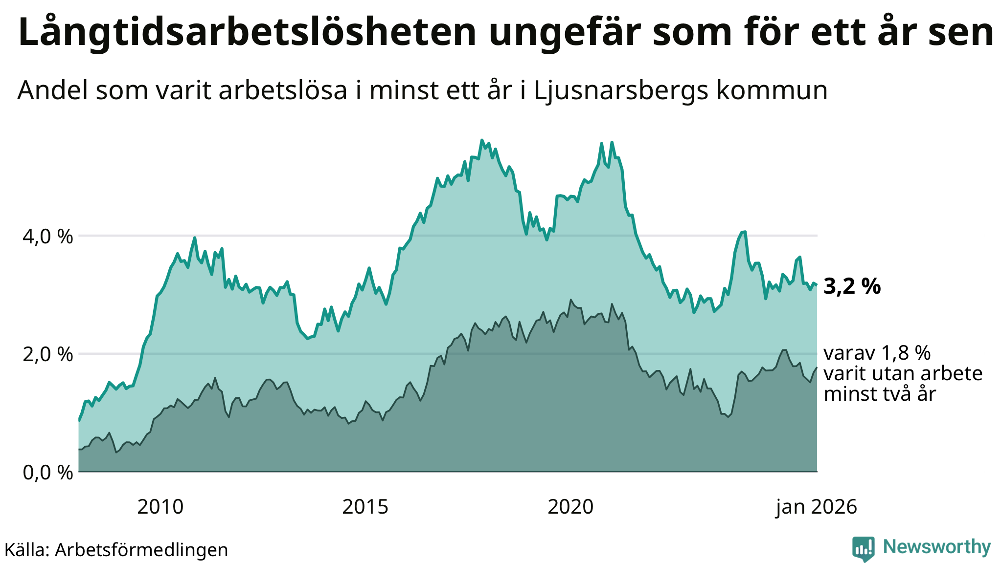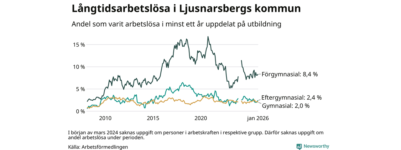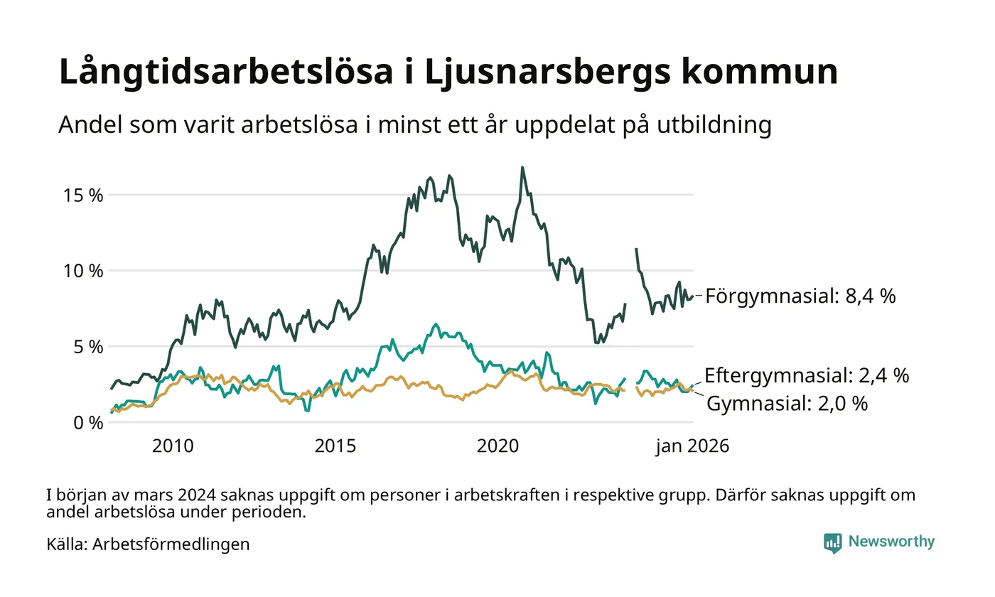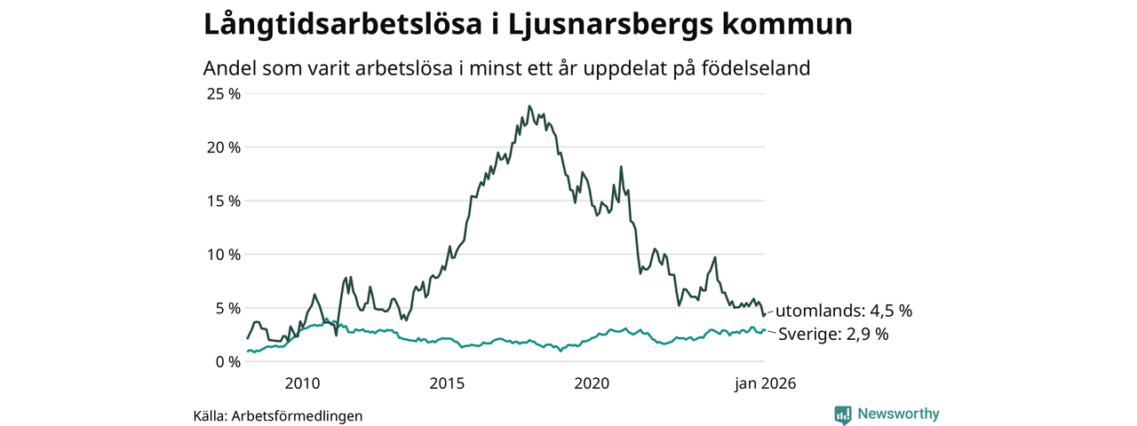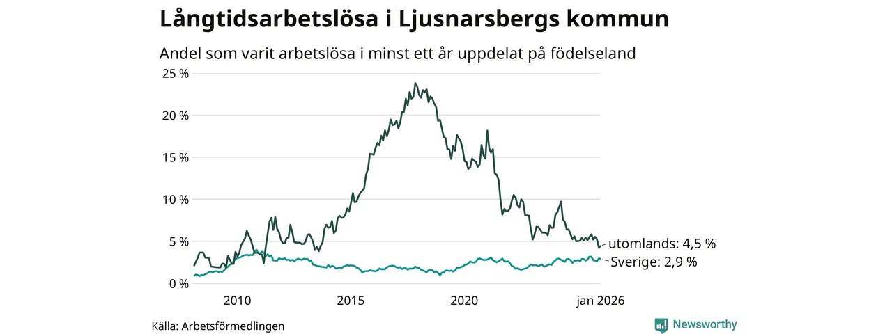 I januari hade 57 Ljusnarsbergsbor varit arbetslösa i minst ett år, vilket är lika många som månaden innan. 57 personer motsvarar 3,2 procent av arbetskraften i kommunen – andelen långtidsarbetslösa är ungefär på samma nivå som för ett år sedan.