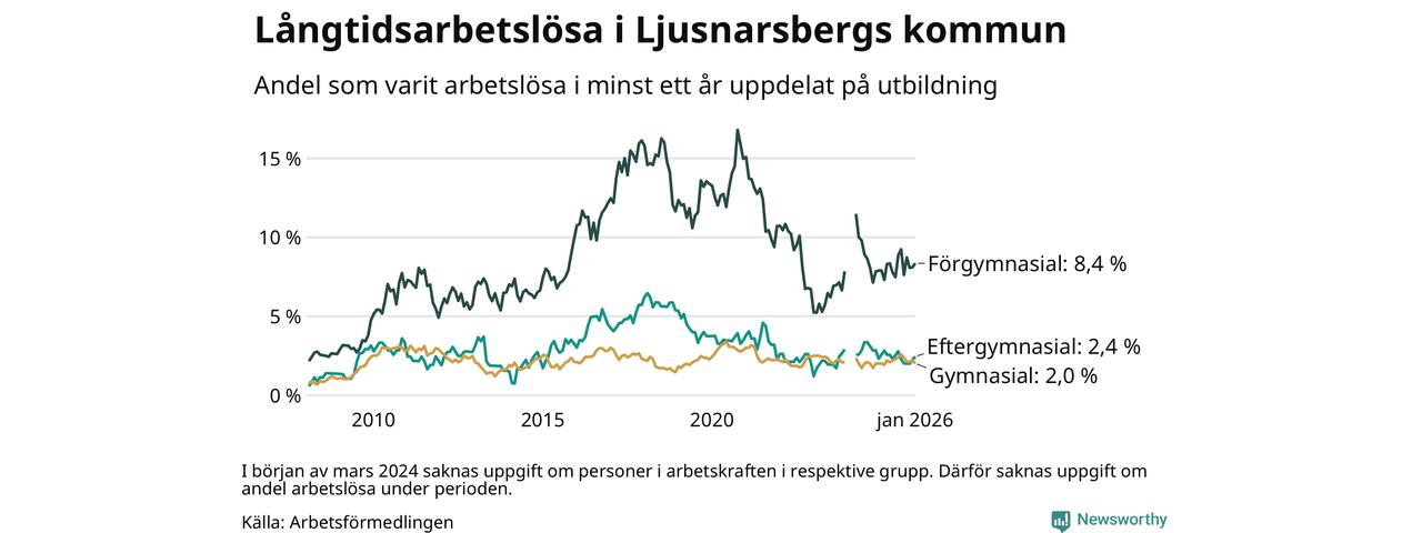 Andelen långtidsarbetslösa i Ljusnarsberg är den näst högsta i Örebro län, bara i Örebro är andelen högre 3,4 procent.I Askersund finns länets lägsta långtidsarbetslöshet, 1,6 procent. I Örebro län som helhet hade 4 385 personer (2,9 procent) varit arbetslösa i minst ett år i januari. Det är 55 personer fler än månaden innan.