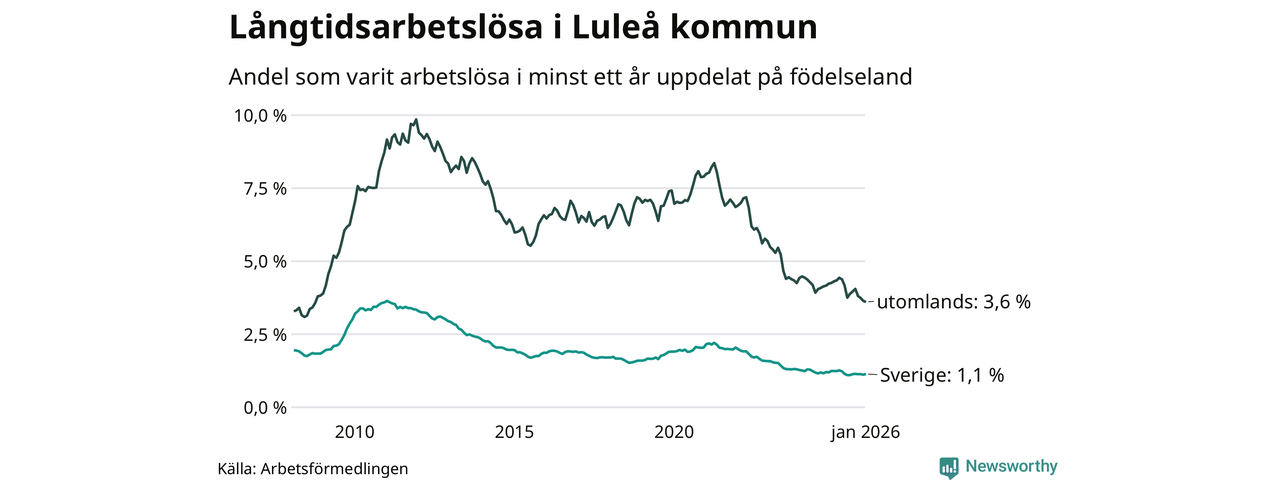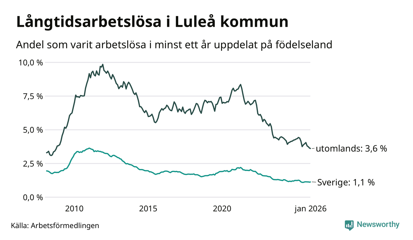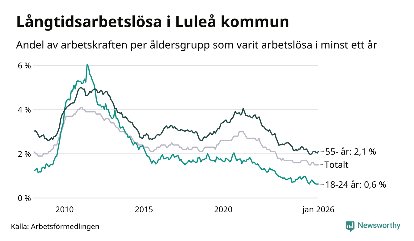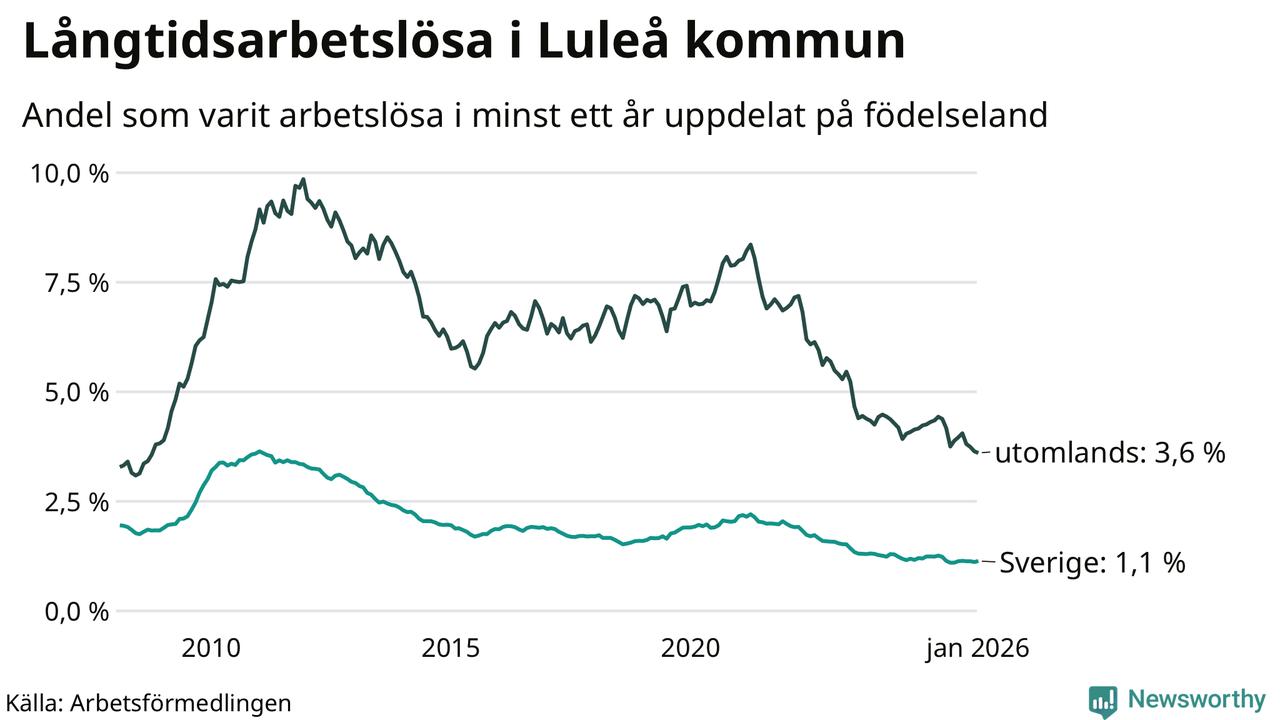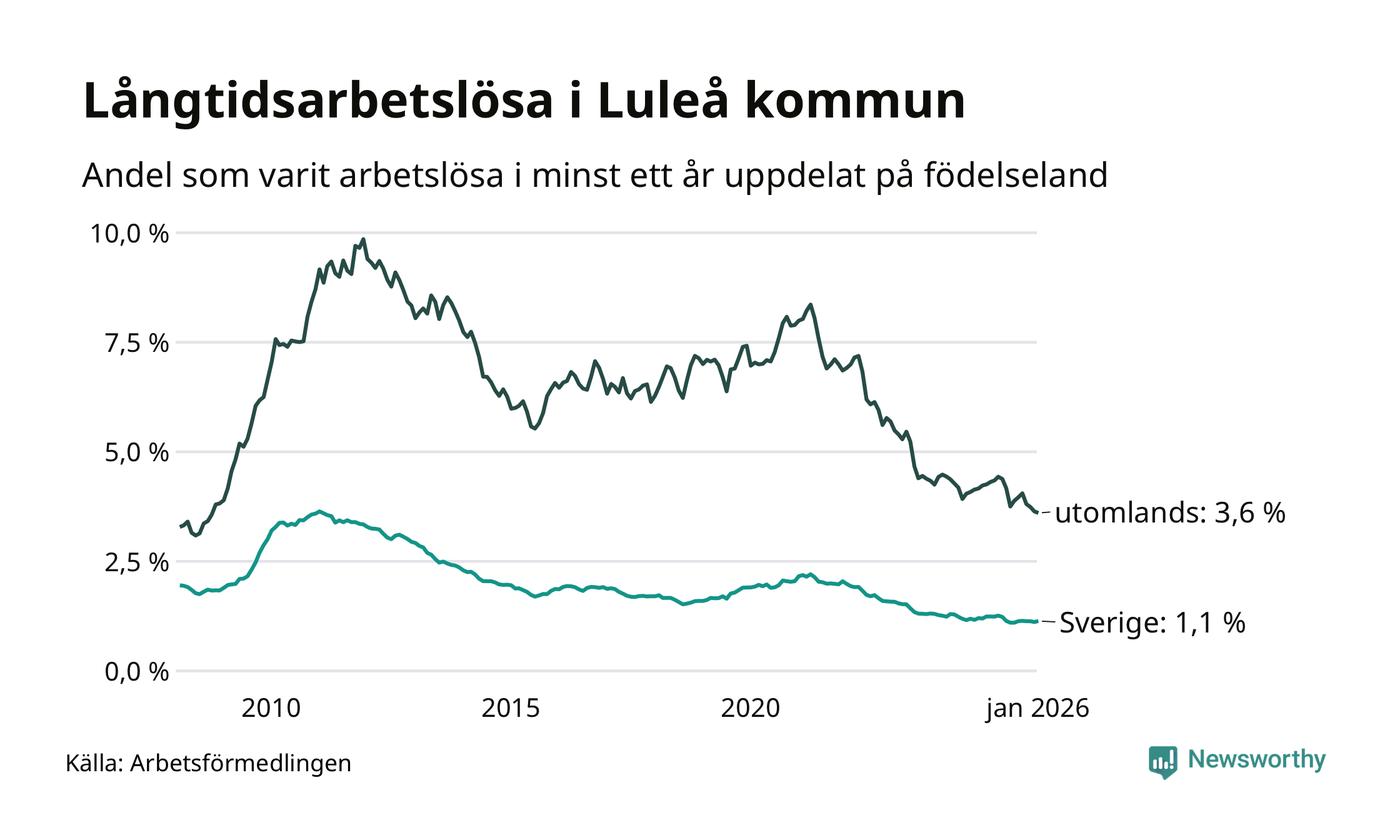 I januari hade 635 Luleåbor varit arbetslösa i minst ett år, vilket är elva fler än månaden innan. 635 personer motsvarar 1,5 procent av arbetskraften i kommunen – andelen långtidsarbetslösa är 0,2 procentenheter lägre än samma månad för ett år sedan.