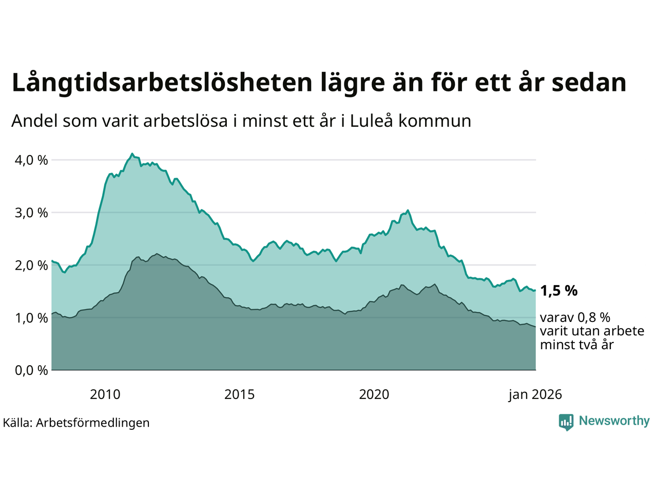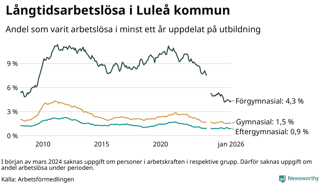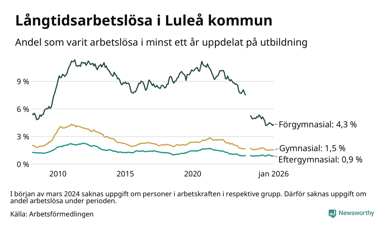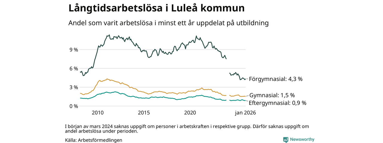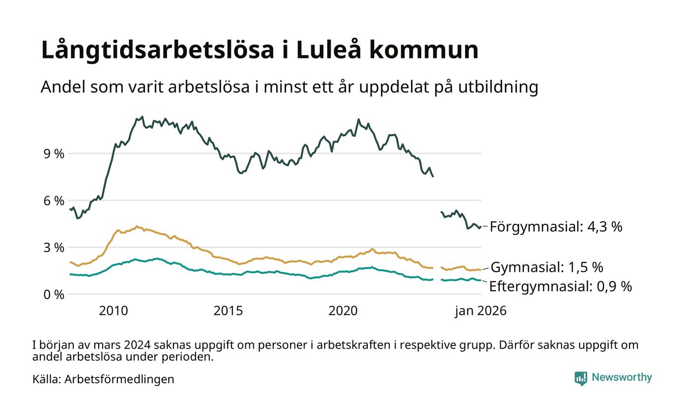 I januari hade 635 Luleåbor varit arbetslösa i minst ett år, vilket är elva fler än månaden innan. 635 personer motsvarar 1,5 procent av arbetskraften i kommunen – andelen långtidsarbetslösa är 0,2 procentenheter lägre än samma månad för ett år sedan.