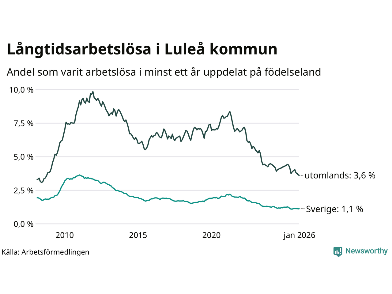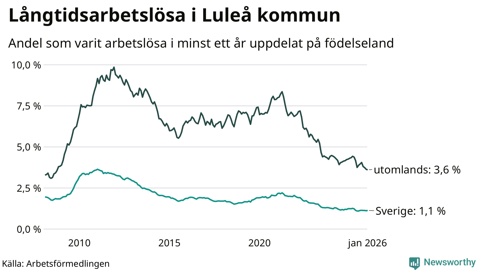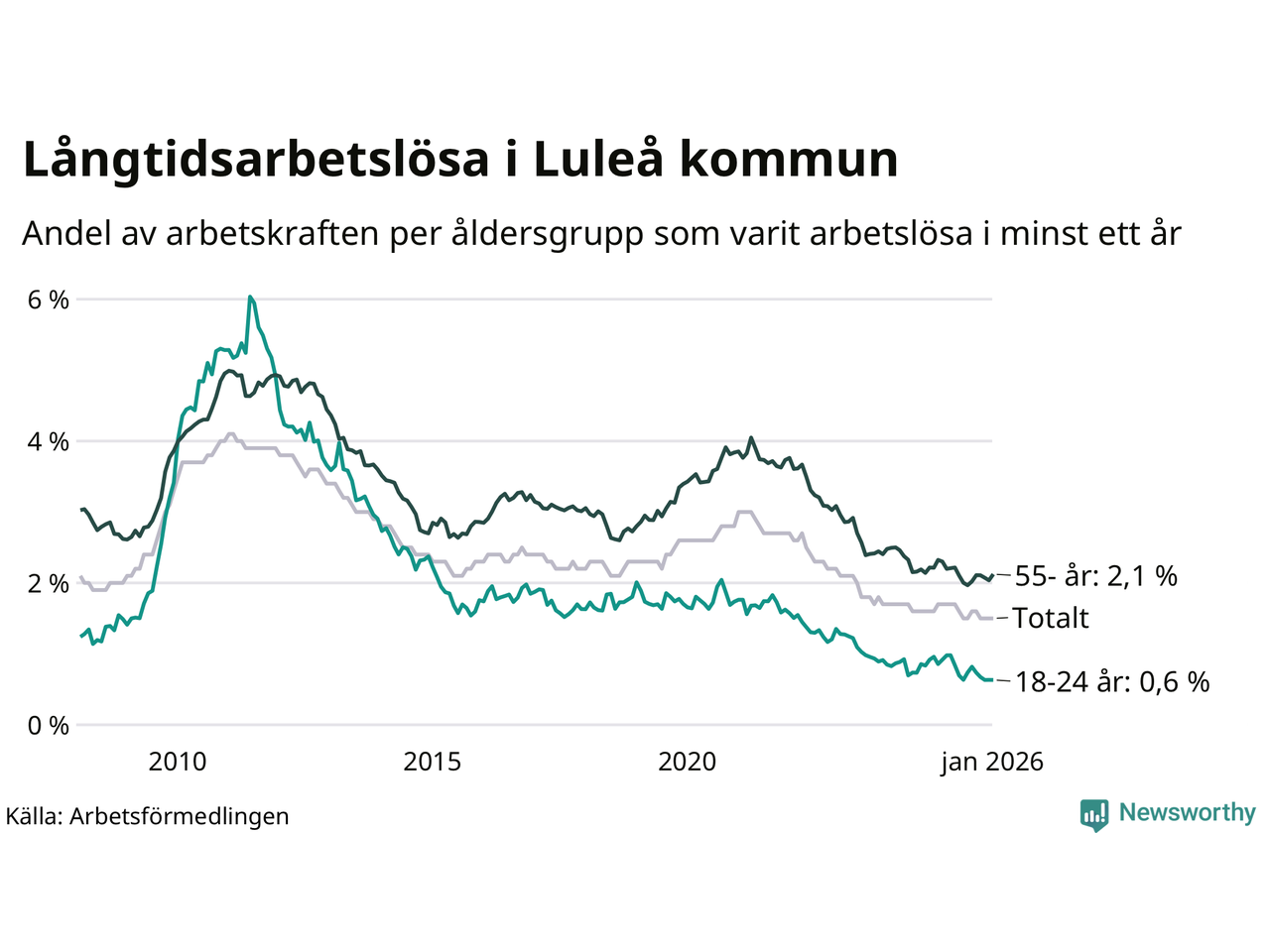 | Andel arbetslösa i minst två år | 0,8 % | 0,7 % | 1,6 % |