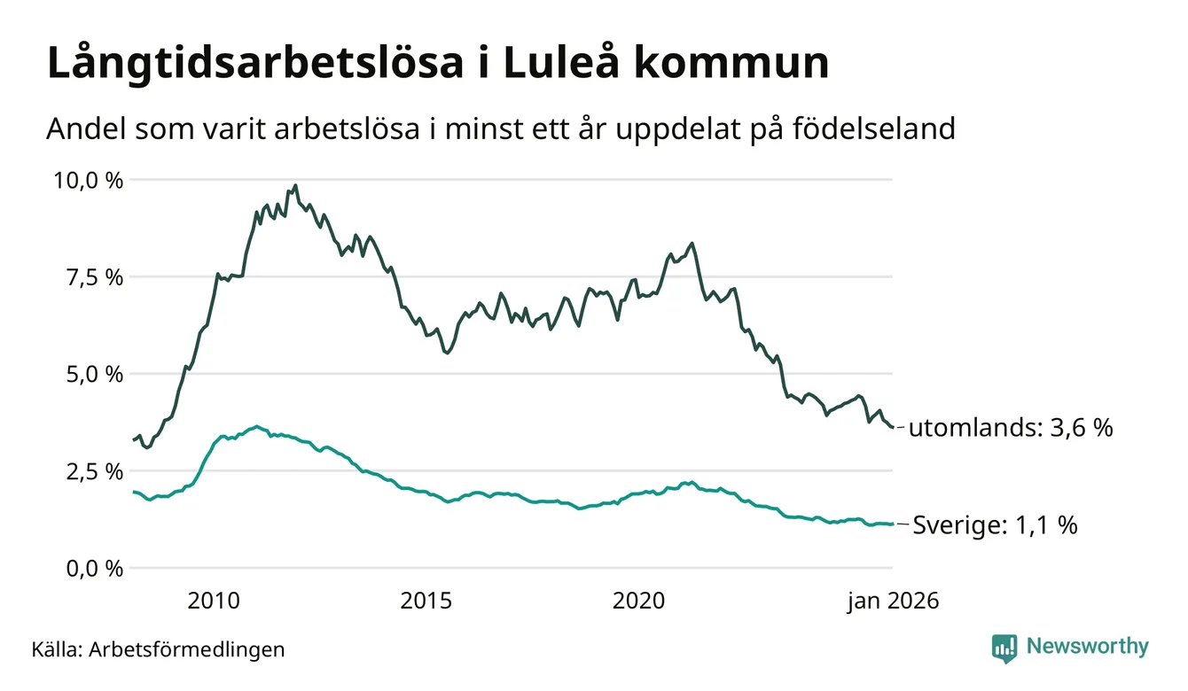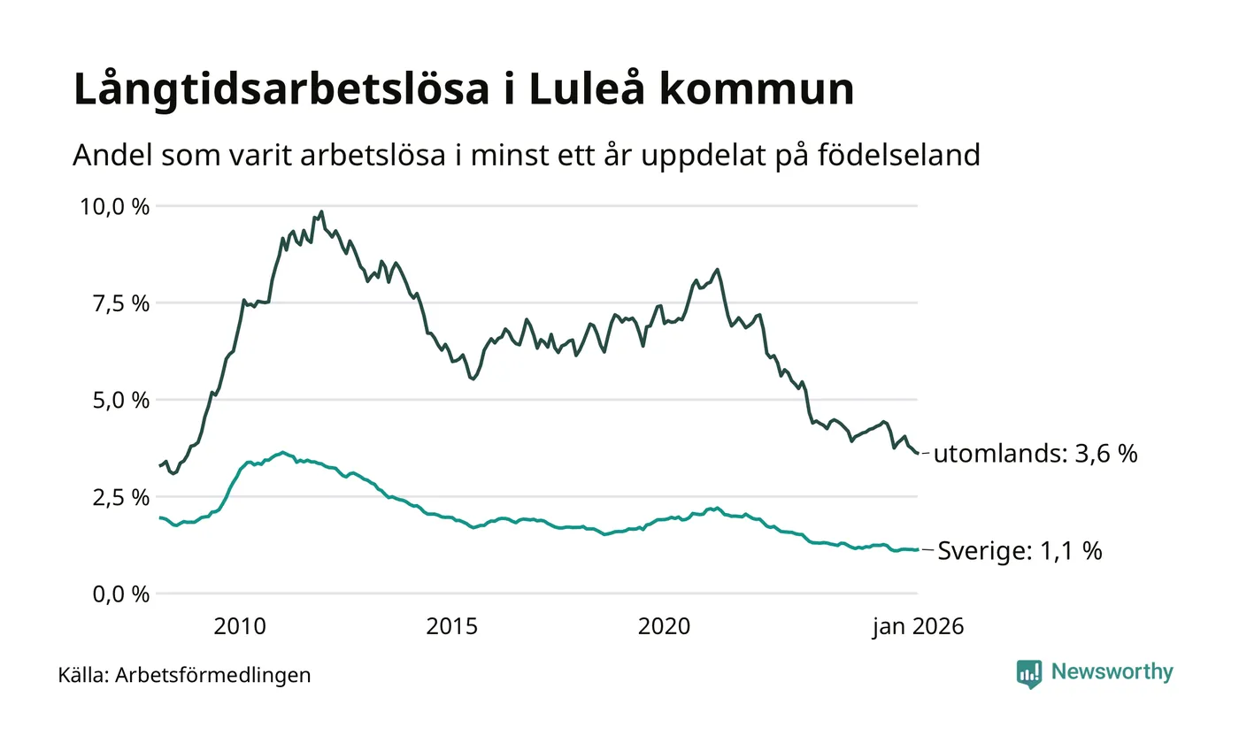 401 av de långtidsarbetslösa i Luleå är födda i Sverige, medan 234 är födda utomlands. Det innebär att långtidsarbetslösheten bland Sverigefödda är 1,1 procent, medan den är tre gånger så hög – 3,6 procent – bland födda utomlands. Även i riket som helhet är arbetslösheten högre bland utrikesfödda.