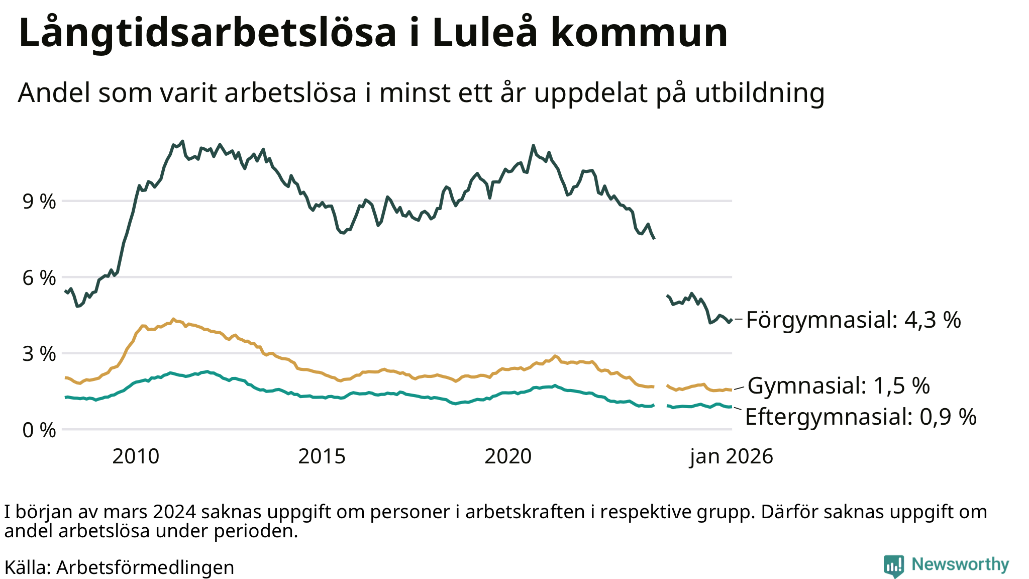 | Bland dem med eftergymnasial utbildning | 0,9 % | 0,8 % | 1,9 % |