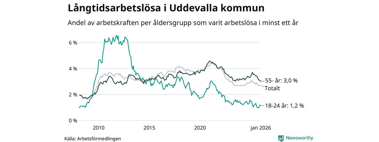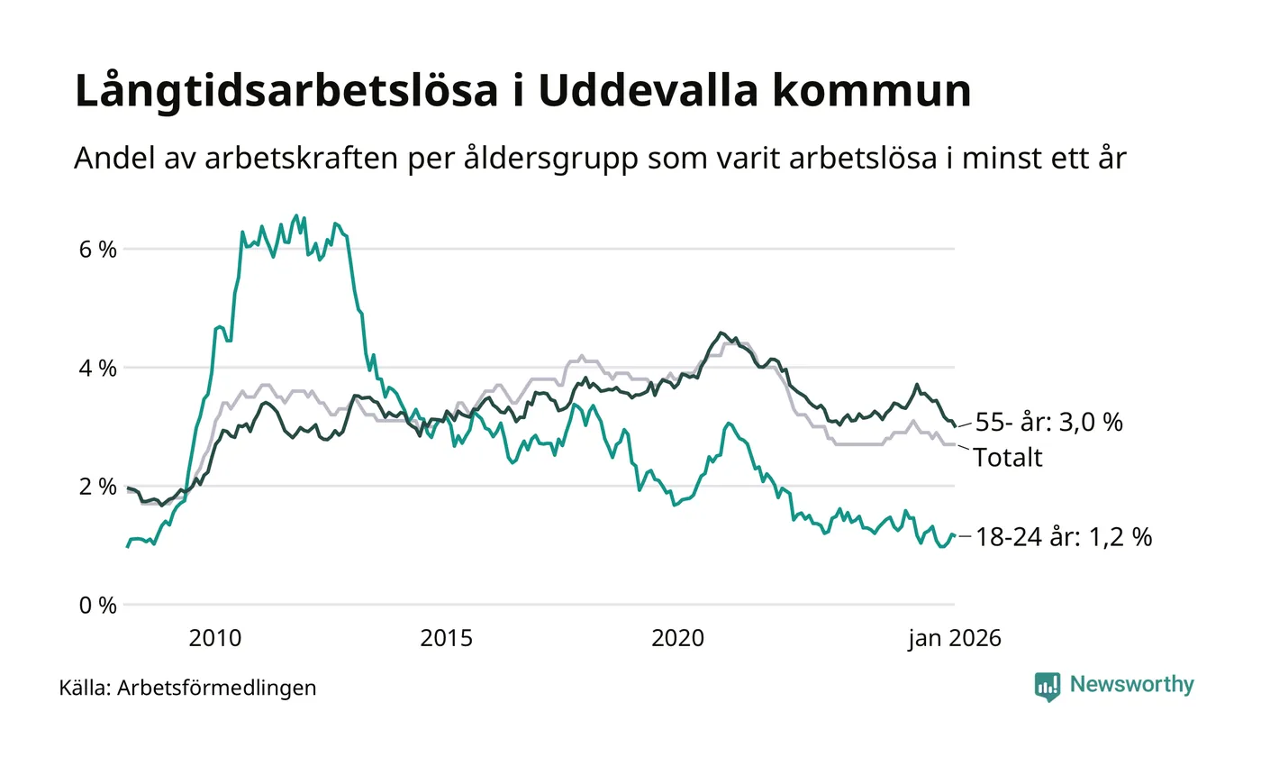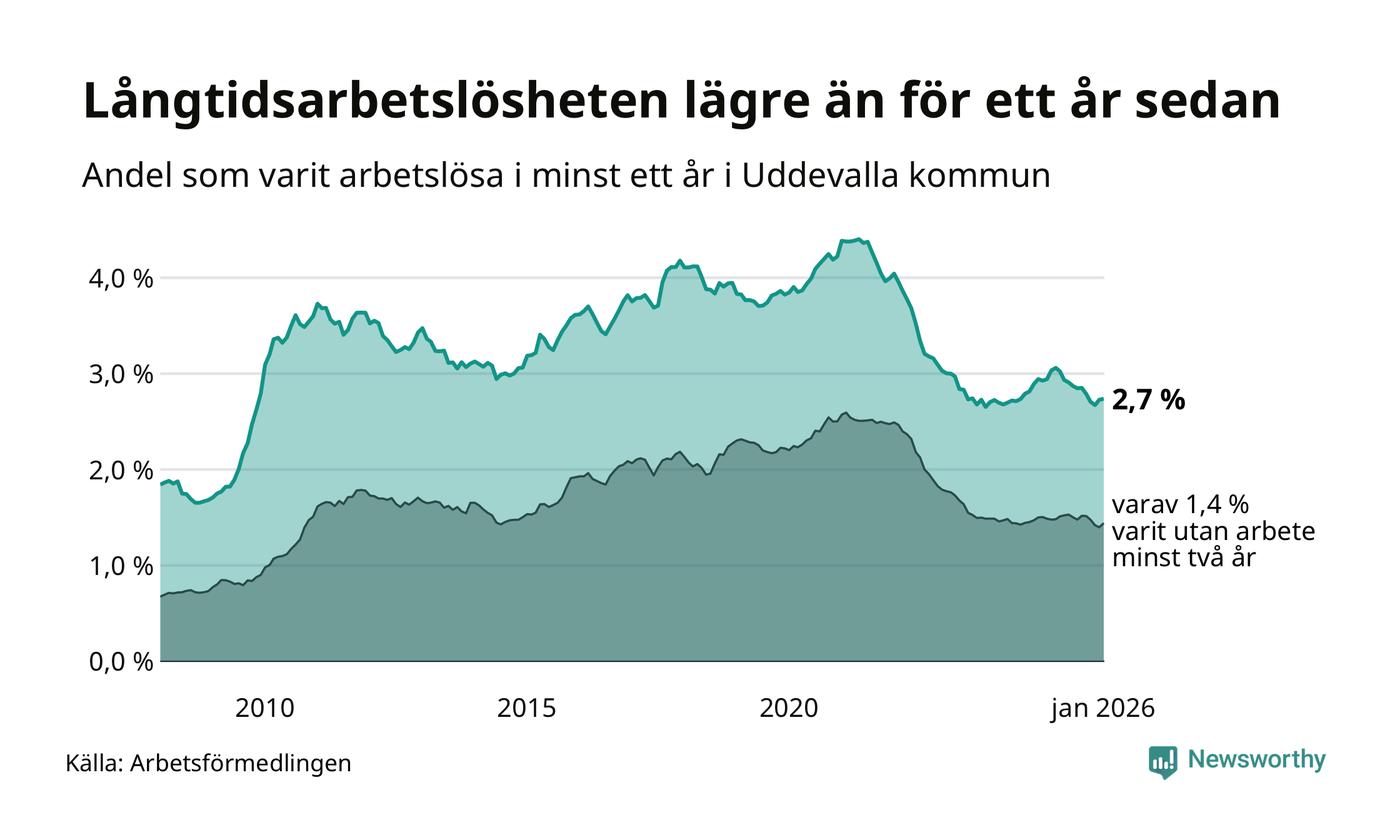 I januari hade 764 Uddevallabor varit arbetslösa i minst ett år, vilket är nio fler än månaden innan. 764 personer motsvarar 2,7 procent av arbetskraften i kommunen – andelen långtidsarbetslösa är 0,3 procentenheter lägre än samma månad för ett år sedan.
