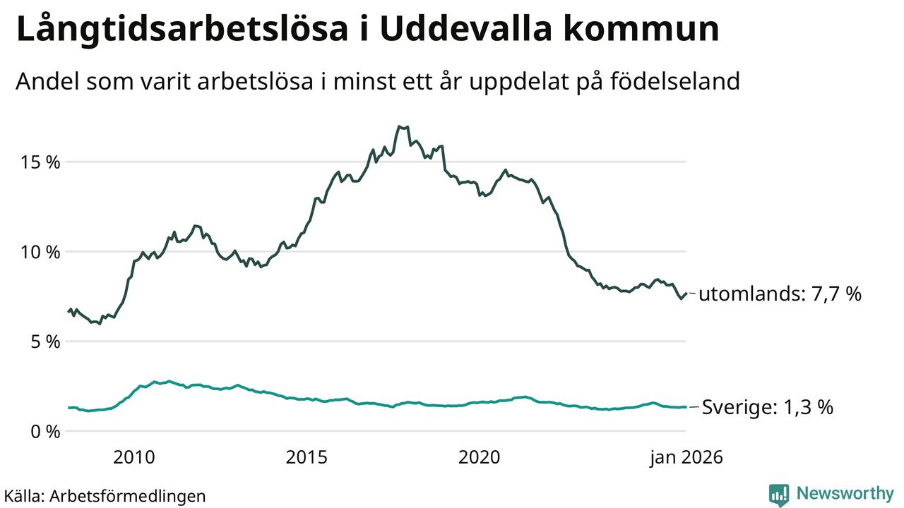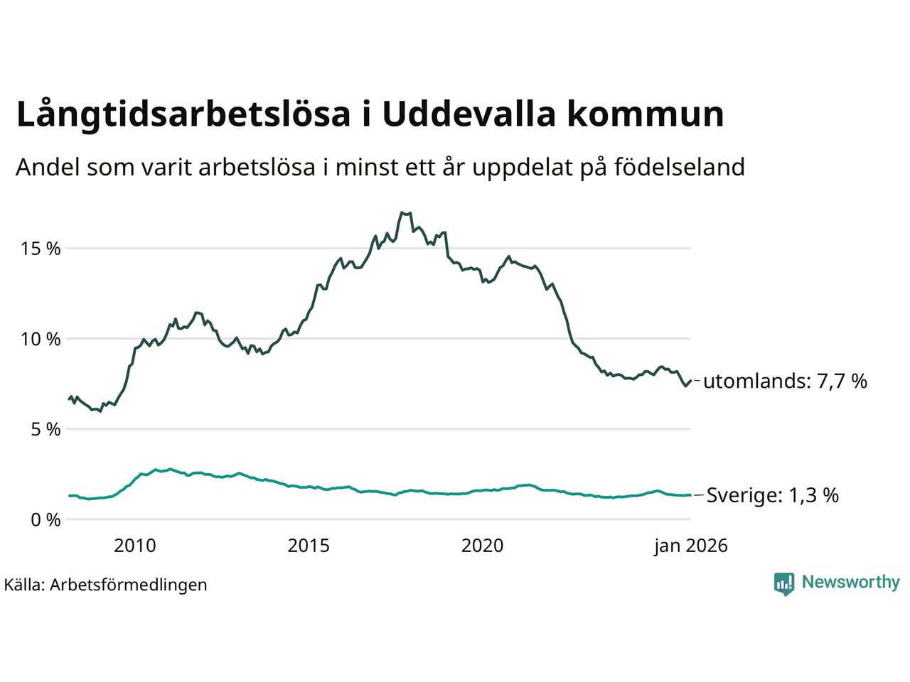286 av de långtidsarbetslösa i Uddevalla är födda i Sverige, medan 478 är födda utomlands. Det innebär att långtidsarbetslösheten bland Sverigefödda är 1,3 procent, medan den är sex gånger så hög – 7,7 procent – bland födda utomlands. Även i riket som helhet är arbetslösheten högre bland utrikesfödda.