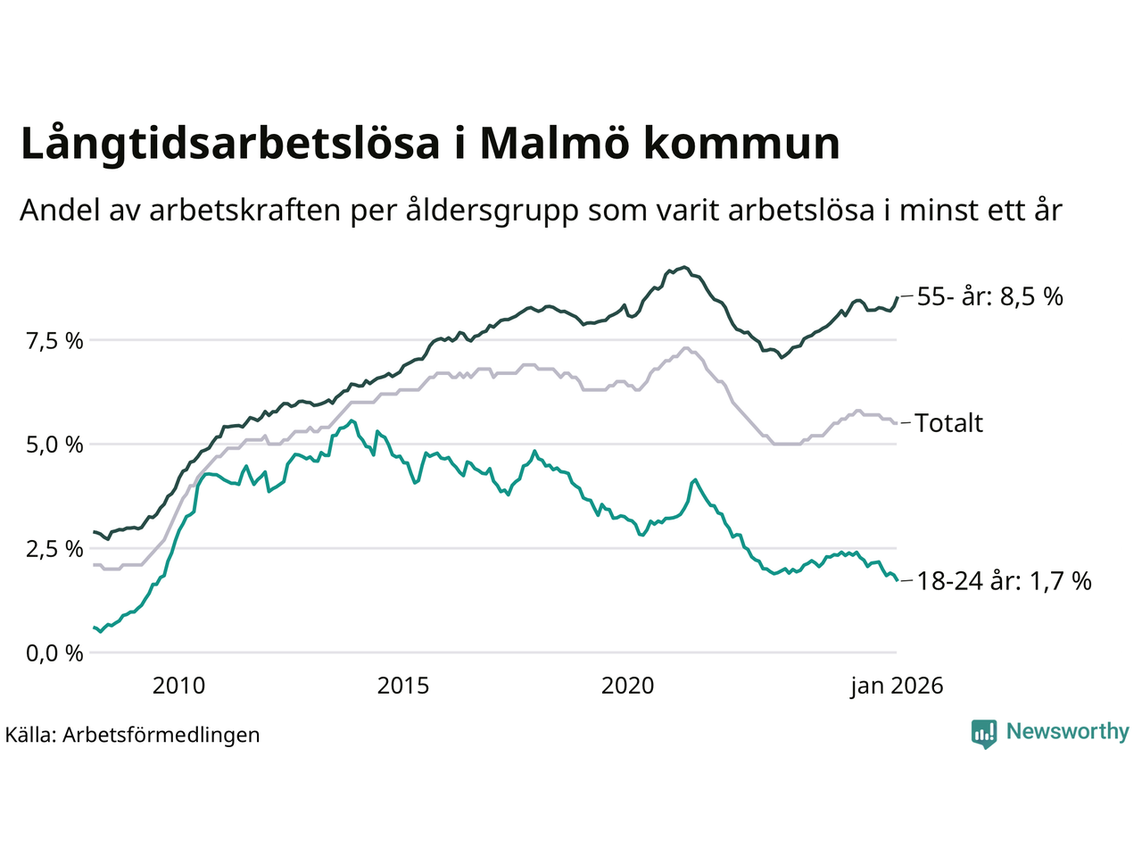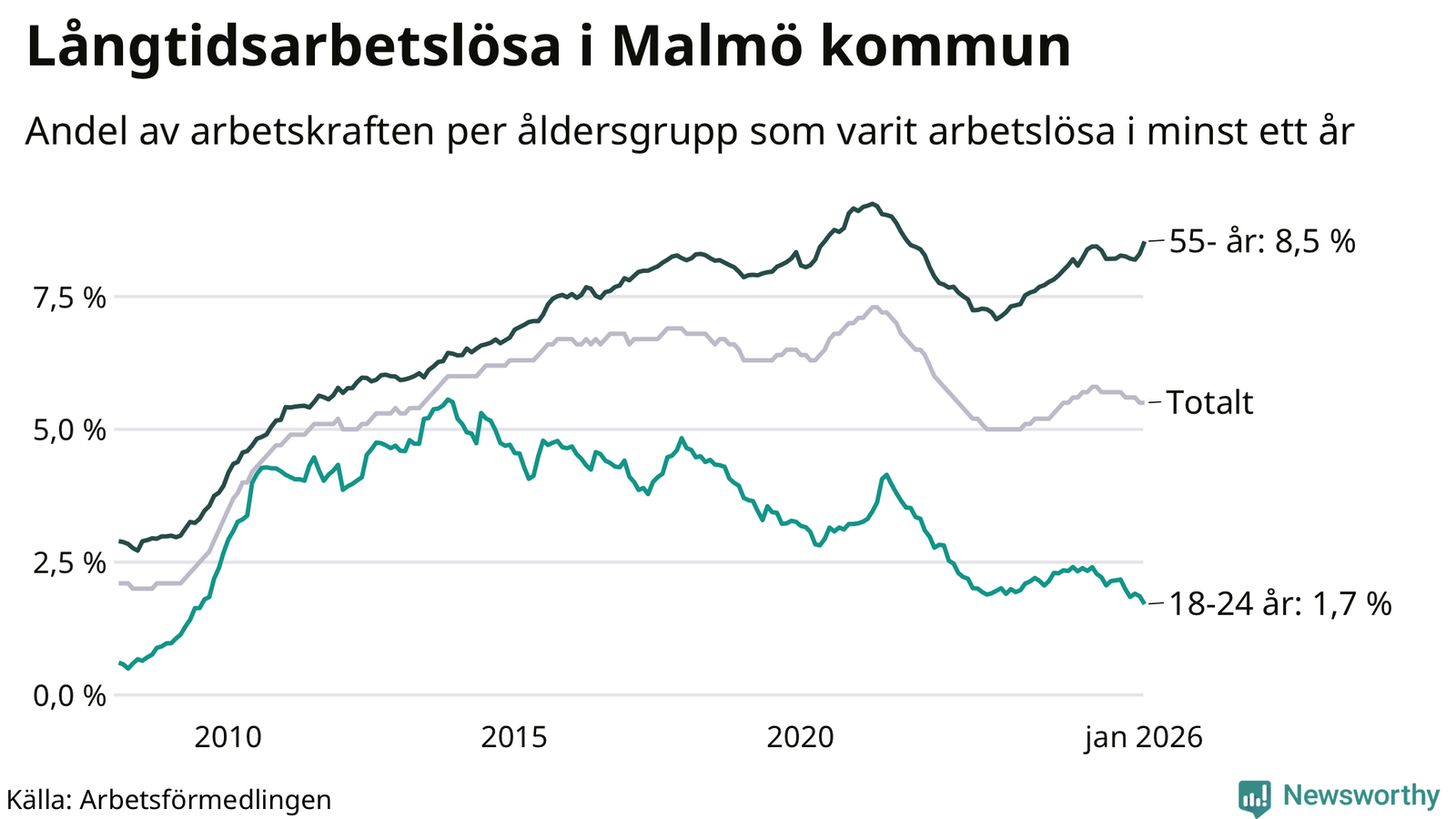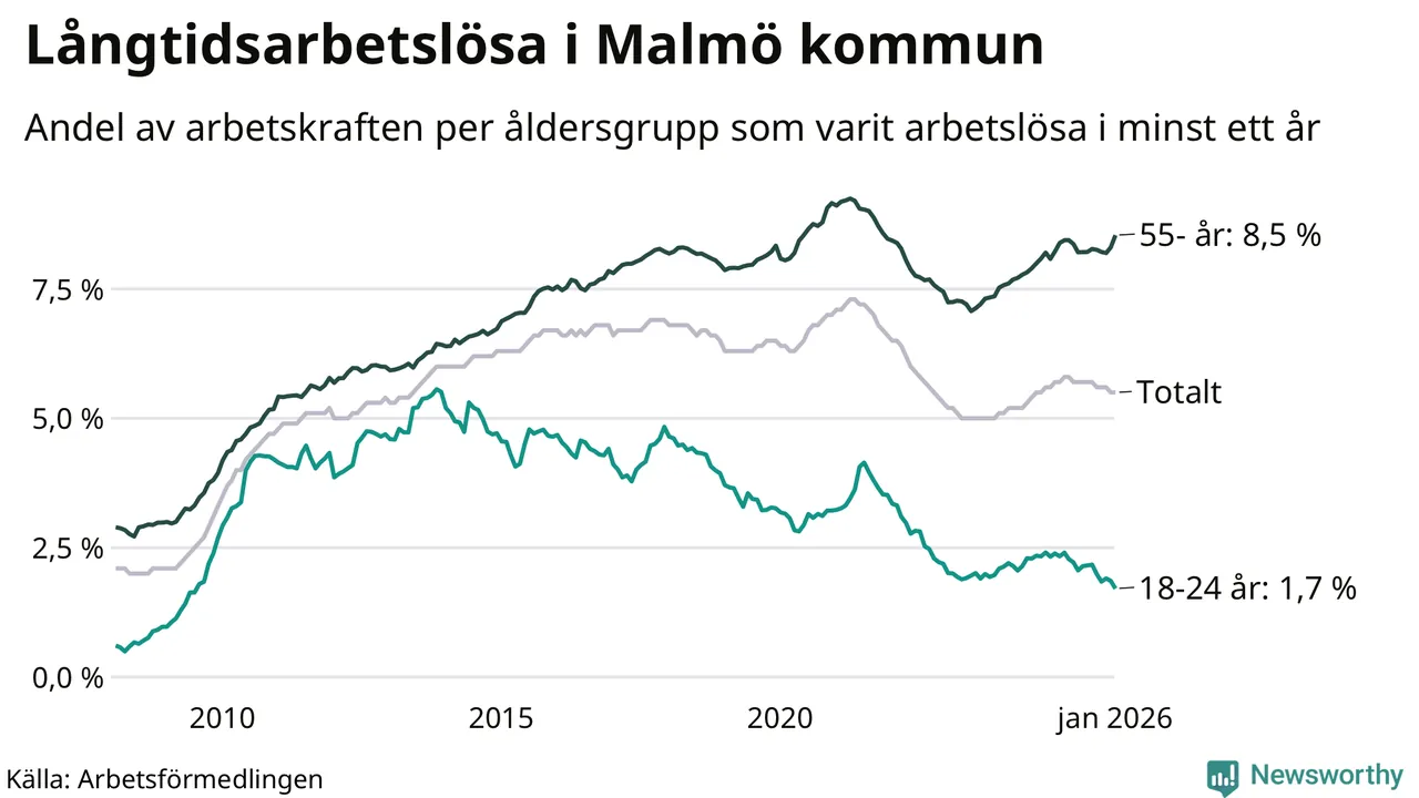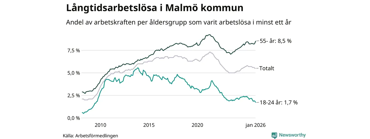 Av de 10 584 personerna som varit arbetslösa i mer än ett år i Malmö kommun är 2 674 personer mellan 55 och 661 år och 300 är mellan 18 och 24 år. För den äldre gruppen är andelen arbetslösa 8,5 procent medan den i den yngre gruppen är 1,7 procent. Även i riket som helhet är långtidsarbetslösheten högre i gruppen äldre.