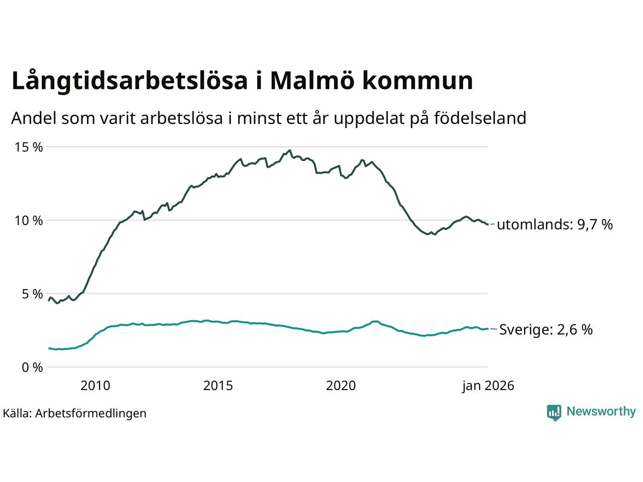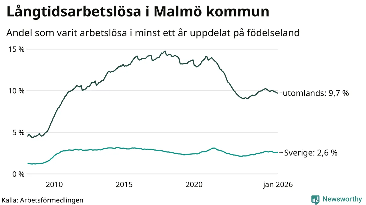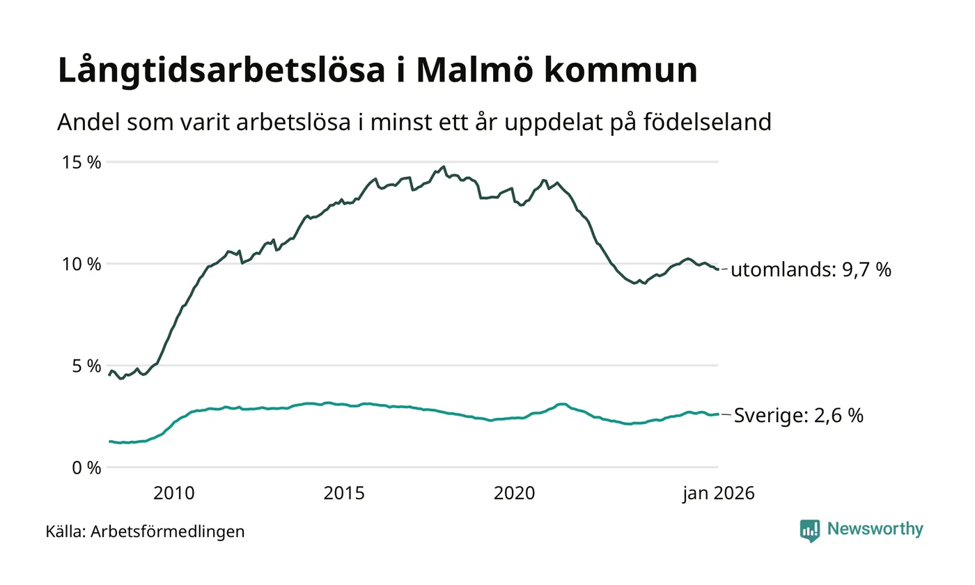 2 923 av de långtidsarbetslösa i Malmö är födda i Sverige, medan 7 661 är födda utomlands. Det innebär att långtidsarbetslösheten bland Sverigefödda är 2,6 procent, medan den är fyra gånger så hög – 9,7 procent – bland födda utomlands. Även i riket som helhet är arbetslösheten högre bland utrikesfödda.