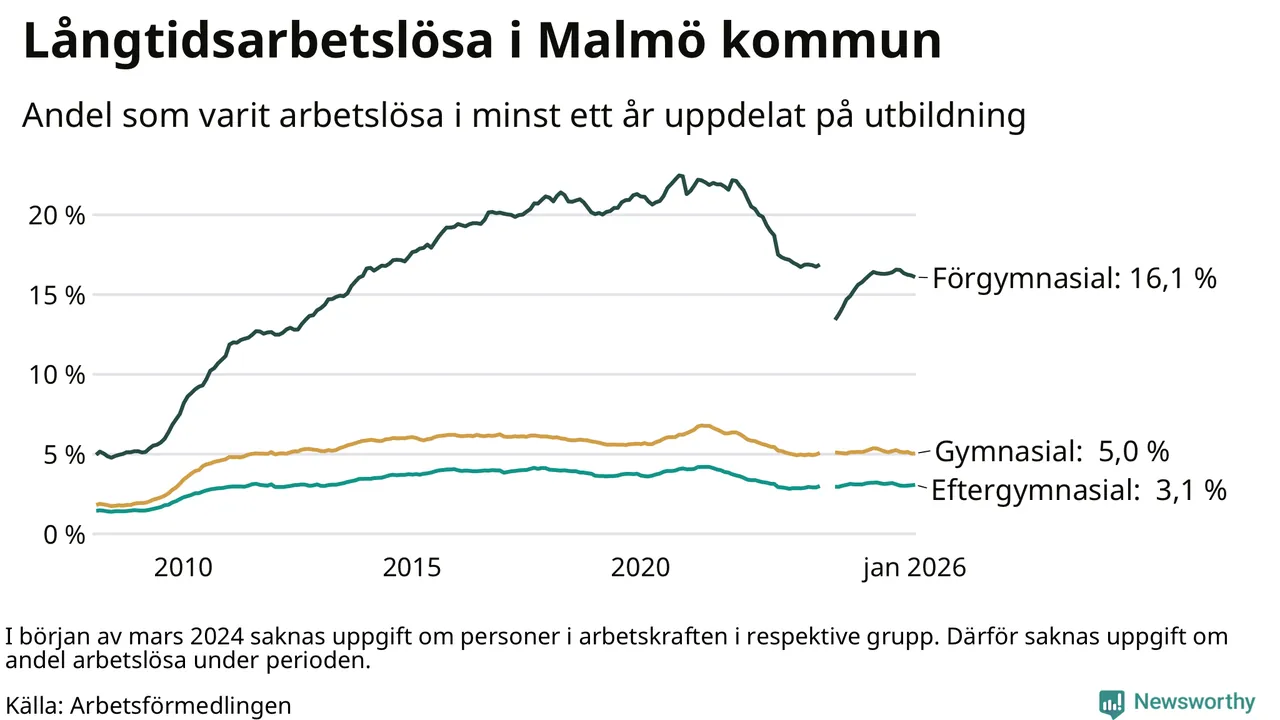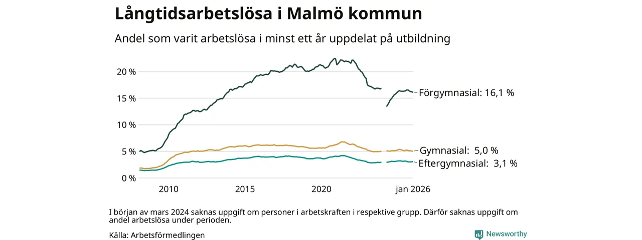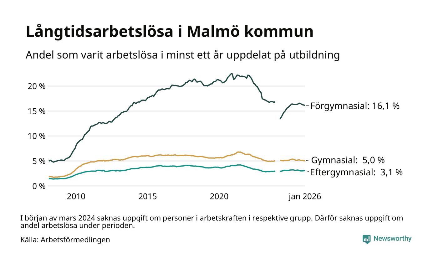 I januari hade 10 584 Malmöbor varit arbetslösa i minst ett år, vilket är 64 fler än månaden innan. 10 584 personer motsvarar 5,5 procent av arbetskraften i kommunen – andelen långtidsarbetslösa är 0,2 procentenheter lägre än samma månad för ett år sedan. Malmö kommun hade näst högst andel långtidsarbetslösa i landet i januari.