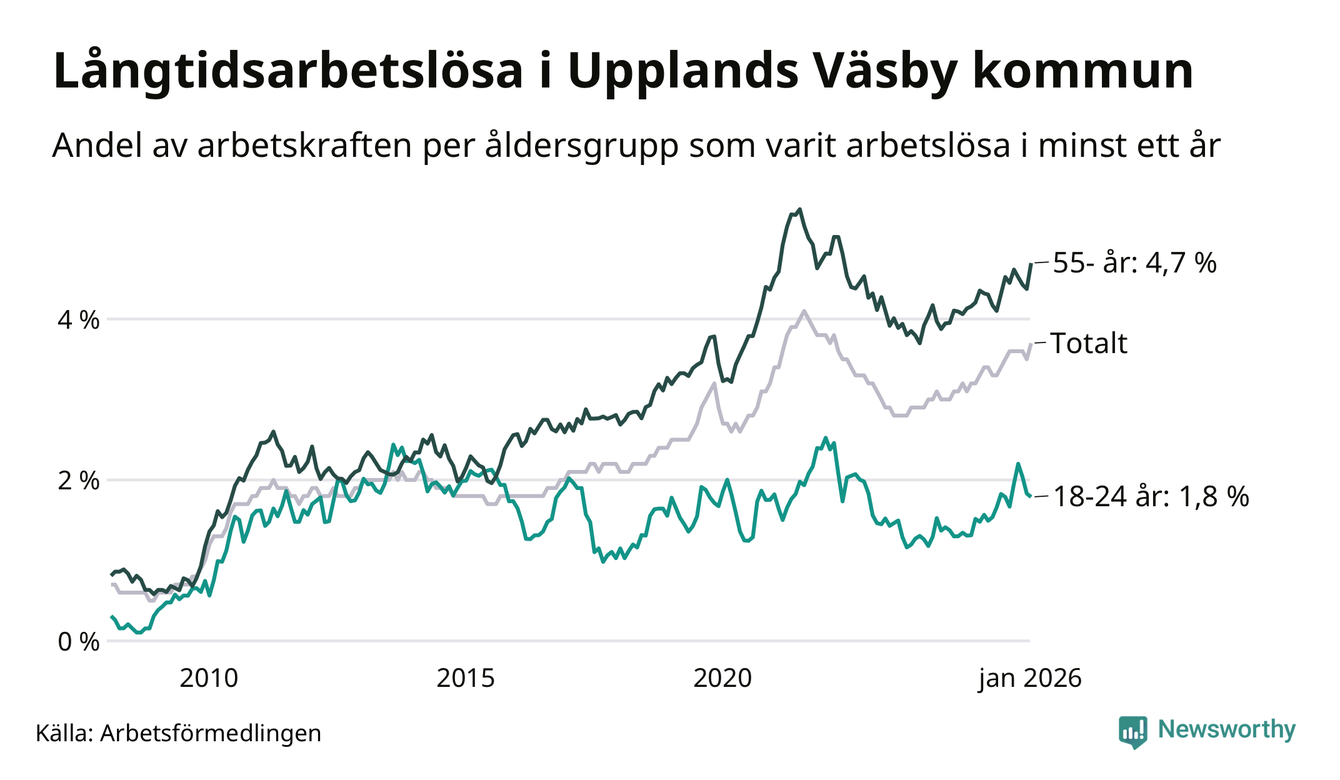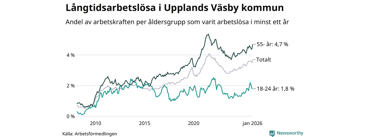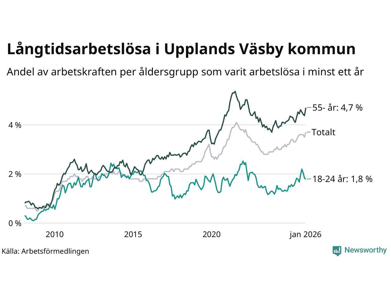 Av de 966 personerna som varit arbetslösa i mer än ett år i Upplands Väsby kommun är 239 personer mellan 55 och 661 år och 44 är mellan 18 och 24 år. För den äldre gruppen är andelen arbetslösa 4,7 procent medan den i den yngre gruppen är 1,8 procent. Även i riket som helhet är långtidsarbetslösheten högre i gruppen äldre.